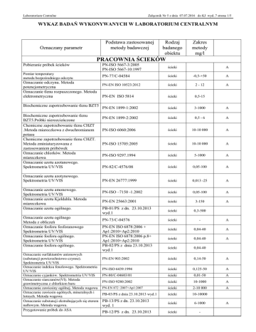 Załącznik Nr 5 z dnia 07.07.2016 do KJ wyd..7 strona 1/5 Laboratorium Centralne WYKAZ BADAŃ WYKONYWANYCH W LABORATORIUM CENTRALNYM Podstawa zastosowanej metody badawczej Oznaczany parametr Rodzaj badanego obiektu Zakres metody mg/l PRACOWNIA ŚCIEKÓW Pobieranie próbek ścieków Pomiar temperatury metoda bezpośredniego odczytu Oznaczanie odczynu. Metoda potencjometryczna Oznaczanie tlenu rozpuszczonego. Metoda elektrometryczna Biochemiczne zapotrzebowanie tlenu BZT5 Biochemiczne zapotrzebowanie tlenu BZT5.Próbki nierozcieńczone Chemiczne zapotrzebowanie tlenu CHZT .Metoda miareczkowa z dwuchromianem potasu Chemiczne zapotrzebowanie tlenu CHZT. Metoda zminiaturyzowana z zastosowaniem próbówek Oznaczanie chlorków. Metoda miareczkowa Oznaczanie azotu azotanowego. Spektrometria UV/VIS Oznaczanie azotu azotynowego. Spektrometria UV/VIS Oznaczanie azotu amonowego. Spektrometria UV/VIS Oznaczanie azotu Kjeldahla. Metoda miareczkowa Oznaczanie azotu ogólnego. Oznaczanie azotu ogólnego Metoda z obliczeń Oznaczanie fosforu fosforanowego Spektrometria UV/VIS Oznaczanie fosforu ogólnego. Spektrometria UV/VIS Oznaczanie fosforu ogólnego. Oznaczanie surfaktantów anionowych (substancji powierzchniowo-czynne). Spektrometria UV/VIS Oznaczanie indeksu fenolowego. Spektrometria UV/VIS Oznaczanie cyjanków. Spektrometria UV/VIS Oznaczanie siarczanów(VI). Metoda grawimetryczna z chlorkiem baru Oznaczanie zawiesiny ogólnej. Metoda wagowa Oznaczanie zawiesin ogólnych, mineralnych i lotnych. Metoda wagowa Oznaczanie substancji ekstrahujących się eterem naftowym. Metoda wagowa. Przygotowanie próbek do ASA PN-ISO 5667-3:2005 PN-ISO 5667-10:1997 ścieki PN-77/C-04584 ścieki -0,5-+50 A PN-EN ISO 10523:2012 ścieki 2 - 12 A PN-EN ISO 5814 ścieki 0,5-15 PN-EN 1899-1:2002 ścieki 3-1000 A PN-EN 1899-2:2002 ścieki 0,5 - 6 A PN-ISO 6060:2006 ścieki 10-10 000 A PN-ISO 15705:2005 ścieki 10-10 000 A PN-ISO 9297.1994 ścieki 5-1000 A PN-82/C-4576/08 ścieki 0,05-100 A PN-EN 26777:1999 ścieki 0,013 -25 A PN-ISO –7150 -1.2002 ścieki 0,05-100 A PN-EN 25663:2001 ścieki 3-150 A PB-01/PS z dn. 23.10.2013 wyd.1 ścieki 0,3-500 PN-73/C-04576 ścieki - A PN-EN ISO 6878:2006 + Ap1:2010+Ap2:2010 PN-EN ISO 6878:2006 p.8+ Ap1:2010+Ap2:2010 PB-02/PS z dnia 23.10.2013 wyd.1 ścieki 0,04-40 A ścieki 0,04-40 A ścieki 0,04-40 PN-EN 903:2002 ścieki 0,14-50 A PN-ISO 6439:1994 ścieki 0,125-50 A PN-80/C-04603/01 ścieki 0,01-50 A PN-ISO 9280:2002 ścieki 10-1000 A PN-EN 872 :2007+Ap1:2007 ścieki 2-10 000 A PB-03/PS z dnia 23.10.2013 wyd.1 ścieki 10-10000 PB-13/PS z dn. 23.10.2013 wyd. 1 ścieki 6-1000 PB-12/PS z dn. 23.10.2013 ścieki - A A Załącznik Nr 5 z dnia 07.07.2016 do KJ wyd..7 strona 2/5 Laboratorium Centralne wyd.1 Oznaczanie metali: Zn, Cu, Pb, Cd, Ni Atomowa spektrometria absorpcyjna (ASA) Oznaczanie chromu. Atomowa spektrometria absorpcyjna (ASA) Oznaczanie chromu sześciowartościowego. Spektrometria UV/VIS Oznaczanie żelaza. Atomowa spektrometria absorpcyjna (ASA) Oznaczanie żelaza Spektrometria UV/VIS Oznaczanie rodanków. Oznaczanie substancji ropopochodnych. Spektroskopia IR Pobieranie próbek osadów ściekowych. Oznaczanie odczynu w osadach ściekowych. Metoda elektrometryczna Oznaczanie azotu amonowego. Metoda miareczkowa. Oznaczanie fosforu ogólnego. Spektrometria UV/VIS Oznaczanie azotu ogólnego. Oznaczanie suchej pozostałości i zawartości wody. Metoda wagowa Oznaczanie pozostałości po prażeniu (min.) Oznaczenie strat przy prażeniu (org. ) .Metoda wagowa Oznaczanie zawiesin łatwoopadających . Pomiar w leju Imhoffa Oznaczanie indeksu osadu czynnego Oznaczanie metali: Zn, Cu, Pb, Cd, Ni, Cr. Atomowa spektrometria absorpcyjna (ASA) PN-ISO 8288 2002 ścieki Cu 0,01-20 Cd 0,01-20 Zn 0,02-20 Pb 0,02-20 Ni 0,02-20 PN-EN 1233:2000 ścieki 0,01-20 PN-77C-04604/08 PN-77C-04604/02 ścieki 0,01-20 PB-04/PS z dn. 23.10.2013 wyd.1 ścieki 0,01-20 PN-ISO 6332:2001 ścieki 0,5-50 PB-05/PS z dn. 23.10.2013 wyd.1 PB-06/PS z dn. 23.10.2013 wyd.1 ścieki 0,5-50 ścieki 0,05-100 PN-EN ISO 5667-13:2011, PN-EN ISO 5667-15:2004, osad - A PN-EN 12176:2004 osad 2-12 A PB-07/PS z dn. 23.10.2013 wyd.1 osad %s.m. PN-EN 14672:2006 osad %s.m. PB-08/PS z dn. 23.10.2013 wyd.1 osad %s.m. PN-EN 12880:2004 osad (0,1-99,9) %s.m. A PN-EN 12879:2004 osad (0,1-99,9) %s.m. A PN-72/C-04559/03 osad - PN-75/C-04616/03 osad Cu 5- 1200 mg/kg s.m. Zn 5- 5000 mg/kg s.m Pb 10- 1000 mg/kg s.m Cd 2- 1000 mg/kg s.m Ni 12- 1000 mg/kg s.m Cr 12- 1000 mg/kg s.m 1010000mg/kg s.m. PN-ISO 8288:2002 PN-EN 13346:2002 Oznaczanie żelaza. Atomowa spektrometria absorpcyjna PB-09/PS z dn. 23.10.2013 wyd.1 Oznaczanie wapnia i magnezu. Metoda miareczkowa. PB-10/PS z dn. 23.10.2013 wyd.1 PB-11/PS z dn. 23.10.2013 wyd.1 Oznaczanie lotnych kwasów i zasadowości osad osad osad % s.m. osad 10-5000 A A A A A A A A A A A A Załącznik Nr 5 z dnia 07.07.2016 do KJ wyd..7 strona 3/5 Laboratorium Centralne PRACOWNIA WODY Oznaczany parametr Pobieranie próbek do badań chemicznych i badań właściwości fizycznych Pomiar temperaturymetoda bezpośredniego odczytu Oznaczanie mętnościmetoda nefelometryczna Oznaczanie barwymetoda wizualna Oznaczanie barwy – met. spektrofotometryczna Oznaczanie odczynu pHmetoda potencjometryczna Oznaczanie utlenialności z KMnO₄ (indeks nadmanganianowy)metoda miareczkowa Oznaczanie absorbancji w 254 nmspektrometria UV- VIS Oznaczanie azotu amonowegospektrometria UV-VIS Oznaczanie jonu amonowego (z przeliczenia) Oznaczanie azotu azotynowegospektrometria UV-VIS Oznaczanie jonu azotynowego (z przeliczenia) Oznaczanie azotu azotanowegospektrometria UV-VIS Oznaczanie jonu azotanowego (z przeliczenia) Oznaczanie tlenu rozpuszczonego Oznaczanie żelaza ogólnego– spektrometria UV-VIS Oznaczanie przewodności elektrycznej właściwej- metoda konduktometryczna Oznaczanie sumarycznej zawartości wapnia i magnezu- metoda miareczkowa z EDTA Oznaczanie zasadowości ogólnej metoda miareczkowa Oznaczanie chlorkówmetoda m