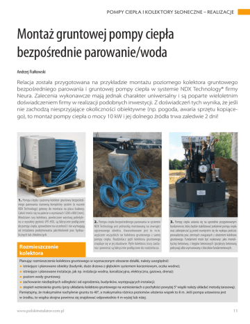 Pompy ciepła i kolektory słoneczne – realizacje Montaż gruntowej pompy ciepła bezpośrednie parowanie/woda Andrzej Fiałkowski Relacja została przygotowana na przykładzie montażu poziomego kolektora gruntowego bezpośredniego parowania i gruntowej pompy ciepła w systemie NDX Technology® firmy Neura. Zalecenia wykonawcze mają jednak charakter uniwersalny i są poparte wieloletnim doświadczeniem firmy w realizacji podobnych inwestycji. Z doświadczeń tych wynika, że jeśli nie zachodzą niesprzyjające okoliczności obiektywne (np. pogoda, awaria sprzętu kopiącego), to montaż pompy ciepła o mocy 10 kW i jej dolnego źródła trwa zaledwie 2 dni! 1. Pompa ciepła i poziomy kolektor gruntowy bezpośredniego parowania stanowią kompletny system (o nazwie NDX Technology) gotowy do montażu na placu budowy. Całość mieści się na palecie o wymiarach 1200 x 800 [mm]. Miedziane rury kolektora, powleczone warstwą polietylenu o wysokiej gęstości (PE-HD), są fabrycznie podłączone do pompy ciepła, sprawdzone na szczelność i nie wymagają od instalatora podejmowania jakichkolwiek prac hydraulicznych lub chłodniczych. Rozmieszczenie kolektora 2. Pompa ciepła bezpośredniego parowania w systemie NDX Technology jest jednostką montowaną na zewnątrz ogrzewanego obiektu. Uwarunkowane jest to m.in. wyjściem wszystkich rur kolektora gruntowego z samej pompy ciepła. Rozdzielacz pętli kolektora gruntowego znajduje się w jej obudowie. Pętle kolektora (rury zasilania i powrotu) są fabrycznie podłączone do rozdzielacza. 3. Pompę ciepła ustawia się na uprzednio przygotowanym fundamencie, który będzie stabilizować położenie pompy ciepła oraz zabezpieczać ją przed osunięciem się do wykopu podczas prowadzenia prac ziemnych związanych z ułożeniem kolektora gruntowego. Fundament może być wykonany: jako monolityczny betonowy, z kręgów betonowych (przykryty betonową pokrywą) albo wymurowany z bloczków fundamentowych. Planując rozmieszczenie kolektora gruntowego w wyznaczonym obszarze działki, należy uwzględnić: ⚫⚫istniejące i planowane obiekty (budynki, duże drzewa z głębokim systemem korzeniowym, oczka wodne); ⚫⚫istniejące i planowane instalacje, jak np. instalacja wodna, kanalizacyjna, elektryczna, gazowa, drenaż; ⚫⚫poziom wody gruntowej; ⚫⚫zachowanie niezbędnych odległości od ogrodzenia, budynków, występujących instalacji; ⚫⚫stopień wzniesienia gruntu (przy układaniu kolektora gruntowego na wzniesieniach o pochyłości powyżej 5° wiązki należy układać metodą tarasową). Pamiętajmy, że maksymalne nachylenie gruntu to 40°, a maksymalna różnica poziomów ułożenia wiązek to 8 m. Jeśli pompa ustawiona jest w środku, to wiązka skrajna powinna się znajdować odpowiednio 4 m wyżej lub niżej. www.polskiinstalator.com.pl 11 Pompy ciepła i kolektory słoneczne – realizacje 4. Pompę ciepła przymocowuje się do fundamentu śrubami – przez znajdujące się w niej uchwyty. Na fundamencie, pod pompą ciepła, trzeba jednak wcześniej położyć płytę polistyrenową grubości 5 cm, która zabezpieczy przed przenoszeniem się drgań na fundament oraz instalację c.o. 6. Teraz można przystąpić do prac związanych z ułożeniem pętli kolektora gruntowego. W zależności od warunków gruntowych oraz występujących ograniczeń (np. istniejące ogrodzenie działki, zabudowa terenu) pętle można rozkładać w wykopach przestrzennych, bądź w rowach przygotowanych pod pojedyncze wiązki. Pętle rozkłada się na głębokości 1,2-1,8 m, zależnie od strefy przemarzania gruntu. Generalnie obowiązuje zasada, że układa się je ok. 30 cm poniżej tej strefy. Rury kolektora bezpośredniego parowania w technologii NDX układa się w odstępach co 60-70 cm. Ponieważ są bardzo elastyczne, można je układać w wykopie o niemal dowolnym kształcie, niemniej jednak należy uważać, aby ich nie zagiąć. Wykonanie ciepłociągu 5. Prace ziemne związane z montażem kolektora gruntowego rozpoczyna się od wybrania ziemi w pobliżu fundamentu – zanim zostanie na nim posadowiona pompa ciepła. Po ustawieniu i zamocowaniu pompy należy zaizolować na odcinku ok. 2 m schodzące na dno wykopu rury zasilania i powrotu kolektora gruntowego. Zapobiegnie to zbytniemu przemrożeniu gruntu w miejscu, gdzie zbiegają się wszystkie pętle kolektora. 12 Pompę ciepła z węzłem cieplnym ogrzewanego budynku łączy się za pomocą ciepłociągu. Ciepłociąg można podzielić na część zewnętrzną (pompa ciepła – budynek) oraz część wewnętrzną (przepust przez ścianę fundamentową – węzeł cieplny). Ze względu na długość ciepłociągi zewnętrzne podzielono na te do 10 m – mogą być one montowane na budowie, oraz te powyżej 10 m, które muszą być preizolowane. Aby zminimalizować straty ciepła związane z przesyłem ciepła do budynku, pompę ciepła należy zlokalizować możliwie najbliżej przepustu ciepłociągu. Warto pamiętać, że przepust ciepłociągu nie musi się znajdować bezpośrednio w pomieszczeniu pełniącym funkcję kotłowni. Ponieważ część wewnętrzna ciepłociągu przebiega już w warstwie izolacji termicznej posadzki, przepust może być w dowolnym miejscu. Dzięki temu zyskuje się dużą swobodę przy wyborze lokalizacji pompy ciepła i kolektora gruntowego. Wykonując przepust do budynku, należy zwrócić uwagę na dobre uszczelnienie przejścia przez ścianę fundamentową. Numer Specjalny Polski Instalator 11/2013 Pompy ciepła i kolektory słoneczne – realizacje 8. Przy gruntach spoistych, jak iły lub glina, należy pamiętać o wykonaniu podsypki z piasku wokół rur kolektora gruntowego. Wystarczy warstwa 5-10 cm nad i pod rurami. Zapobiegnie to powstawaniu w przyszłości pustych przestrzeni wokół pętli kolektora, które pogarszają warunki przejmowania ciepła od gruntu. 7. Najszybciej wykonuje się prace wykorzystując np. specjalistyczną koparkę.