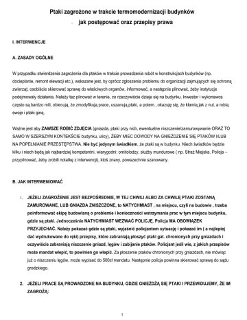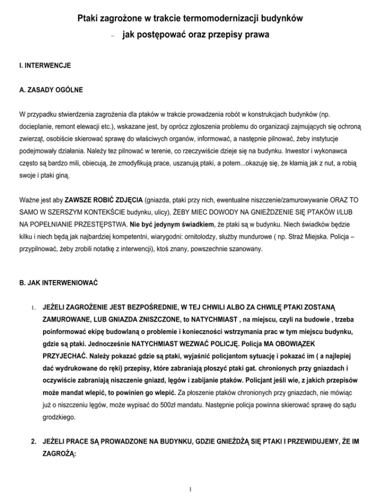 Ptaki zagrożone w trakcie termomodernizacji budynków − jak postępować oraz przepisy prawa I. INTERWENCJE A. ZASADY OGÓLNE W przypadku stwierdzenia zagrożenia dla ptaków w trakcie prowadzenia robót w konstrukcjach budynków (np. docieplanie, remont elewacji etc.), wskazane jest, by oprócz zgłoszenia problemu do organizacji zajmujących się ochroną zwierząt, osobiście skierować sprawę do właściwych organów, informować, a następnie pilnować, żeby instytucje podejmowały działania. Należy tez pilnować w terenie, co rzeczywiście dzieje się na budynku. Inwestor i wykonawca często są bardzo mili, obiecują, że zmodyfikują prace, uszanują ptaki, a potem...okazuję się, że kłamią jak z nut, a robią swoje i ptaki giną. Ważne jest aby ZAWSZE ROBIĆ ZDJĘCIA (gniazda, ptaki przy nich, ewentualne niszczenie/zamurowywanie ORAZ TO SAMO W SZERSZYM KONTEKŚCIE budynku, ulicy), ŻEBY MIEC DOWODY NA GNIEŻDZENIE SIĘ PTAKÓW I/LUB NA POPEŁNIANIE PRZESTĘPSTWA. Nie być jedynym świadkiem, że ptaki są w budynku. Niech świadków będzie kilku i niech będą jak najbardziej kompetentni, wiarygodni: ornitolodzy, służby mundurowe ( np. Straż Miejska. Policja – przypilnować, żeby zrobili notatkę z interwencji), ktoś znany, powszechnie szanowany. B. JAK INTERWENIOWAĆ 1. JEŻELI ZAGROŻENIE JEST BEZPOŚREDNIE, W TEJ CHWILI ALBO ZA CHWILĘ PTAKI ZOSTANĄ ZAMUROWANE, LUB GNIAZDA ZNISZCZONE, to NATYCHMIAST , na miejscu, czyli na budowie , trzeba poinformować ekipę budowlaną o problemie i konieczności wstrzymania prac w tym miejscu budynku, gdzie są ptaki. Jednocześnie NATYCHMIAST WEZWAĆ POLICJĘ. Policja MA OBOWIĄZEK PRZYJECHAĆ. Należy pokazać gdzie są ptaki, wyjaśnić policjantom sytuację i pokazać im ( a najlepiej dać wydrukowane do ręki) przepisy, które zabraniają płoszyć ptaki gat. chronionych przy gniazdach i oczywiście zabraniają niszczenie gniazd, lęgów i zabijanie ptaków. Policjant jeśli wie, z jakich przepisów może mandat wlepić, to powinien go wlepić. Za płoszenie ptaków chronionych przy gniazdach, nie mówiąc już o niszczeniu lęgów, może wypisać do 500zł mandatu. Następnie policja powinna skierować sprawę do sądu grodzkiego. 2. JEŻELI PRACE SĄ PROWADZONE NA BUDYNKU, GDZIE GNIEŻDŻĄ SIĘ PTAKI I PRZEWIDUJEMY, ŻE IM ZAGROŻĄ: 1 A. Poinformować (najlepiej osobiście i tą samą informację mieć na piśmie, które należy złożyć u danej osoby i wziąć potwierdzenie odbioru z podpisem na kopii, lub listownie za potwierdzeniem odbioru lub poleconym): − inwestora, czyli np. spółdzielnię, i/lub administrację nieruchomości o ptakach w budynku i przepisach, żeby potem nie mogli powiedzieć, że nie wiedzieli. Tą informację trzeba też wysłać/złożyć do wiadomości do: − inspektora nadzoru inwestorskiego, tj. osoby nadzorującej prace ze strony np. administracji osiedla (nazwisko oraz numer telefonu powinny się znajdować na tablicy umieszczonej na terenie robót). Należy przekazać pismo także kierownikowi/brygadziście. − Regionalnej Dyrekcji Ochrony Środowiska, − Wydziału Ochrony Środowiska dzielnicy lub gminy − lokalnej organizację zajmującą się ochroną ptaków, lub chociaż ogólnie pojętej przyrody. Może działa w okolicy np. lokalna grupa Ogólnopolskiego Towarzystwa Ochrony Ptaków? Może jest oddział Straży dla Zwierząt? B. Jeżeli poinformowana ekipa, inspektor nadzoru, inwestor nie chcą uszanować ptaków i zmodyfikować przebiegu prac należy wezwać Straż Miejską (najlepiej Patrol Ekologiczny) i Policję (najlepiej zgłosić dzielnicowemu – dane kontaktowe powinny się znajdować na tablicy informacyjnej wywieszonej na klatce schodowej). Patrolowi należy dokładnie wyjaśnić gdzie są i jak są zagrożone ptaki, oraz to, że są pod ochroną. Trzeba też podać funkcjonariuszom podstawę prawną (najlepiej dać wydrukowane przepisy do ręki). W razie gdyby ptaki były zamurowane np. w stropodachu, to podpowiedzieć, że funkcjonariusze mogą ptaki zagrożone śmiercią uwolnić powołując się na sytuację WYŻSZEJ KONIECZNOŚCI (były już takie przypadki). Poinformować prasę i inne media (bardzo skuteczne). Ponownie poinformować telefonicznie i pisemnie (dostarczyć osobiście lub poleconym) Wydział Ochrony Środowiska danej gminy/dzielnicy i Regionalną Dyrekcję Ochrony Środowiska o zagrożeniu ptaków w budynku. Zażądać przeprowadzenia wizji lokalnej przez inspektora. W razie, gdybyśmy uznali, że trzeba zatrzymać prace ociepleniowe, to informujemy pisemnie (powołując się na konkretne przepisy prawa) powiatowego inspektora nadzoru budowlanego. Dobrze jest też przeprowadzić rozmowę telefoniczną z właściwym inspektorem z PINB i wyjaśnić mu dokładnie i rzeczowo sytuację. 2 Trzeba cały czas „trzymać rękę na pulsie”, tzn. Pilnować co zrobiły poszczególne urzędy w danej sprawie, dzwonić, pytać, interesować się - bo wtedy szybkość i skuteczność całej akcji znaczenie wzrasta, a w przypadku uwięzionych w budynkach ptaków czas gra decydującą rolę. II. PRZEPISY PRAWNE CHRONIĄCE PTAKI W BUDYNKACH – WYCIĄG wszystkie akty prawne dostępne są tu: http://isap.sejm.gov.pl/search.jsp Przystępując do jakichkolwiek prac budowlanych lub remontowych, należy pamiętać, o przepisach prawa chroniących ptaki w budynkach. Mają tu zastosowanie następujące przepisy: Rozporządzenie Ministra Środowiska z dnia 28 września 2004 r. w sprawie gatunków dziko występujących zwierząt objętych ochroną (Dz. U. nr 220, poz.2237) Ustawa o ochronie przyrody z dn. 16 kwietnia 2004 (Dz. U. 2009 nr 151, poz. 1220 ze zm.) Ustawa o ochronie zwierząt z dn. 21 sierpnia 1997 (Dz. U. 2003 nr 106, poz. 1002 ze zm.) Ustawa prawo budowlane z dnia 7 lipca 1994 (Dz. U. 2006 nr 156, poz. 118 ze zm.). ad 1. Rozporządzenie Ministra Środowiska z dnia 28 września 2004 r. w sprawie gatunków dziko występujących zwierząt objętych 