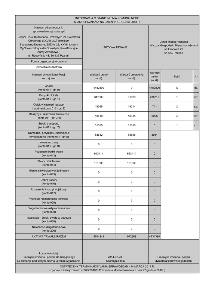 INFORMACJA O STANIE MIENIA KOMUNALNEGO MIASTA POZNANIA NA DZIEŃ 31 GRUDNIA 2013 R. Nazwa i adres jednostki sprawozdawczej - pieczęć Zespół Szkół Budowlano-Drzewnych im. Bolesława Chrobrego (XXVIII LO,Technikum Budowlano-Drzewne, ZSZ Nr 28, XXVIII Liceum Ogólnokształcące dla Dorosłych, Kwalifikacyjne Kursy Zawodowe ) ul. Raszyńska 48, 60-135 Poznań Urząd Miasta Poznania Wydział Gospodarki Nieruchomościami ul. Gronowa 20 61-655 Poznań AKTYWA TRWAŁE Forma organizacyjno-prawna jednostka budżetowa Nazwa i symbol klasyfikacji rodzajowej Wartość brutto (w zł) Wartość umorzenia (w zł) Wartość netto (w zł) Ilość Jm Grunty (konto 011 - gr. 0) 4482800 0 4482800 17 dz. Budynki i lokale (konto 011 - gr. 1) 317639 81929 235710 1 szt. Obiekty inżynierii lądowej i wodnej (konto 011 - gr. 2) 19055 18314 741 2 szt. Maszyny i urządzenia techniczne (konto 011 - gr. 3-6) 19410 10315 9095 4 szt. Środki transportu (konto 011 - gr. 7) 31350 31350 0 1 szt. Narzędzia, przyrządy, ruchomości i wyposażenie (konto 011 - gr. 8) 58642 55608 3034 Inwentarz żywy (konto 011 - gr. 9) 0 0 0 Pozostałe środki trwałe (konto 013) 613414 613414 0 Zbiory biblioteczne (konto 014) 161939 161939 0 Mienie zlikwidowanych jednostek (konto 015) 0 0 0 Dobra kultury (konto 016) 0 0 0 Uzbrojenie i sprzęt wojskowy (konto 017) 0 0 0 Wartości niematerialne i prawne (konto 020) 0 0 0 Długoterminowe aktywa finansowe (konto 030) 0 0 0 Inwestycje - środki trwałe w budowie (konto 080) 0 0 0 Należności długoterminowe (konto 226) 0 0 0 AKTYWA TRWAŁE RAZEM 5704249 972869 4731380 Łucja Kołodziej Pieczątka imienna i podpis Gł. Księgowego Nr telefonu, pod którym można uzyskać wyjaśnienia 2014-02-28 Sporządził dnia Pieczątka imienna i podpis dyrektora/kierownika jednostki OSTATECZNY TERMIN NADSYŁANIA SPRAWOZDAŃ - 14 MARCA 2014 R. (zgodnie z Zarządzeniem nr 975/2010/P Prezydenta Miasta Poznania z dnia 27 grudnia 2010r.) INFORMACJA O STANIE MIENIA KOMUNALNEGO MIASTA POZNANIA NA DZIEŃ 31 GRUDNIA 2013 R. Nazwa i adres jednostki sprawozdawczej - pieczęć Zespół Szkół Budowlano-Drzewnych im. Bolesława Chrobrego (XXVIII LO,Technikum Budowlano-Drzewne, ZSZ Nr 28, XXVIII Liceum Ogólnokształcące dla Dorosłych, Kwalifikacyjne Kursy Zawodowe ) ul. Raszyńska 48, 60-135 Poznań AKTYWA OBROTOWE (wartość składników majątkowych będących własnością Miasta Poznania, na stanie miejskich jednostek organizacyjnych i komunalnych osób prawnych) Urząd Miasta Poznania Wydział Gospodarki Nieruchomościami ul. Gronowa 20 61-655 Poznań Nazwa dla pozycji 1-5 Wartość (w zł) 1. Zapasy 9715 2. Należności krótkoterminowe 170113 3. Środki pieniężne (suma 3.1+3.2+3.3) 66749 3.1 Środki pieniężne w kasie 0 3.2 Środki pieniężne na rachunkach bankowych 66749 3.3 Środki pieniężne - inne 0 4. Krótkoterminowe papiery wartościowe 0 5. Rozliczenia międzyokresowe 0 AKTYWA OBROTOWE RAZEM 246577 Aktywa trwałe netto 4731380 Aktywa obrotowe 246577 SUMA AKTYWÓW 4977957 Łucja Kołodziej Pieczątka imienna i podpis Gł. Księgowego Nr telefonu, pod którym można uzyskać wyjaśnienia 2014-02-28 Sporządził dnia Pieczątka imienna i podpis dyrektora/kierownika jednostki OSTATECZNY TERMIN NADSYŁANIA SPRAWOZDAŃ - 14 MARCA 2014 R. (zgodnie z Zarządzeniem nr 975/2010/P Prezydenta Miasta Poznania z dnia 27 grudnia 2010r.) Nazwa i adres jednostki sprawozdawczej (wraz z pieczecią) Zespół Szkół Budowlano-Drzewnych im. Bolesława Chrobrego (XXVIII LO,Technikum Budowlano-Drzewne, ZSZ Nr 28, XXVIII Liceum Ogólnokształcące dla Dorosłych, Kwalifikacyjne Kursy Zawodowe ) ul. Raszyńska 48, 60-135 Poznań INFORMACJA O STANIE MIENIA KOMUNALNEGO MIASTA POZNANIA NA DZIEŃ 31 GRUDNIA 2013 R. WYJAŚNIENIA ZMIAN WARTOŚCI MAJĄTKU (Aktywa trwałe) Urząd Miasta Poznania Wydział Gospodarki Nieruchomościami ul. Gronowa 20 61-655 Poznań Wyszczególnienie Wartość brutto wg stanu na 2012-12-31 r. [w zł] Wartość brutto wg stanu na 2013-12-31 r. [w zł] Wyjaśnienia zmian (zmniejszenia, zwiększenia) Grunty (konto 011 - gr. 0) 4482800 4482800 Bez zmian. Budynki i lokale (konto 011 - gr. 1) 317639 317639 Bez zmian. Obiekty inżynierii lądowej i wodnej (konto 011 - gr. 2) 19055 19055 Bez zmian. Maszyny i urządzenia techniczne (konto 011 - gr. 3-6) 19410 19410 Bez zmian. Środki transportu (konto 011 - gr. 7) 31350 31350 Bez zmian. Narzędzia, przyrządy, ruchomości i wyposażenie (konto 011 - gr. 8) 63642 58642 Likwidacja środka trwałego. Inwentarz żywy (konto 011 - gr. 9) 0 0 Bez zmian. Pozostałe środki trwałe (konto 013) 612601 613414 Zakup sprzętu komputerowego, likwidacja zużytego sprzętu. Zbiory biblioteczne (konto 014) 125755 161939 Zakup książek, podręczników, pomocy dydaktycznych. Mienie zlikwidowanych jednostek (konto 015) 0 0 Bez zmian. Dobra kultury (konto 016) 0 0 Bez zmian. Uzbrojenie i sprzęt wojskowy (konto 017) 0 0 Bez zmian. Wartości niematerialne i prawne (konto 020) 0 0 Bez zmian. Długoterminowe aktywa finansowe (konto 030) 0 0 Bez zmian. Inwestycje - środki trwałe w budowie (konto 080) 0 0 Bez zmian. Należności długoterminowe (konto 226) 0 0 Bez zmian. RAZEM 5672252 5704249 Łucja Kołodziej Pieczątka imienna i podpis Gł. Księgowego Nr telefonu, pod którym można uzyskać wyjaśnienia 2014-02-28 Sporządził dnia Pieczątka imienna i podpis dyrektora/kierownika jednostki