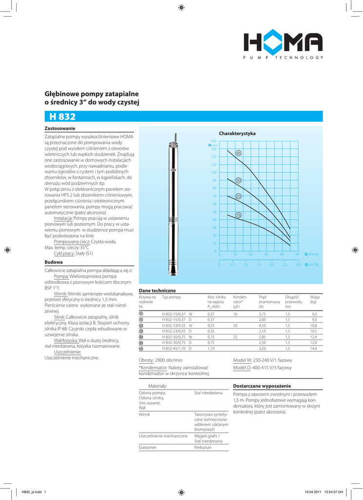 Głębinowe pompy zatapialne o średnicy 3“ do wody czystej H 832 Zastosowanie Charakterystyka Zatapialne pompy wysokociśnieniowe HOMA są przeznaczone do pompowania wody czystej pod wysokim ciśnieniem z otworów wiertniczych lub wąskich studzienek. Znajdują one zastosowanie w domowych instalacjach wodociągowych, przy nawadnianiu, podlewaniu ogrodów z cystern i tym podobnych zbiorników, w fontannach, w kąpieliskach, do drenażu wód podziemnych itp. W połączeniu z elektronicznym panelem sterowania HPS 2 lub zbiornikiem ciśnieniowym, przełącznikiem ciśnienia i elektronicznym panelem sterowania, pompy mogą pracować automatycznie (patrz akcesoria). Instalacja: Pompy pracują w ustawieniu pionowym lub poziomym. Do pracy w ustawieniu pionowym w studzience pompa musi być podwieszona na linie. Pompowana ciecz: Czysta woda. Max. temp. cieczy 35°C Cykl pracy: Stały (S1) ��� ������ ��� ��� ��� �� �� �� �� �� �� �� �� �� �� �� �� � Budowa Całkowicie zatapialna pompa składająca się z: Pompa: Wielostopniowa pompa odśrodkowa z pionowym króćcem tłocznym BSP 1” F. Wirnik: Wirniki zamknięte wielokanałowe, prześwit sferyczny o średnicy 1,5 mm. Pierścienie cierne wykonane ze stali nierdzewnej. Silnik: Całkowicie zatapialny, silnik elektryczny. Klasa izolacji B. Stopień ochrony silnika IP 68. Czujniki ciepła wbudowane w uzwojenie silnika. Wał/łożyska: Wał o dużej średnicy, stal nierdzewna, łożyska nasmarowane. Uszczelnienie: Uszczelnienie mechaniczne. �� ��� � � ��� �� ��� �� ��� �� ��� ��� �� ��������� ��� �������� Dane techniczne Krzywa na wykresie Nr. Typ pompy H 832-15/0,37 H 832-15/0,37 H 832-23/0,55 H 832-23/0,55 H 832-30/0,75 H 832-30/0,75 H 832-45/1,10 W D W D W D D Moc silnika na wyjściu P2 (kW) Kondensator* (µF) Prąd znamionowy (A) Długość przewodu (m) Waga (kg) 0,37 0,37 0,55 0,55 0,75 0,75 1,10 16 3,75 2,00 4,50 2,10 5,85 2,50 3,20 1,5 1,5 1,5 1,5 1,5 1,5 1,5 9,3 9,3 10,8 10,5 12,4 12,0 14,4 Obroty: 2900 obr/min *Kondensator: Należy zainstalować kondensator w skrzynce kontrolnej. Uszczelnienie mechaniczne Elastomer 20 25 Model W: 230-240 V/1 fazowy Model D: 400-415 V/3 fazowy Dostarczane wyposażenie Materiały: Osłona pompy, Osłona silnika, Sito ssawne, Wał Wirnik H832_pl.indd 1 �� Stal nierdzewna Tworzywo syntetyczne wzmocnione włóknem szklanym (kompozyt) Węgiel-grafit / Stal nierdzewna Perbunan Pompa z zaworem zwrotnym i przewodem 1,5 m. Pompy jednofazowe wymagają kondensatora, który jest zamontowany w skrzyni kontrolnej (patrz akcesoria). 19.04.2011 13:54:37 Uhr Wymiary Akcesoria i urządzenia dodatkowe Domowe instalacje wodociągowe z elektroniczną skrzynką kontrolną HPS 2 (tylko dla 1-fazowych pomp) Domowe instalacje wodociągowe ze zbiornikiem membranowym 1PH BSP 1" F 18 3PH 19 11 17 17 12 8 H1 3 8 3 4 1 4 9 10 1 16 15 H3 5 6 6 7 7 2 5 2 H2 14 13 Typ pompy H 832-15/0,37 H1 W 580 H2 371 H3 Opis Części Wymiary Numer części Opis Części 951 Ocynkowana rura, w m BSP 1“F Elektroda uziemiająca Łączniki żeliwne, Stal ocynkowana Rura PE-HD, polietylen Złącze kompozytowe Zawór zwrotny- brąz Złącza ocynkowana, Stal ocynkowana Zasuwa kołnierzowa Lina – stal nierdzewna Kabel ogumowany na m Tuleja złączna Zacisk Manometr Manometr z wyższymi parametrami Wyłącznik ciśnieniowy 0,5 – 11 bar Wyłącznik ciśnieniowy z wyższymi parametrami Zbiornik membranowy Skrzynka kontrolna HPS2 sterująca pompą i zapezpieczająca przed suchobiegiem, max. ciśnienie 10bar H 832-15/0,37 D 580 371 951 H 832-23/0,55 W 780 371 1151 H 832-23/0,55 D 780 371 1151 H 832-30/0,75 W 1000 391 1391 H 832-30/0,75 D 1000 391 1391 H 832-45/1,10 D 1380 410 1790 Wszystkie wymiary podano w mm 2100150 BSP 1“F Na życzenie Na życzenie Na życzenie 2211113 BSP 1“F BSP 1“F 4,0 mm 2114303 2216010 Na życzenie 4G1,5 1041541 1124030 Na życzenie 8503240 BSP 1“F BSP 1/4“ M Na życzenie BSP 1/4“ M 1254011 Na życzenie Na życzenie BSP 1“M Wymiary Numer części Elektroda OFF Elektroda ON Elektroda, za mb Jednofazowy panel kontrolny z obudową IP54, zabezpieczeniem silnika, 0,37 kW kondensatorem, 0,55 kW stycznikiem 0,75 kW Jednofazowe zabezpieczenie przed suchobiegiem z obudową IP54, 3 elektrody, przekaźniki, 0,55 kW wtyk, bez kabli elektrod 0,75 kW Trójfazowy panel kontrolny z obudową IP54, zabezpieczeniem silnika, 2,5 A kablem i wtyczką CEE 4,4 A Lub Trójfazowy panel kontrolny z kompozytową obudową IP54, zabezpieczeniem silnika termicznym i przed suchobiegiem, wyłącznikiem, 2,4 A wtykiem, bez kabli elektrod 4,0 A 1468560 TIGA PUMPS Sp. z o.o. Polska, 60 - 144 Poznań, ul. Kordeckiego 30B tel.: + 48 61 84 20 790; fax: + 48 61 84 20 791 e-mail: [email protected]; www.tigapumps.pl HOMA Pumpenfabrik GmbH P.O. Box 22 63, D-53814 Neunk.-Seelscheid Tel. +49(0)22 47/702-0, Fax +49(0)22 47/702-44 e-mail: [email protected] www.homapumps.com 1610992 1610992 1610992 1041207 1921000 1921002 1921003 1921030 1921032 1926015 1926020 1921072 1921074 3.0/0411 (TIGA) 001 jes / No. 0031060 PL 0,3 m 0,3 m Ø 72 Zastrzegamy sobie prawo do zmiany naszych specyfikacji bez powiadomienia H832_pl.indd 2 19.04.2011 13:54:40 Uhr