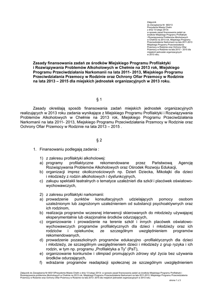 Załącznik do Zarządzenia Nr 683/13 Prezydenta Miasta Chełm z dnia 13 lutego 2013r. w sprawie zasad finansowania zadań ze środków Miejskiego Programu Profilaktyki i Rozwiązywania Problemów Alkoholowych w Chełmie na 2013 rok, Miejskiego Programu Przeciwdziałania Narkomanii na lata 2011-2013 Miejskiego Programu Przeciwdziałania Przemocy w Rodzinie oraz Ochrony Ofiar Przemocy w Rodzinie na lata 2013 – 2015 dla miejskich jednostek organizacyjnych w 2013 roku. Zasady finansowania zadań ze środków Miejskiego Programu Profilaktyki i Rozwiązywania Problemów Alkoholowych w Chełmie na 2013 rok, Miejskiego Programu Przeciwdziałania Narkomanii na lata 2011- 2013, Miejskiego Programu Przeciwdziałania Przemocy w Rodzinie oraz Ochrony Ofiar Przemocy w Rodzinie na lata 2013 – 2015 dla miejskich jednostek organizacyjnych w 2013 roku. §1 Zasady określają sposób finansowania zadań miejskich jednostek organizacyjnych realizujących w 2013 roku zadania wynikające z Miejskiego Programu Profilaktyki i Rozwiązywania Problemów Alkoholowych w Chełmie na 2013 rok, Miejskiego Programu Przeciwdziałania Narkomanii na lata 2011- 2013, Miejskiego Programu Przeciwdziałania Przemocy w Rodzinie oraz Ochrony Ofiar Przemocy w Rodzinie na lata 2013 – 2015 . §2 1. Finansowaniu podlegają zadania : 1) z zakresu profilaktyki alkoholowej: a) programy profilaktyczne rekomendowane przez Państwową Agencję Rozwiązywania Problemów Alkoholowych oraz Ośrodek Rozwoju Edukacji, b) organizacji imprez okolicznościowych np. Dzień Dziecka, Mikołajki dla dzieci i młodzieży z rodzin alkoholowych i dysfunkcyjnych, c) zakupu spektakli teatralnych o tematyce uzależnień dla szkół i placówek oświatowowychowawczych, 2) z zakresu profilaktyki narkomanii: a) prowadzenie punktów konsultacyjnych udzielających pomocy osobom uzależnionym lub zagrożonym uzależnieniem od substancji psychoaktywnych oraz ich rodzinom, b) realizacja programów wczesnej interwencji skierowanych do młodzieży używającej eksperymentalnie lub okazjonalnie środków odurzających, c) organizowanie i prowadzenie na terenie szkół i innych placówek oświatowowychowawczych programów profilaktycznych dla dzieci i młodzieży oraz ich rodziców i opiekunów, ze szczególnym uwzględnieniem programów rekomendowanych, d) prowadzenie pozaszkolnych programów edukacyjno -profilaktycznych dla dzieci i młodzieży, ze szczególnym uwzględnieniem dzieci i młodzieży z grup ryzyka i ich rodzin, w tym np. programu „Profilaktyka a Ty” (PaT), e) organizowanie konkursów i olimpiad promujących zdrowy styl życia bez używania środków odurzających, f) wdrażanie programów readaptacji społecznej ze szczególnym uwzględnieniem Załącznik do Zarządzenia Nr 683/13Prezydenta Miasta Chełm z dnia 13 lutego 2013r. w sprawie zasad finansowania zadań ze środków Miejskiego Programu Profilaktyki i Rozwiązywania problemów Alkoholowych w Chełmie na 2013 rok, Miejskiego Programu Przeciwdziałania Narkomanii na lata 2011-2013, Miejskiego Programu Przeciwdziałania Przemocy w Rodzinie oraz Ochrony Ofiar Przemocy w Rodzinie na lata 2013- 2015 dla miejskich jednostek organizacyjnych w 2013 roku strona 1 z 3 osób uzależnionych od narkotyków,korzystających długotrwale ze świadczeń pomocy społecznej, g) realizacja programów readaptacji zawodowej dla osób uzależnionych od narkotyków po zakończonym programie terapeutycznym w podmiocie leczniczym. 3) z zakresu przeciwdziałania przemocy w rodzinie oraz ochrony ofiar przemocy w rodzinie: a) organizowanie i prowadzenie na terenie szkół i placówek oświatowowychowawczych programów profilaktyki agresji i przemocy dla dzieci i młodzieży. 4. W pierwszej kolejności finansowane będzie realizowanie rekomendowanych programów profilaktycznych. §3 Środki finansowe na realizację zadań pochodzą ze środków finansowych przeznaczonych w 2013 roku na realizację Miejskiego Programu Profilaktyki i Rozwiązywania Problemów Alkoholowych w Chełmie na 2013 rok, Miejskiego Programu Przeciwdziałania Narkomanii na lata 2011-2013 oraz Miejskiego Programu Przeciwdziałania Przemocy w Rodzinie oraz Ochrony Ofiar Przemocy w Rodzinie na lata 2013 – 2015 i określonych w uchwale budżetowej. §4 1. Miejskie jednostki organizacyjne ubiegające się o finansowanie zadania składają pisemny wniosek do Prezydenta Miasta Chełm do dnia 5.go każdego miesiąca. 2. Wzór wniosku stanowi załącznik nr 1 do niniejszych zasad. §5 Wnioski będą rozpatrywane nie częściej niż raz w miesiącu wg kolejności wpływu, do chwili wyczerpania przewidzianych na ten cel środków o których mowa w § 3. §6 Wnioski o finansowanie zadań rozpatruje Zespół powołany przez Prezydenta Miasta Chełm odrębnym zarządzeniem. §7 Po rozpatrzeniu wniosku o finansowanie zadań przez Zespół i zaakceptowaniu przez Prezydenta Miasta Chełm, miejskie jednostki organizacyjne zostaną poinformowane o wysokości otrzymanych środków finansowych, zaś instytucje kultury o wysokości dotacji celowej. §8 1. Przekazanie środków finansowych miejskiej jednostce organizacyjnej następuje po wprowadzeniu zmian do budżetu Miasta Chełm, a w przypadku instytucji kultury po wprowadzeniu zmian do budżetu Miasta Chełm i zawarciu umowy. 2. Realizacja i finansowanie zadań winna następować po wykonaniu czynności o których mowa w ust.1. 3. Miejska jednostka organizacyjna może dokonywać przesunięć środków pomiędzy poszczególnymi rodzajami wydatków w ramach jednego paragrafu bez konieczności akceptacji Dyrektora Wydziału Spraw Społecznych Urzędu Miasta Chełm. Załącznik do Zarządzenia Nr 683/13Prezydenta Miasta Chełm z dnia 13 lutego 2013r. w sprawie zasad finansowania zadań ze środków Miejskiego Programu Profilaktyki i Rozwiązywania problemów Alkoholowych w Chełmie na 2013 rok, Miejskiego Programu Przeciwdziałania Narkomanii na lata 2011-2013, Miejskiego Programu Przeciwdziałania Przemocy w R