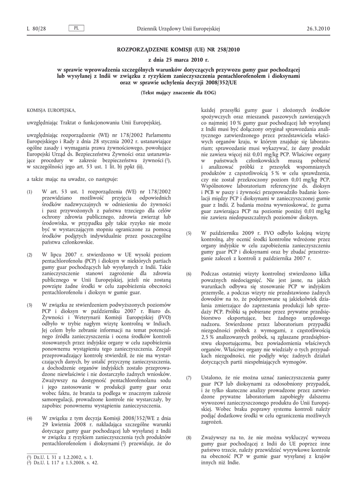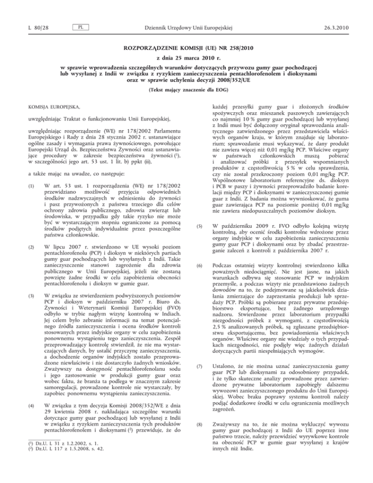 L 80/28 PL Dziennik Urzędowy Unii Europejskiej 26.3.2010 ROZPORZĄDZENIE KOMISJI (UE) NR 258/2010 z dnia 25 marca 2010 r. w sprawie wprowadzenia szczególnych warunków dotyczących przywozu gumy guar pochodzącej lub wysyłanej z Indii w związku z ryzykiem zanieczyszczenia pentachlorofenolem i dioksynami oraz w sprawie uchylenia decyzji 2008/352/UE (Tekst mający znaczenie dla EOG) każdej przesyłki gumy guar i złożonych środków spożywczych oraz mieszanek paszowych zawierających co najmniej 10 % gumy guar pochodzącej lub wysyłanej z Indii musi być dołączony oryginał sprawozdania anali tycznego zatwierdzonego przez przedstawiciela właści wych organów kraju, w którym znajduje się laborato rium; sprawozdanie musi wykazywać, że dany produkt nie zawiera więcej niż 0,01 mg/kg PCP. Właściwe organy w państwach członkowskich muszą pobierać i analizować próbki z przesyłek wspomnianych produktów z częstotliwością 5 % w celu sprawdzenia, czy nie został przekroczony poziom 0,01 mg/kg PCP. Wspólnotowe laboratorium referencyjne ds. dioksyn i PCB w paszy i żywności przeprowadziło badanie kore lacji między PCP i dioksynami w zanieczyszczonej gumie guar z Indii. Z badania można wywnioskować, że guma guar zawierająca PCP na poziomie poniżej 0,01 mg/kg nie zawiera niedopuszczalnych poziomów dioksyn. KOMISJA EUROPEJSKA, uwzględniając Traktat o funkcjonowaniu Unii Europejskiej, uwzględniając rozporządzenie (WE) nr 178/2002 Parlamentu Europejskiego i Rady z dnia 28 stycznia 2002 r. ustanawiające ogólne zasady i wymagania prawa żywnościowego, powołujące Europejski Urząd ds. Bezpieczeństwa Żywności oraz ustanawia jące procedury w zakresie bezpieczeństwa żywności (1), w szczególności jego art. 53 ust. 1 lit. b) ppkt (ii), a także mając na uwadze, co następuje: (1) (2) (3) (4) W art. 53 ust. 1 rozporządzenia (WE) nr 178/2002 przewidziano możliwość przyjęcia odpowiednich środków nadzwyczajnych w odniesieniu do żywności i pasz przywożonych z państwa trzeciego dla celów ochrony zdrowia publicznego, zdrowia zwierząt lub środowiska, w przypadku gdy takie ryzyko nie może być w wystarczającym stopniu ograniczone za pomocą środków podjętych indywidualnie przez poszczególne państwa członkowskie. W lipcu 2007 r. stwierdzono w UE wysoki poziom pentachlorofenolu (PCP) i dioksyn w niektórych partiach gumy guar pochodzących lub wysyłanych z Indii. Takie zanieczyszczenie stanowi zagrożenie dla zdrowia publicznego w Unii Europejskiej, jeżeli nie zostaną powzięte żadne środki w celu zapobieżenia obecności pentachlorofenolu i dioksyn w gumie guar. W związku ze stwierdzeniem podwyższonych poziomów PCP i dioksyn w październiku 2007 r. Biuro ds. Żywności i Weterynarii Komisji Europejskiej (FVO) odbyło w trybie nagłym wizytę kontrolną w Indiach. Jej celem było zebranie informacji na temat potencjal nego źródła zanieczyszczenia i ocena środków kontroli stosowanych przez indyjskie organy w celu zapobieżenia ponownemu wystąpieniu tego zanieczyszczenia. Zespół przeprowadzający kontrolę stwierdził, że nie ma wystar czających danych, by ustalić przyczynę zanieczyszczenia, a dochodzenie organów indyjskich zostało przeprowa dzone niewłaściwie i nie dostarczyło żadnych wniosków. Zważywszy na dostępność pentachlorofenolanu sodu i jego zastosowanie w produkcji gumy guar oraz wobec faktu, że branża ta podlega w znacznym zakresie samoregulacji, prowadzone kontrole nie wystarczały, by zapobiec ponownemu wystąpieniu zanieczyszczenia. W związku z tym decyzja Komisji 2008/352/WE z dnia 29 kwietnia 2008 r. nakładająca szczególne warunki dotyczące gumy guar pochodzącej lub wysyłanej z Indii w związku z ryzykiem zanieczyszczenia tych produktów pentachlorofenolem i dioksynami (2) przewiduje, że do (1) Dz.U. L 31 z 1.2.2002, s. 1. (2) Dz.U. L 117 z 1.5.2008, s. 42. (5) W październiku 2009 r. FVO odbyło kolejną wizytę kontrolną, aby ocenić środki kontrolne wdrożone przez organy indyjskie w celu zapobieżenia zanieczyszczeniu gumy guar PCP i dioksynami oraz by zbadać przestrze ganie zaleceń z kontroli z października 2007 r. (6) Podczas ostatniej wizyty kontrolnej stwierdzono kilka poważnych niedociągnięć. Nie jest jasne, na jakich warunkach odbywa się stosowanie PCP w indyjskim przemyśle, a podczas wizyty nie przedstawiono żadnych dowodów na to, że podejmowane są jakiekolwiek dzia łania zmierzające do zaprzestania produkcji lub sprze daży PCP. Próbki są pobierane przez prywatne przedsię biorstwo eksportujące, bez żadnego urzędowego nadzoru. Stwierdzone przez laboratorium przypadki niezgodności próbek z wymogami, z częstotliwością 2,5 % analizowanych próbek, są zgłaszane przedsiębior stwu eksportującemu, bez powiadomienia właściwych organów. Właściwe organy nie wiedziały o tych przypad kach niezgodności, nie podjęły więc żadnych działań dotyczących partii niespełniających wymogów. (7) Ustalono, że nie można uznać zanieczyszczenia gumy guar PCP lub dioksynami za odosobniony przypadek, i że tylko skuteczne analizy prowadzone przez zatwier dzone prywatne laboratorium zapobiegły dalszemu wywozowi zanieczyszczonego produktu do Unii Europej skiej. Wobec braku poprawy systemu kontroli należy podjąć dodatkowe środki w celu ograniczenia możliwych zagrożeń. (8) Zważywszy na to, że nie można wykluczyć wywozu gumy guar pochodzącej z Indii do UE poprzez inne państwo trzecie, należy przewidzieć wyrywkowe kontrole na obecność PCP w gumie guar wysyłanej z krajów innych niż Indie. 26.3.2010 (9) (10) PL Dziennik Urzędowy Unii Europejskiej Należy zatem odpowiednio zmienić decyzję 2008/352/WE. Biorąc jednak pod uwagę charakter prze pisów zmieniających, które są bezpośrednio stosowane i wiążą w całości, należy zastąpić decyzję rozporządze niem. Środki przewidziane w niniejszym rozporządzeniu są zgodne z opinią Stałeg