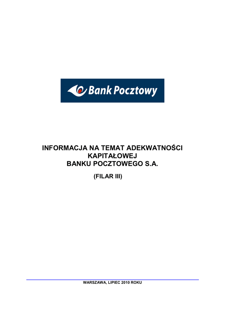 INFORMACJA NA TEMAT ADEKWATNOŚCI KAPITAŁOWEJ BANKU POCZTOWEGO S.A. (FILAR III) WARSZAWA, LIPIEC 2010 ROKU Informacja na temat adekwatności kapitałowej Banku Pocztowego S.A. SPIS TREŚCI 1. WSTĘP .......................................................................................................................................................... 3 2. STRUKTURA ORGANIZACYJNA ZARZĄDZANIA RYZYKIEM ......................................................... 4 3. FUNDUSZE WŁASNE................................................................................................................................. 6 4. WYMÓG KAPITAŁOWY............................................................................................................................. 7 5. KAPITAŁ WEWNĘTRZNY ......................................................................................................................... 9 6. ADEKWATNOŚĆ KAPITAŁOWA BANKU ........................................................................................... 11 6.1. 6.2. 7. MIARY ADEKWATNOŚCI KAPITAŁOWEJ .................................................................................................. 11 PROGNOZY MIAR ADEKWATNOŚCI KAPITAŁOWEJ ................................................................................. 12 RYZYKO KREDYTOWE ........................................................................................................................... 12 7.1. 7.2. 7.3. 7.4. 7.5. 7.6. 7.7. STRATEGIA ZARZĄDZANIA RYZYKIEM KREDYTOWYM ............................................................................ 13 IDENTYFIKACJA RYZYKA KREDYTOWEGO .............................................................................................. 14 ZABEZPIECZENIA JAKO TECHNIKI REDUKCJI RYZYKA ............................................................................ 15 POMIAR RYZYKA KREDYTOWEGO.......................................................................................................... 17 MONITOROWANIE RYZYKA KREDYTOWEGO .......................................................................................... 17 RAPORTOWANIE RYZYKA KREDYTOWEGO ............................................................................................ 18 DANE FINANSOWE DOTYCZĄCE EKSPOZYCJI BANKU NA RYZYKO KREDYTOWE ................................... 19 8. RYZYKO PŁYNNOŚCI.............................................................................................................................. 22 9. RYZYKO OPERACYJNE ......................................................................................................................... 24 10. RYZYKO RYNKOWE ............................................................................................................................ 25 10.1. 10.2. 11. RYZYKO STOPY PROCENTOWEJ KSIĘGI BANKOWEJ.......................................................................... 25 RYZYKO WALUTOWE ......................................................................................................................... 27 POZOSTAŁE RYZYKA......................................................................................................................... 28 11.1. 11.2. 11.3. 11.4. 11.5. RYZYKO BRAKU ZGODNOŚCI ............................................................................................................. 28 RYZYKO REPUTACJI .......................................................................................................................... 30 RYZYKO STRATEGICZNE.................................................................................................................... 31 RYZYKO CYKLU GOSPODARCZEGO ................................................................................................... 31 RYZYKO MODELI ................................................................................................................................ 32 2 Informacja na temat adekwatności kapitałowej Banku Pocztowego S.A. 1. Wstęp Niniejszy dokument jest realizacją postanowień Uchwały Nr 385/2008 Komisji Nadzoru Finansowego z dnia 17 grudnia 2008 roku w sprawie szczegółowych zasad i sposobu ogłaszania przez banki informacji o charakterze jakościowym i ilościowym dotyczących adekwatności kapitałowej oraz zakresu informacji podlegających ogłaszaniu oraz zatwierdzonych przez Radę Nadzorczą Banku Pocztowego S.A. „Generalnych zasad polityki ujawnień informacji na temat adekwatności kapitałowej w Banku Pocztowym S.A.”. Zarządzanie ryzykiem w Banku Pocztowym S.A. jest procesem zintegrowanym i odbywa się w oparciu o regulacje nadzorcze oraz o wewnętrzne procedury zatwierdzone przez Radę Nadzorczą oraz Zarząd. Obowiązujące procedury w tym zakresie podlegają okresowej weryfikacji stosownie do zmian uwarunkowań zewnętrznych i wewnętrznych funkcjonowania Banku. Przyjęto 3 stopniowy schemat organizacji regulacji wewnętrznych. Ogólne ramy zarządzania ryzykiem zostały określone w następujących dokumentach przyjętych przez Radę Nadzorczą: Strategii Banku na lata 2010-2013, Generalnych zasadach zarządzania ryzykiem w Banku Pocztowym S.A., Generalnych zasadach polityki kapitałowej w Banku Pocztowym S.A. Ich uszczegółowieniem są zaakceptowane przez Zarząd zasady zarządzania poszczególnymi ryzykami delegujące obowiązki na poziom poszczególnych Biur i Departamentów. Na ich podstawie opracowano szczegółowe procedury operacyjne zawierające opis poszczególnych czynności (w tym kontrolnych) przeprowadzanych przez Wydziały, Zespoły i Stanowiska. Proces zarządzania ryzykiem ma charakter ciągły, w który zaangaŜowane są wszystkie komórki organizacyjne i składa się z następujących etapów: 1) identyfikacji ryzyka, 2) pomiaru ryzyka, 3) monitorowania i kontroli ryzyka, 4) raportowania ryzyka, 5) podejmowania działań zaradczych, 6) przeglądu i weryfikacji procesu. Efektem prowadzonych działań w zakresie identy