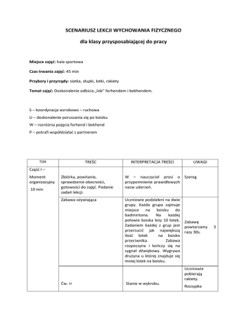 SCENARIUSZ LEKCJI WYCHOWANIA FIZYCZNEGO dla klasy przysposabiającej do pracy Miejsce zajęć: hala sportowa Czas trwania zajęć: 45 min Przybory i przyrządy: siatka, słupki, lotki, rakiety Temat zajęć: Doskonalenie odbicia „lob” forhendem i bekhendem. S – koordynacja wzrokowo – ruchowa U – doskonalenie poruszania się po boisku W – rozróżnia pojęcia forhend i bekhend P – potrafi współdziałać z partnerem TOK TREŚC INTERPRETACJA TREŚCI UWAGI Część I – Moment organizacyjny 10 min Zbiórka, powitanie, sprawdzenie obecności, gotowości do zajęć. Podanie zadań lekcji. W – nauczyciel prosi o Szereg przypomnienie prawidłowych nazw uderzeń. Zabawa ożywiająca Uczniowie podzieleni na dwie grupy. Każda grupa zajmuje miejsce na boisku do badmintona. Na każdej połowie boiska leży 10 lotek. Zabawę Zadaniem każdej z grup jest powtarzamy przerzucić jak największą razy 30s. ilość lotek na boisko przeciwnika. Zabawa rozpoczyna i kończy się na sygnał dźwiękowy. Wygrywa drużyna u której znajduje się mniej lotek na boisku. Uczniowie pobierają rakiety. Ćw. rr Stanie w wykroku. Rozsypka 3 Ćw. – 10 obszernych krążeń ręką przeciwległą do nogi wykrocznej. Ćw. powtarzamy drugą ręką. Ćw. tułowia w pł. strz. w przód Stanie w rozkroku, rakieta i w tył trzymana oburącz. Podczas ćwiczenia zwracamy uwagę na prawidłowy chwyt rakiety 10 razy Ćw. – skłon w przód, przejście do skłonu w tył. Ćw. nóg Stanie w rozkroku. Rakieta trzymana oburącz przed sobą. Ćw. – naprzemienne wymachy nóg do przeciwległej ręki. Ćw. tułowia w pł. czołowej Stanie w rozkroku. Rakieta trzymana oburącz nad głową. 20 razy 10 razy Ćw. – skłony boczne. Ćw. równoważne Poruszanie się po liniach boiska do badmintona w przód i w tył, naśladując krok szermierza. Ćw. m. grzbietu Leżenie przodem, ramiona wyprostowane w przód, chwyt rakiety oburącz. Ćw. – unoszenie klp i rr w górę. Wytrzymanie 10 s. Ćw. m. brzucha Zmiana kierunku ruchu rozpoczyna się na sygnał prowadzącego. 10 razy Leżenie tyłem o nogach ugiętych, rr z rakietą wyprostowane w przód. 2 razy Ćw. – unoszenie powtórzeń wyprostowanych nn do rakiety i powrót do pozycji wyjściowej. Ćw. w podporach Siad ugięty podparty. Rakieta ułożona przed ćwiczącym. 10 8 razy Ćw. – Przejście w podporze tyłem nad rakietą - powrót Ćw. tł. w pł. złożonej Stanie w rozkroku. Przekładanie rakiety między 5 razy w każdą nogami po ósemce. stronę Podskoki Uczniowie kolejno proponują nietypowe skoki. Ćw. specjalne Rakiety ułożone na podłodze tworzą drabinkę. Odległość między rakietami 0,5m. Bieg slalomem. Ćw. należy wykonać jak najszybciej, drobnymi kroczkami. 3 razy Część II - I ćw. Ćw. ustawieni parami twarzą Pierwszy wykonuje 15 rzutów do siebie na lotką w kierunku partnera. szerokość boiska Drugi odbija lotkę „lob” do badmintona. forhendem. 5 lotek na parę. II ćw. Główna 30 min. j.w. odbicia bekhendem III ćw. Po 3 Pierwszy odbija lotkę „lob” zmiana. forhendem, drugi „lob” bekhendem. Po odbiciu wykonują przysiad. min. IV ćw. Ćwiczący ustawieni za linią końcową boiska. Prowadzący nagrywa lotkę w dowolny punkt boiska. Ćwiczący kolejno odbijają lotkę „lob” forhendem lub bekhendem i wracają za końcową linię boiska. V ćw. Gra w jedno odbicie. Po odbiciu lotki zawodnik wraca za linię końcową boiska. Gra toczy się do 10 pkt. Cześć III – Końcowa 5 min. Uspokojenie organizmu Ćw. z elementami gimnastyki korekcyjno – kompensacyjnej. Zawodnicy podzieleni na dwie grupy – ustawieni na linii końcowej boiska I. Siad skrzyżny, plecy wyprostowane, rakieta trzymana oburącz, założona na plecy. Wytrzymanie pozycji 10s. 5 razy II. Leżenie przodem rr ugięte. Wyprost ramion, wznos górnej części tułowia, przejście do „ukłonu japońskiego”. Wytrzymanie pozycji 10s. 5 razy III. Zbiórka, omówienie lekcji, pożegnanie. Scenariusz opracowała mgr Agnieszka Sieniawska - Zaklikiewicz