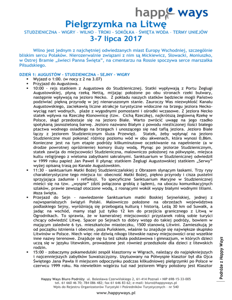 Pielgrzymka na Litwę STUDZIENICZNA - WIGRY – WILNO – TROKI - SOKÓŁKA – ŚWIĘTA WODA – TERMY UNIEJÓW 3-7 lipca 2017 DZIEŃ 1: AUGUSTÓW - STUDZIENICZNA - SEJNY – WIGRY Wyjazd o 1:00. (w nocy z 2 na 3.07) Przyjazd do Augustowa. 10:00 - rejs statkiem z Augustowa do Studzienicznej. Statki wypływają z Portu Żeglugi Augustowskiej, płyną rzeką Nettą, mijając położone po obu stronach rzeki bulwary, następnie wpływają na jezioro Necko. Z pokładu naszych statków będziecie mogli Państwo podziwiać piękną przyrodę w jej nienaruszonym stanie. Zauroczy Was niezwykłość Kanału Augustowskiego, zaciekawią liczne atrakcje turystyczne widoczne na brzegu jeziora Neckowyciąg nart wodnych, plaże z wygodnymi pomostami i ośrodki wczasowe. Z jeziora Necko statek wpływa na Rzeczkę Klonownicę (tzw. Cichą Rzeczkę), najkrótszą żeglowną Rzekę w Polsce, skąd przedostaje się na jezioro Białe. Warto zwrócić uwagę na jego rzadko spotykaną jasnozieloną barwę. Jezioro nazwano Białym z powodu niezliczonej ilości białego ptactwa wodnego osiadłego na brzegach i unoszącego się nad taflą jeziora. Jezioro Białe łączy z jeziorem Studzienicznym śluza Przewięź. Statek, żeby wpłynąć na jezioro Studzieniczne musi pokonać różnicę poziomu wód w obu akwenach, która wynosi 0,86m. Konieczne jest na tym etapie podróży kilkuminutowe oczekiwanie na napełnienie (a w drodze powrotnej opróżnienie) komory śluzy wodą. Płynąc po jeziorze Studzienicznym, statek zawija do miejscowości Studzieniczna, malowniczo położonej na półwyspie, miejsca kultu religijnego z wieloma zabytkami sakralnymi. Sanktuarium w Studzienicznej odwiedził w 1999 roku papież Jan Paweł II płynąc statkiem Żeglugi Augustowskiej statkiem „Serwy” wyżej opisaną trasą po Kanale Augustowskim. 11:30 - sanktuarium Matki Bożej Studzieniczańskiej z Obrazem słynącym łaskami. Trzy rysy charakterystyczne tego miejsca to: obecność Matki Bożej, piękno przyrody i cisza pustelni sprzyjająca zadumie i refleksji. To specyficzne Sanktuarium Maryjne w Studzienicznej mieści się na tzw. „wyspie” (dziś połączona groblą z lądem), na uboczu komunikacyjnych szlaków, prawie zewsząd otoczone wodą, z rosnącymi wokół wyspy białymi wodnymi liliami. Msza święta. Przejazd do Sejn - nawiedzenie Sanktuarium matki Boskiej Sejneńskiej, jednej z najwspanialszych świątyń Polski. Malowniczo położone na obrzeżach województwa podlaskiego Sejny, wyróżniają się przebogatą kulturą i historią. Leżą 30 km od Suwałk, a jadąc na wschód, mamy stąd już tylko 12 km do przejścia granicznego z Litwą w Ogrodnikach. To sprawia, że w kameralnej miejscowości przystanek robią sobie turyści chcący odwiedzić Litwę. Spacer po Sejnach to dobry wstęp do takiej podróży, bowiem w mającym zaledwie 6 tys. mieszkańców miasteczku, 1500 stanowią Litwini. Zamieszkują je od początku istnienia i obecnie, poza Puńskiem, właśnie tu znajduje się największe skupisko Litwinów w Polsce. Niech więc nie dziwią nikogo litewskie nazwy miejscowości oraz wszelkie inne nazwy terenowe. Znajduje się tu też szkoła podstawowa i gimnazjum, w których dzieci uczą się w języku litewskim, prowadzone jest również przedszkole dla dzieci z litewskich rodzin. 15:00 - zobaczymy pokamedulski zespół klasztorny w Wigrach, należący do najpiękniejszych i najcenniejszych zabytków Suwalszczyzny. Usytuowany na Półwyspie klasztor był dla Ojca Świętego Jana Pawła II miejscem odpoczynku podczas kilkudniowej pielgrzymki po Polsce w czerwcu 1999 roku. Na niewielkim wzgórzu tuż nad jeziorem Wigry położony jest Klasztor Happy Ways Biuro Podróży ul. Bolesława Czerwińskiego 2, 61-414 Poznań ▪ NIP 698-15-33-005 tel. 61 660 46 70; 784 086 482; fax 61 646 83 62; e-mail: [email protected] Wpis do Rejestru Organizatorów Turystyki i Pośredników Turystycznych – nr 540 www.happyways.pl Podróże z Happy Ways Wilno jest jednym z najchętniej odwiedzanych miast Europy Wschodniej, szczególnie bliskim sercu Polaków. Nierozerwalnie związani z nim są Mickiewicz, Słowacki, Moniuszko, w Ostrej Bramie „świeci Panna Święta”, na cmentarzu na Rossie spoczywa serce marszałka Piłsudskiego. Kamedułów, jedna z ciekawszych atrakcji Suwalszczyzny. Zabudowania klasztoru składają się z: dawnych eremów zakonników, Kościół, wieży zegarowej, restauracji, tawerny, ogrodów i przystani. W jednym z budynków udostępnione do zwiedzania są apartamenty papieskie w których przebudował papież Jan Paweł II podczas swojej pielgrzymki do Polski w 1999 roku. Miedzy kościołem a wieżą zegarową usytuowane są dwa rzędy domków - dawne eremy zakonników - w których obecnie można wynająć pokoje. Z wieży zegarowej rozciąga się piękny widok na jezioro Wigry i całą okolicę. 18:00 - obiadokolacja i nocleg w Polsce. DZIEŃ 2: TROKI - WILNO Po śniadaniu przejedziemy do Trok - stolicy Litwy aż do XIV w. Zobaczymy (z zewnątrz), jedno z najpiękniejszych miejsc na Litwie, gotycki zamek wzniesiony w XIV – XV w przez wielkiego księcia litewskiego Kiejstuta i jego syna Witolda. Okolica Trok słynie z łagodnych pagórków. Porastają je gęste zielone lasy i przecinają liczne doliny, wąwozy i jeziora, które łącząc się ze sobą tworzą niesymetryczne kształty. Pełno na nich półwyspów, mierzei i wysepek. Na jednej z nich ulokowało się potężne czworoboczne zamczysko: jego czerwone mury i baszty zwieńczone dachówką w takim samym kolorze odbijają się w tafli jeziora, które przecina jedynie drewniany most prowadzący na wysepkę. Ten widok na zamek w Trokach jest najczęstszym obrazkiem zdobiącym przewodniki i foldery o Litwie. 14:00 - przejazd do Wilna gdzie zobaczymy: Cmentarz na Rossie nazywany wileńskimi Powązkami. Jest to jedna z czterech polskich nekropolii narodowych. Potem z Góry Trzech Krzyży podziwiać będziemy przepiękną panoramę starówki wil
