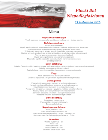 Płocki Bal Niepodległościowy 11 listopada 2016 Menu Przystawka oczekująca Torcik capresse z mozzarellą, pomidorami malinowymi i świeżą bazylią Bufet przekąskowy Schab po warszawsku Wybór wędlin polskich: szynka wędzona, baleron, kiełbasa wiejska sucha, kabanosy Wybór pasztetów z grzybami i marynatami (drobiowe, wieprzowe) Wybór mięs pieczonych: schab, boczek, karkówka, szynka z marynatami Śledzie w trzech smakach: ze śmietaną i jabłkiem, z cebulą w oleju, z buraczkami Terrina warzywno-serowa z boczkiem i ziołami Wybór serów polskich z winogronami i orzechami Marynaty: ogórki, pieczarki, borowiki, śliwki, warzywa marynowane Świeże pieczywo Bufet sałatkowy Sałatka Cesarska z liści sałaty rzymskie, grillowanym kurczakiem, płatkami parmezanu i grzankami Sałatka jarzynowa na liściach cykorii Sałata lodowa z papryką, ogórkiem i pomidorem z sosem vinegrette Zupy Krem z borowików z duszonym selerem Żurek na wędzonce z majerankiem z paseczkami białej kiełbasy Dania główne Polędwiczki wieprzowe z kurkami w sosie śmietanowym Kurczak na zielonej fasolce z bekonem w sosie pieprzowym Indyk faszerowany owocami w sosie żurawinowym Pierogi mix: z mięsem, z kapustą i grzybami, ruskie z cebulką i słoniną Kluski polskie z wędzonym boczkiem i majerankiem Ziemniaki pieczone z masłem i świeżym rozmarynem Warzywa duszone z ziołami i białym winem Bufet deserowy Szarlotka z cynamonem Panna cotta z musem malinowym Deser czekoladowy Napoje gorące i zimne Kawa, herbata – b/o Woda mineralna gazowana – b/o Woda mineralna niegazowana z miętą i cytryną – b/o Soki owocowe Cappy i napoje gazowane – 1,5 l/os Open Bar Wódka wyborowa – b/o Piwo – b/o Wino wytrawne – b/o Wino półsłodkie – b/o Drinki na bazie wódki – b/o