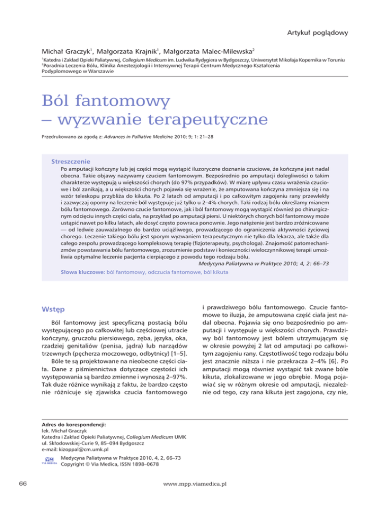 Artykuł poglądowy Michał Graczyk1, Małgorzata Krajnik1, Małgorzata Malec-Milewska2 1 Katedra i Zakład Opieki Paliatywnej, Collegium Medicum im. Ludwika Rydygiera w Bydgoszczy, Uniwersytet Mikołaja Kopernika w Toruniu Poradnia Leczenia Bólu, Klinika Anestezjologii i Intensywnej Terapii Centrum Medycznego Kształcenia Podyplomowego w Warszawie 2 Ból fantomowy – wyzwanie terapeutyczne Przedrukowano za zgodą z: Advances in Palliative Medicine 2010; 9; 1: 21–28 Streszczenie Po amputacji kończyny lub jej części mogą wystąpić iluzoryczne doznania czuciowe, że kończyna jest nadal obecna. Takie objawy nazywamy czuciem fantomowym. Bezpośrednio po amputacji dolegliwości o takim charakterze występują u większości chorych (do 97% przypadków). W miarę upływu czasu wrażenia czuciowe i ból zanikają, a u większości chorych pojawia się wrażenie, że amputowana kończyna zmniejsza się i na wzór teleskopu przybliża do kikuta. Po 2 latach od amputacji i po całkowitym zagojeniu rany przewlekły i zazwyczaj oporny na leczenie ból występuje już tylko u 2–4% chorych. Taki rodzaj bólu określamy mianem bólu fantomowego. Zarówno czucie fantomowe, jak i ból fantomowy mogą wystąpić również po chirurgicznym odcięciu innych części ciała, na przykład po amputacji piersi. U niektórych chorych ból fantomowy może ustąpić nawet po kilku latach, ale dosyć często powraca ponownie. Jego natężenie jest bardzo zróżnicowane — od ledwie zauważalnego do bardzo uciążliwego, prowadzącego do ograniczenia aktywności życiowej chorego. Leczenie takiego bólu jest sporym wyzwaniem terapeutycznym nie tylko dla lekarza, ale także dla całego zespołu prowadzącego kompleksową terapię (fizjoterapeuty, psychologa). Znajomość patomechanizmów powstawania bólu fantomowego, zrozumienie podstaw i konieczności wieloczynnikowej terapii umożliwia optymalne leczenie pacjenta cierpiącego z powodu tego rodzaju bólu. Medycyna Paliatywna w Praktyce 2010; 4, 2: 66–73 Słowa kluczowe: ból fantomowy, odczucia fantomowe, ból kikuta Wstęp Ból fantomowy jest specyficzną postacią bólu występującego po całkowitej lub częściowej utracie kończyny, gruczołu piersiowego, zęba, języka, oka, rzadziej genitaliów (penisa, jądra) lub narządów trzewnych (pęcherza moczowego, odbytnicy) [1–5]. Bóle te są projektowane na nieobecne części ciała. Dane z piśmiennictwa dotyczące częstości ich występowania są bardzo zmienne i wynoszą 2–97%. Tak duże różnice wynikają z faktu, że bardzo często nie różnicuje się zjawiska czucia fantomowego i prawdziwego bólu fantomowego. Czucie fantomowe to iluzja, że amputowana część ciała jest nadal obecna. Pojawia się ono bezpośrednio po amputacji i występuje u większości chorych. Prawdziwy ból fantomowy jest bólem utrzymującym się w okresie powyżej 2 lat od amputacji po całkowitym zagojeniu rany. Częstotliwość tego rodzaju bólu jest znacznie niższa i nie przekracza 2–4% [6]. Po amputacji mogą również wystąpić tak zwane bóle kikuta, zlokalizowane w jego obrębie. Mogą pojawiać się w różnym okresie od amputacji, niezależnie od tego, czy rana kikuta jest zagojona, czy nie, Adres do korespondencji: lek. Michał Graczyk Katedra i Zakład Opieki Paliatywnej, Collegium Medicum UMK ul. Skłodowskiej-Curie 9, 85–094 Bydgoszcz e-mail: [email protected] Medycyna Paliatywna w Praktyce 2010, 4, 2, 66–73 Copyright © Via Medica, ISSN 1898–0678 66 www.mpp.viamedica.pl Michał Graczyk i wsp., Ból fantomowy — wyzwanie terapeutyczne i są najczęściej wynikiem powstawania nerwiaka, bolesnej blizny, bolesnej odleżyny, stanu zapalnego w obrębie kikuta lub zapalenia kości. Bóle o typie fantomowym występują najczęściej po amputacji kończyny. Bóle o typie fantomowym po mastektomii stwierdza się u 15–30% pacjentek i są częstsze u kobiet, które zgłaszały ból przedoperacyjny. Bóle o typie fantomowym po resekcji odbytnicy występują u 15% chorych [1, 3, 7]. Do czynników zwiększających ryzyko powstawania bólów o typie fantomowym należą: podeszły wiek i silny ból, na przykład niedokrwienny, występujący przed operacją. Duże znaczenie ma również współistnienie bólu w obrębie kikuta, choroby naczyń, rozległe uszkodzenia tkanek (np. oparzenia) [2]. Doświadczenia dawno przebytych bólów w obrębie amputowanej kończyny (np. zapalenie ścięgna Achillesa, rwa kulszowa) mogą powrócić jako męczący ból o typie fantomowym. Ta tak zwana pamięć bólowa zakodowana jest w korze mózgu i obrębie rdzenia kręgowego [1, 3]. Natężenie bólu o typie fantomowym jest bardzo zróżnicowane. U niektórych chorych ból jest ledwo zauważalny, a u innych — dręczący i dokuczliwy, uniemożliwiający aktywność, zaburzający sen i wypoczynek. Charakter bólu jest również bardzo różnorodny. Chorzy opisują ból jako: piekący, miażdżący, kurczący lub strzelający. Może mieć on charakter stały z zaostrzeniami lub napadowy. Ból może znacznie nasilać się pod wpływem wielu czynników, między innymi: zmęczenia, bezsenności, lęku, zdenerwowania, podrażnienia kikuta przez bodźce mechaniczne lub termiczne [6]. Zjawiska, jakie towarzyszą amputacjom, należy podzielić na: — odczucia fantomowe: bezbolesne doznania czuciowe — iluzja, że amputowana część ciała jest nadal obecna; — ból kikuta: ból w obrębie rany lub blizny po amputacji; — ból fantomowy: bolesne doznania czuciowe, które utrzymują się powyżej 2 lat od amputacji, zlokalizowane w obrębie nieistniejącej (amputowanej) części ciała [3, 6]. Odczucia fantomowe Doznania fantomowe najczęściej rozciągają się w obszarze całej utraconej kończyny, fragmentu kończyny lub innej amputowanej części ciała. Mogą mieć one charakter sensacji i ruchów fantomowych. Sensacje fantomowe — charakteryzują się niebolesnymi doznaniami lub percepcją w fantomowej kończynie