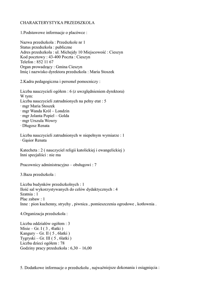 CHARAKTERYSTYKA PRZEDSZKOLA 1.Podstawowe informacje o placówce : Nazwa przedszkola : Przedszkole nr 1 Status przedszkola : publiczne Adres przedszkola : ul. Michejdy 10 Miejscowość : Cieszyn Kod pocztowy : 43-400 Poczta : Cieszyn Telefon : 852 11 67 Organ prowadzący : Gmina Cieszyn Imię i nazwisko dyrektora przedszkola : Maria Stoszek 2.Kadra pedagogiczna i personel pomocniczy : Liczba nauczycieli ogółem : 6 (z uwzględnieniem dyrektora) W tym: Liczba nauczycieli zatrudnionych na pełny etat : 5 · mgr Maria Stoszek · mgr Wanda Król – Londzin · mgr Jolanta Popiel – Golda · mgr Urszula Wowry · Długosz Renata Liczba nauczycieli zatrudnionych w niepełnym wymiarze : 1 · Gąsior Renata Katecheta : 2 ( nauczyciel religii katolickiej i ewangelickiej ) Inni specjaliści : nie ma Pracownicy administracyjno – obsługowi : 7 3.Baza przedszkola : Liczba budynków przedszkolnych : 1 Ilość sal wykorzystywanych do celów dydaktycznych : 4 Szatnia : 1 Plac zabaw : 1 Inne : pion kuchenny, strychy , piwnica , pomieszczenia ogrodowe , kotłownia . 4.Organizacja przedszkola : Liczba oddziałów ogółem : 3 Misie – Gr. I ( 3 , 4latki ) Kangury – Gr. II ( 5 , 6latki ) Tygryski – Gr. III ( 5 , 6latki ) Liczba dzieci ogółem : 78 Godziny pracy przedszkola : 6,30 – 16,00 5. Dodatkowe informacje o przedszkolu , najważniejsze dokonania i osiągnięcia : Przedszkole usytuowane jest w centrum starego , zabytkowego miasta Cieszyna graniczącego z Republiką Czeską , w pobliżu Szkoły Podstawowej nr 1 . Stary , ponad stuletni zabytkowy budynek przedszkolny adaptowany na placówkę przedszkolną , mieści się w pięknym , zielonym otoczeniu parkowym na 18 arowej działce . Placówka funkcjonuje w dwukondygnacyjnym , murowanym budynku . Sale dziecięce wraz z zapleczem sanitarnym usytuowane są na parterze .Sale zajęć są urządzone estetycznie i praktycznie , zapewniają dzieciom bezpieczny pobyt, zabawę i naukę w przedszkolu Przedszkole dysponuje dodatkową salą , w której wypoczywają młodsze dzieci , odbywają się zajęcia dodatkowe , dzieci oglądają filmy . W każdej sali organizowane są kąciki stymulujące dzieci do podejmowania różnorodnych form aktywności .Systematycznie placówka doposażona jest w nowe zabawki i pomoce dydaktyczne . Duży, pełen zieleni plac zabaw jest inspiracją do zabaw i zajęć ruchowych . Plac zabaw jest stale wzbogacany w nowe urządzenia drewniane . Jeden z dziadków wybudował w ogródku drewnianą altankę , naprawy urządzeń ogrodowych są również wykonywane bezpłatnie , przywóz piasku do piaskownic jest bezpłatnie organizowany przez byłego ojca dziecka .W miarę posiadanych środków, oraz przy udziale sponsorów w ostatnich latach zostały przeprowadzone prace remontowe i modernizacja budynku oraz otoczenia przedszkola , Bezpłatnie prowadzone są niektóre awaryjne prace związane z utrzymaniem budynku przedszkolnego ( np. czyszczenie rynien z zeschłych liści w okresie jesieni , zrzucanie śniegu i lodu z dachu budynku , obcinanie suchych gałęzi z drzew ogrodowych itp.) Wizja przedszkola : „W naszym przedszkolu dobro dziecka jest największą wartością ” Wszystkie dzieci w naszym przedszkolu obdarzane są szczególną uwagą i akceptacją , wzrastają w atmosferze miłości , wzajemnej życzliwości oraz w zgodzie z przyrodą ” . Nasze przedszkole zapewnia wszechstronny i radosny rozwój wszystkich wychowanków w atmosferze akceptacji i bezpieczeństwa . Traktujemy każde dziecko indywidualnie i podmiotowo starając się , by czuło się kochane i szczęśliwe. Dbamy o właściwe przygotowanie wychowanków do przyszłej edukacji w szkole .Uczymy dzieci żyć w zgodzie z przyrodą. W styczniu2007 roku przyłączyliśmy się do realizacji w naszym przedszkolu w grupach „Kangurków” i „Tygrysków” międzynarodowego programu profilaktycznego pt.”Przyjaciele Zippiego” , który w Polsce prowadzony jest przez Centrum Metodyczne Pomocy Psycholgiczno – Pedagogicznej we współpracy z Partnership for Children i dofinansowany przez OKI Priting Solution. Pomoce opracowane dla każdego dziecka 5 i 6-letniego opłacone zostały przez Urząd Miasta. Program ten uczy : · jak rozpoznawać uczucia, · jak nawiązywać i utrzymywać przyjaźń, · jak rozwiązywać konflikty, · jak zachowywać się w nowych sytuacjach, · jak radzić sobie w sytuacjach trudnych. Współpracujemy również ze Stowarzyszeniem Pomocy Wzajemnej „Być razem” przy realizacji projektu „Wspólne korzenie” w ramach programu „ Łączymy pokolenia”. Celem projektu jest przełamywanie barier , które dzielą pokolenia poprzez animację działań twórczych , w których zarówno osoby starsze jak i młodzi ludzie będą mogli w pełni się realizować oraz odnaleźć wspólną płaszczyznę do nawiązania bliskich relacji . W ramach tego programu dzieci poznają przeszłość , tradycje , ciekawe życiorysy oraz legendy , spotykają się również z reprezentantami starszego pokolenia , z ciekawymi ludźmi . Uważamy , że taka forma współpracy znacznie wzbogaci wiedzę dzieci i ich wyobraźnię oraz wytworzy w nich pozytywny wzorzec osoby starszej . W styczniu 2007 r. i we wcześniejszych latach dzieci 5 i 6-letie złożyły wizytę pensjonariuszom Domu Opieki Społecznej „Pogodna Starość” z okazji Dnia Babci i Dziadka , składając im w piosenkach i wierszach życzenia oraz przedstawiły inscenizację „Jasełek” . Po części artystycznej dzieci spotkały się przy herbatce i ciasteczkach z ciekawymi ludźmi , którzy przedstawili im wiersze, piosenki , utwory muzyczne na fortepianie. Dzieciom zaprezentowano również różne wytwory plastyczne i wyroby garncarskie wytwarzane przez mieszkańców , salki gimnastyczne , siłownię , gabinet masażu i inne pomieszczenia , zapoznając ich z codziennym życiem i zwyczajami zamieszkujących tam ludzi. W styczniu b.r. starsze dzieci przedszkolne odwiedziły również Muzeu