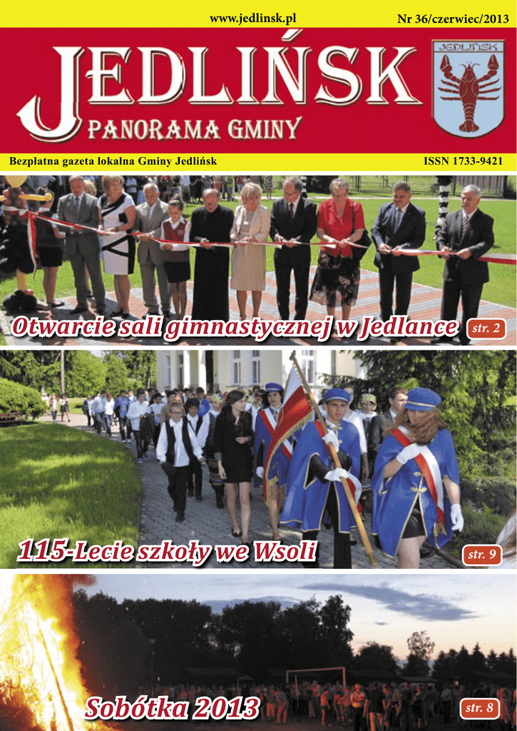 www.jedlinsk.pl Bezpłatna gazeta lokalna Gminy Jedlińsk Nr 36/czerwiec/2013 ISSN 1733-9421 Otwarcie sali gimnastycznej w Jedlance 115-Lecie szkoły we Wsoli Sobótka 2013 str. 2 str. 9 str. 8 1 str. 3 Drodzy Państwo W dniu 20 maja br. w godzinach popołudniowych 15-to minutowe oberwanie chmury z gradem wielkości małych jajek spowodowało olbrzymie straty na terenie naszej gminy. Najbardziej ucierpiały sołectwa: Kruszyna, Jeziorno, Wierzchowiny, Bierwce, Bierwiecka Wola, Wsola i Piastów. Zniszczone zostały poszycia dachów, elewacje, szyby, plastikowe rynny i rury spustowe w 500 budyn- S połeczność Publicznej Szkoły Podstawowej im. Braci Andrzeja i Józefa Załuskich w Jedlance doczekała się nowej sali gimnastycznej, której otwarcie nastąpiło 19 czerwca 2013r. Mszy świętej w Kaplicy pod wezwaniem Miłosierdzia Bożego w Jedlance, rozpoczynającej uroczystość przewodniczył ksiądz prałat doktor Henryk Ćwiek, a słowo Boże wygłosił ksiądz Andrzej Wąsik, proboszcz parafii Makowiec. Cała społeczność szkolna, lokalna oraz zaproszeni goście udali się w uroczystym orszaku przy dźwiękach donośnych werbli w stronę szkoły,gdzie nastąpiło symbolicznie przecięcie wstęgi , inicjujące działalność obiektu sportowego. W części oficjalnej gorąco dziękowano osobom, które istotnie przyczyniły się do powstania sali gimnastycznej. Byli to miedzy innymi: Bożenna Pacholczak, wiceprzewodnicząca Sejmiku Województwa mazowieckiego, Leszek Ruszczyk, wicemarszałek Województwa Mazowieckiego, przedstawiciele powiatu radomskiego : starosta Mirosław Ślifirczyk, Robert Dobosz, radny powiatu radomskiego, władze gminy Jedlińsk: Waldemar Sulisz, przewodniczący Rady Gminy Jedlińsk, Wojciech Walczak, wójt Gminy Jedlińsk wraz z byłym wójtem Bogumiłem Ferensztajnem Ewa Nędziak, dyrektora Poradni Psycholo- 2 kach mieszkalnych, w szkole we Wsoli, ośrodku zdrowia i szkole w Bierwcach. Poważne szkody powstały także w poszyciu dachów ponad 600 budynków gospodarczych i przemysłowych. Grad zniszczył szklarnie, tunele, kilkadziesiąt samochodów a także samoloty na lotnisku w Piastowie. Olbrzymie straty ponieśli również rolnicy w uprawach rolnych. Wstępnie szacujemy, że zniszczeniu uległy uprawy na pow. około 2500 ha. W akcji zabezpieczania uszkodzonych dachów na budynkach mieszkalnych uczestniczyło 30 jednostek straży. Chciałbym gorąco podziękować strażakom z Państwowej Straży Pożarnej w Radomiu i sąsiednich powiatów, wszystkim jednostkom ochotniczym z tereny naszej gminy i gmin sąsiednich za ogromy wysiłek i poświęcenie, za pośpiech i pracę w strugach deszczu przez całą noc i kilka kolejnych dni po zdarzeniu. Zniszczony eternit, szkło i inne odpady powstałe po burzy zostaną zutylizowane ze środków gminy i środków pozyskanych ze Starostwa Powiatowego w Radomiu. O terminie zbiórki powiadomimy Państwa na naszej stronie internetowej i w ogłoszeniach przekazanych przez sołtysów. Osoby pozostające w trudnej sytuacji materialnej, które ucierpiały w czasie gradobicia mogły składać wnioski o pomoc finansową do Gminnego Ośrodka Pomocy Społecznej. Zabiegam także o pomoc z budżetu państwa i ze środków UE na odtworzenie produkcji. Mam też do przekazania przyjemne informacje. Szkoła we Wsoli obchodzi piękny jubileusz 115-lecia istnienia. Z tej okazji dyrekcji, gronu pedagogicznemu i uczniom życzę samych sukcesów w nauce, pracy dydaktycznej, powodzenia i wygranych w konkursach, olimpiadach i różnego typu zawodach. W dniu 19 czerwca przekazaliśmy do użytkowania nową salę gimnastyczną przy Szkole Podstawowej w Jedlance. Jest to już szósty obiekt tego typu na terenie naszej gminy. Rozpoczęły się także prace przy budowie Centrum Zdrowia w Jedlińsku. Wojciech Walczak Otwarcie sali gimnastycznej w Jedlance giczno-Pedagogicznej w Radomiu oraz dyrektorzy z okolicznych placówek oświatowych i kulturalnych. Najmłodsi uczniowie wręczyli wszystkim wyróżnionym symboliczne medale: ,,Przyjaciel szkoły”, które zostały przyjęte z wielkim aplauzem. Gospodarzami uroczystości byli: dyrektor szkoły Beata Jagielska wraz z gronem pedagogicznym.Najwięcej wrażeń dostarczyła jednak część artystyczna zaprezentowana przez uczniów i gościnnie zaproszone formacje taneczne z MDK i Resursa w Radomiu. Uroczystość została przygotowana z wielkim rozmachem, nie szczędząc trudów, sił i środ- ków, zadziwiała różnorodnością form przekazu, ekspresją oraz nowoczesną dekoracją, której oryginalność polegała na wyeksponowaniu wyjątkowego charakteru uroczystości, w postaci ogromnych,balonowych sylwet sportowców. Niezwykle efektowne okazało się wypuszczenie przez wszystkie dzieci, setki balonów napełnionych helem. Mottem uroczystości były słowa błogosławionego Jana Pawła II ,, Niech ćwiczenie fizyczne będą częścią poszukiwania wyższych wartości, które kształtują charakter oraz dają poczucie godności i sukcesu.’’ Doskonale z funkcji konferansjera wywiązał się Marek Oleszczuk, nad całością czuwały: Jolanta Oleszczuk i Agnieszka Szymańska. Zwieńczeniem uroczystości była wspólna degustacja przepysznego tortu przez wszystkich uczestników niecodziennej imprezy. Otwarcie sali gimnastycznej daje szansę wszystkim, nie tylko społeczności uczniowskiej, na atrakcyjne formy spędzania czasu wolnego, integrację środowiska i dobrą zabawę w nowoczesnym obiekcie sportowym. Gospodarze serdecznie zapraszają. Więcej zdjęć na str 10. Anna Paszkiewicz Barbara Michalska ADAM ZIELIŃSKI 1957 - 2013 W sobotę 11 maja z żalem pożegnaliśmy naszego Kolegę, wieloletniego pracownika Urzędu Gminy w Jedlińsku, Kierownika Referatu Promocji i Rozwoju Gospodarczego Pana Adama Zielińskiego. Przemawiając nad otwartą mogiłą Wójt Gminy Wojciech Walczak stwierdził: „Tak wiele chciałbym Ci powiedzieć na pożegnanie, ale żadne słowa nie są w stanie oddać bólu po Two