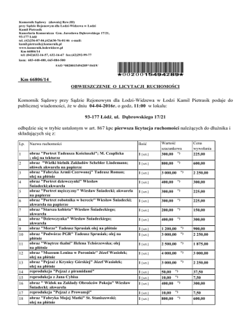 Komornik Sądowy (dawniej Rew.III) przy Sądzie Rejonowym dla Łodzi-Widzewa w Łodzi Kamil Pietrasik Kancelaria Komornicza Gen. Jarosława Dąbrowskiego 17/21, 93-177 Łódź tel. (42)256-87-84,(42)630-76-01/46 e-mail: [email protected] www.komornik.lodzwidzew.pl Km 66806/14 tel: (042)632-16-57, 632-16-67 fax:(42)292-99-77 kom: 603-448-400, 665-884-500 #AO *0020015494289*/0419/ *0020015494289* Km 66806/14 OBWIESZCZENIE O LICYTACJI RUCHOMOŚCI Komornik Sądowy przy Sądzie Rejonowym dla Łodzi-Widzewa w Łodzi Kamil Pietrasik podaje do publicznej wiadomości, że w dniu 04-04-2016r. o godz. 11:00 w lokalu: 93-177 Łódź, ul. Dąbrowskiego 17/21 odbędzie się w trybie ustalonym w art. 867 kpc pierwsza licytacja ruchomości należących do dłużnika i składających się z: Lp. Nazwa ruchomości Ilość 1 obraz "Portret Tadeusza Kościuszki"; M. Czaplicka ; olej na tekturze obraz "Wielki bielnik Zakładów Schebler Lindemann; ołówek akwarela na papierze obraz "Fabryka Armii Czerwonej" Tadeusz Roman; olej na płótnie obraz "Portret dziewczynki" Wiesław Śniadecki;akwarela obraz "Portret mężczyzny" Wiesław Śniadecki; akwarela na papierze obraz "Portret robotnika w berecie" Wiesław Śniadecki; akwarela na papierze obraz "Starsza kobieta" Wiesław Śniadeckiego; akwarela obraz "Dziewczynka" Wiesław Śniadeckiego; akwarela obraz "Morze" Tadeusz Sprusiak olej na płótnie obraz "Podwórze PGR" Tadeusz Sprusiak; olej na płótnie obraz "Wnętrze tkalni" Helena Tchórzewska; olej na płótnie obraz "Muzeum Lenina w Poroninie" Józef Wasiołek; olej na płótnie obraz "Pejzaż z Krynicy Górskiej" Józef Wasiołek; olej na płótnie reprodukcja "Pejzaż z piramidami" reprodukcja z Jana Cybisa obraz " Widok na Zakłady Obrońców Pokoju" Wiesław Śniadecki; akwarela reprodukcja "Pejzaż z Prowansji" obraz "Fabryka Mojej Matki" St. Staniszewski; olej na płótnie 1 [szt.] Wartość szacunkowa 300,00 *) 1 [szt.] 800,00 1 [szt.] 3 000,00 1 [szt.] 400,00 *) 300,00 1 [szt.] 300,00 *) 225,00 1 [szt.] 300,00 *) 225,00 1 [szt.] 200,00 *) 150,00 1 [szt.] 400,00 *) 300,00 1 [szt.] 1 [szt.] 1 200,00 3 000,00 *) *) 900,00 2 250,00 1 [szt.] 2 500,00 *) 1 875,00 1 [szt.] 4 000,00 *) 3 000,00 1 [szt.] 3 000,00 *) 2 250,00 1 [szt.] 1 [szt.] 1 [szt.] 50,00 10,00 400,00 *) 1 [szt.] 1 [szt.] 10,00 800,00 *) 2 3 4 5 6 7 8 9 10 11 12 13 14 15 16 17 18 *) 600,00 *) *) *) *) Cena wywołania 225,00 2 250,00 37,50 7,50 300,00 7,50 600,00 19 20 21 22 obraz "Widok fabryki Scheiblera" Wiesław Śniadecki; akwarela reprodukcja "Kwiaty w wazonie" Farys wg Juliusza Kossaka autor nierozpoznany obraz "Ulica w nocy" Stanisław Brzeziński; olej na płótnie *) 1 [szt.] 400,00 1 [szt.] 1 [szt.] 1 [szt.] 10,00 *) 100,00 *) 1 500,00 *) 300,00 7,50 75,00 1 125,00 *) cena za sztukę Ruchomości można oglądać w dzień licytacji w miejscu i czasie oznaczonym wyżej. Suma wywołania wynosi 75% sumy oszacowania. Przystępujący do przetargu obowiązany jest złożyć rękojmię w wysokości jednej dziesiątej części sumy oszacowania. Rękojmię złożoną przez licytanta, któremu udzielono przybicia, zatrzymuje się; pozostałym licytantom rękojmię zwraca się niezwłocznie. Jeżeli nabywca nie wykonał w terminie warunków licytacji co do zapłaty ceny, traci rękojmię, a skutki przybicia wygasają. Z utraconej rękojmi pokrywa się koszty egzekucji związanej ze sprzedażą, a reszta wchodzi w skład sumy uzyskanej w egzekucji albo jeżeli egzekucja została umorzona jest przelewana na dochód Skarbu Państwa (art. 8671 kpc). W przetargu nie mogą uczestniczyć: dłużnik, komornik, ich małżonkowie, dzieci, rodzice i rodzeństwo, osoby obecne na licytacji w charakterze urzędowym oraz licytant, który nie wykonał warunków poprzedniej licytacji. Stawienie się jednego licytanta wystarcza do odbycia przetargu. Pełnomocnictwo do udziału w przetargu powinno być stwierdzone dokumentem z podpisem urzędowo poświadczonym, chyba że chodzi o pełnomocnictwo udzielone adwokatowi lub radcy prawnemu (art. 8672 kpc) UWAGA: Licytacja może się nie odbyć bez podania przyczyny. Jeżeli drzwi będą zamknięte, będą otwierane na koszt i odpowiedzialność obowiązanegodłużnika. Komornik Sądowy Asesor Komorniczy Asesor Komorniczy Kamil Pietrasik Marta Kula Marek Knap Aplikant Komorniczy Aplikant Komorniczy Aplikant Komorniczy Asesor Komorniczy Roksana Kabuła Marta Szesteren Małgorzata Łepek Karolina KowalczykSkolasińska Adresat oryginału: dłużnik Do wiadomości: strony Asesor Komorniczy Asesor Komorniczy Asesor Komorniczy Asesor Komorniczy Lidia Chwalewska Sylwia Kacprzak Asesor Komorniczy Asesor Komorniczy Asesor Komorniczy Małgorzata Sienkiewicz-Siuda Magdalena Leszczyńska Anna Olczyk Piotr Ewa Nawrotkiewicz Aftowicz-Szymańska
