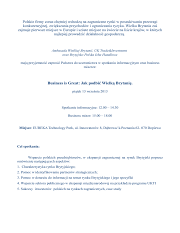 Polskie firmy coraz chętniej wchodzą na zagraniczne rynki w poszukiwaniu przewagi konkurencyjnej, zwiększania przychodów i ograniczania ryzyka. Wielka Brytania zaś zajmuje pierwsze miejsce w Europie i szóste miejsce na świecie na liście krajów, w których najlepiej prowadzić działalność gospodarczą. Ambasada Wielkiej Brytanii, UK Trade&Investment oraz Brytyjsko Polska Izba Handlowa mają przyjemność zaprosić Państwa do uczestnictwa w spotkaniu informacyjnym oraz business mixerze: Business is Great: Jak podbić Wielką Brytanię. piątek 13 września 2013 Spotkanie informacyjne: 12.00 – 14.30 Business mixer: 15.00 – 18.00 Miejsce: EUREKA Technology Park, ul. Innowatorów 8, Dąbrowa/ k.Poznania 62- 070 Dopiewo Cel spotkania: Wsparcie polskich przedsiębiorców, w ekspansji zagranicznej na rynek Brytyjski poprzez omówienie następujących aspektów: 1. Charakterystyka rynku Brytyjskiego; 2. Pomoc w identyfikowaniu partnerów strategicznych; 3. Pomoc w dotarciu do informacji na temat rynku Brytyjskiego i jego specyfiki 4. Wsparcie sektora publicznego w ekspansji międzynarodowej na przykładzie programu UKTI 5. Sukcesy inwestorów polskich na rynkach zagranicznych, case study Program: 12:00 –12:40 12:40 – 13:20 Business is GREAT: Business Centrum - program wspierania polskich przedsiębiorców w Wielkiej Brytanii, Martin Oxley, UK Trade & Investment 13:20 – 14:00 Business is GREAT Britain- inwestycje zagraniczne, Daniel Bajer, Ambasada Wielkiej Brytanii, Inward Investment 14:00 – 14:30 Ekspansja polskich firm za granice kraju, PWC 14:30 – 15:00 Zwiedzanie Parku Technologicznego EUREKA oraz wystawy Business is Great UK 15:00 – 18:00 Business Mixer i rozmowy kuluarowe Język wykładowy – POLSKI, udział – BEZPŁATNY Osoby zainteresowane uczestnictwem w spotkaniu prosimy o wypełnienie poniższego formularza zgłoszenia i odesłanie go e-mailem zwrotnym ([email protected]) lub faksem: +48 71 733 13 14 do dnia 09 września 2013 (poniedziałek). Dziękujemy, Zespół BPCC -------------------------------------FORMULARZ ZGŁOSZENIA------------------------------------------Wezmę udział w Seminarium BPCC – 13 września 2013 „Business is Great: Jak podbić Wielką Brytanię’’. Imię i nazwisko: Nazwa firmy: E-mail: Tel: W przypadku rezerwacji miejsca i niemożności przybycia na seminarium prosimy o pisemne odwołanie rezerwacji najpóźniej 48 godzin przed spotkaniem.