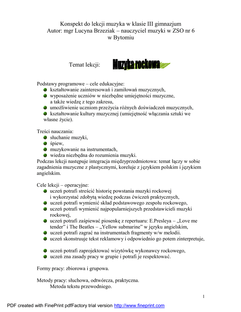 Konspekt do lekcji muzyka w klasie III gimnazjum Autor: mgr Lucyna Brzeziak – nauczyciel muzyki w ZSO nr 6 w Bytomiu Temat lekcji: Podstawy programowe – cele edukacyjne: kształtowanie zainteresowań i zamiłowań muzycznych, wyposażenie ucznió w w niezbędne umiejętności muzyczne, a także wiedzę z tego zakresu, umożliwienie uczniom przeżycia ró żnych doświadczeń muzycznych, kształtowanie kultury muzycznej (umiejętność włączania sztuki we własne życie). Treści nauczania: słuchanie muzyki, śpiew, muzykowanie na instrumentach, wiedza niezbędna do rozumienia muzyki. Podczas lekcji następuje integracja międzyprzedmiotowa: temat łączy w sobie zagadnienia muzyczne z plastycznymi, koreluje z językiem polskim i językiem angielskim. Cele lekcji – operacyjne: uczeń potrafi streścić historię powstania muzyki rockowej i wykorzystać zdobytą wiedzę podczas ć wiczeń praktycznych, uczeń potrafi wymienić skład podstawowego zespołu rockowego, uczeń potrafi wymienić najpopularniejszych przedstawicieli muzyki rockowej, uczeń potrafi zaśpiewać piosenkę z repertuaru: E.Presleya – „Love me tender” i The Beatles – „Yellow submarine” w języku angielskim, uczeń potrafi zagrać na instrumentach fragmenty w/w melodii. uczeń skonstruuje tekst reklamowy i odpowiednio go potem zinterpretuje, uczeń potrafi zaprojektować wizytó wkę wykonawcy rockowego, uczeń zna zasady pracy w grupie i potrafi je respektować . Formy pracy: zbiorowa i grupowa. Metody pracy: słuchowa, odtwó rcza, praktyczna. Metoda tekstu przewodniego. 1 PDF created with FinePrint pdfFactory trial version http://www.fineprint.com Pomoce dydaktyczne: plansze prezentujące postać Elvisa Presleya i zespó ł The Beatles, materiały dot. biografii artystó w i historii ich działalności muzycznej, przybory plastyczne, nagrania piosenek (podkłady instrumentalne): „Love me tender” i „Yellow submarine”, płyta CD z nagraniem utworu Maxa Freedman’a „Rock around the clock”, 2 magnetofony, dzwonki chromatyczne, zeszyt muzyczny Eugeniusza Wachowiaka do 3 kl. gimnazjum. Lp. Czynności nauczyciela Czynności ucznió w Pomoce dydaktyczne Uwagi CZĘ ŚĆ WSTĘ PNA 1. 2. 3. 4. 5. 6. Nauczyciel rozpoczyna lekcję przywitaniem się z uczniami i sprawdzeniem obecności. Nauczyciel włącza magnetofon i prezentuje uczniom utwó r (M.Freeman „Rock around the clock”) Uczniowie witają się z nauczycielem i zasiadają w ławkach. Uczniowie słuchają muzyki. Nauczyciel zadaje uczniom pytania: - Czy znacie ten utwó r, - Czy utwó r wam się podoba, itp. Nauczyciel podaje uczniom tytuł piosenki i jej autora. Uczniowie w formie luźnej pogadanki prezentują swoje odczucia po wysłuchaniu utworu. Magnetofon i płyta CD z piosenką „Rock around the clock”. Zeszyt muzyczny E.Wachowiaka do 3 klasy gimnazjum. Nauczyciel podaje uczniom Uczniowie wpisują w Zeszyt cele i temat lekcji. zeszycie przy temacie datę muzyczny lekcji. E.Wachowiaka do 3 klasy gimnazjum. Nauczyciel prezentuje kró tko Uczniowie słuchają, mogą Zeszyt historię rocka. robić notatki na marginesie w muzyczny. zeszycie. Uczniowie otwierają swoje zeszyty muzyczne na str. 65, gdzie odnajdują zapis nutowy tej piosenki. ZASADNICZA CZĘ ŚĆ LEKCJI 1. Nauczyciel objaśnia uczniom przebieg lekcji. Nauczyciel prosi ucznió w, aby zgłosili się ci, któ rzy potrafią ładnie śpiewać , chcą grać na instrumen-tach, chcą udzielać się aktorsko, chcą działać plastycznie. Uczniowie wykonują polecenia nauczyciela – dzielą się na grupy i zasiadają przy swoich stolikach. PDF created with FinePrint pdfFactory trial version http://www.fineprint.com Jeżeli uczniowie nie potrafiliby samodzielnie się podzielić , wó wczas czyni to 2 nauczyciel, grać na instrumen-tach, chcą udzielać się aktorsko, chcą działać plastycznie. - dzieli ucznió w na 2 zespoły. Zespó ł pierwszy będzie wykonywał zadania związane z postacią Elvisa Presleya, zespó ł drugi – z zespołem The Beatles. - w każdym zespole powstają 4 grupy. Kartka papieru 2. Nauczyciel objaśnia zadanie Uczniowie obu zespołó w wykonują zadanie zgodnie i przybory grupie 1 z poleceniem – działają piśmiennicze. w zespole 1 i 2: aktorsko. Reklama wykonawcy Opowiedz jak najbardziej ciekawie o wykonawcy. Twoja wypowiedź ma mieć charakter reklamy, która ma zachę cić publiczność do kontaktu z muzyką tego artysty. Informacja powinna zawierać krótką notkę biograficzną artysty oraz charakterystykę jego twórczości. Powinna również prezentować tytuły najpopularniej-szych jego utworów. WAŻNE: Reklama nie moż e przekraczać 50 wyrazów i powinna trwać 20 sekund. Zapisz tekst na kartce i naucz się go interpretować. Czas na wykonanie zadanie: 15 minut. 3. Nauczyciel objaśnia zadanie Uczniowie obu zespołó w Karta formatu wykonują zadanie zgodnie 15x7 cm. grupie 2 w zespole 1 i 2: z poleceniem – rysują. Przybory plastyczne: Wizytó wka wykonawcy Wykonaj na formacie 15x7 cm kredki, gumka wizytówkę reklamują cą mazaki, klej, wykonawcę . Pracę moż esz ołó wek, papier wykonać dowolną techniką . kolorowy, Moż esz uż yć zdję cia artysty. nożyczki, Wizytówka powinna zawierać zdjęcia dane artysty, np. nazwę wykonawcó w, zespołu lub imię itp. i nazwisko, typ muzyki, jaką wykonuje, logo (bardzo charaktery-styczne elementy, które moż na utoż samić z wykonawcą ), miejsce jego działalności (np. kraj, miejscowość), hasło reklamują ce artystę itp. PDF created with FinePrint pdfFactory trial version http://www.fineprint.com wó wczas czyni to nauczyciel, a powstałe grupy losują następnie zadanie, jakie będą wykonywały. 3 4. 5. działalności (np. kraj, miejscowość), hasło reklamują ce artystę itp. WAŻNE: Zadbaj o estetykę i staranność pracy. Dobierz rodzaj czcionki, aby tekst byłczytelny i wyrazisty. Pamię taj, ż e bę dziesz musiał(a) uzasadnić, dlaczego tak właśnie skomponow