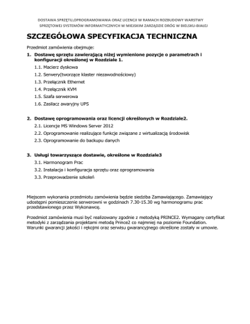 DOSTAWA SPRZĘTU,OPROGRAMOWANIA ORAZ LICENCJI W RAMACH ROZBUDOWY WARSTWY SPRZĘTOWEJ SYSTEMÓW INFORMATYCZNYCH W MIEJSKIM ZARZĄDZIE DRÓG W BIELSKU-BIAŁEJ SZCZEGÓŁOWA SPECYFIKACJA TECHNICZNA Przedmiot zamówienia obejmuje: 1. Dostawę sprzętu zawierającą niżej wymienione pozycje o parametrach i konfiguracji określonej w Rozdziale 1. 1.1. Macierz dyskowa 1.2. Serwery(tworzące klaster niezawodnościowy) 1.3. Przełącznik Ethernet 1.4. Przełącznik KVM 1.5. Szafa serwerowa 1.6. Zasilacz awaryjny UPS 2. Dostawę oprogramowania oraz licencji określonych w Rozdziale2. 2.1. Licencje MS Windows Server 2012 2.2. Oprogramowanie realizujące funkcje związane z wirtualizacją środowisk 2.3. Oprogramowanie do backupu danych 3. Usługi towarzyszące dostawie, określone w Rozdziale3 3.1. Harmonogram Prac 3.2. Instalacja i konfiguracja sprzętu oraz oprogramowania 3.3. Przeprowadzenie szkoleń Miejscem wykonania przedmiotu zamówienia będzie siedziba Zamawiającego. Zamawiający udostępni pomieszczenie serwerowni w godzinach 7.30-15.30 wg harmonogramu prac przedstawionego przez Wykonawcę. Przedmiot zamówienia musi być realizowany zgodnie z metodyką PRINCE2. Wymagany certyfikat metodyki z zarządzania projektami metodą Prince2 co najmniej na poziomie Foundation. Warunki gwarancji jakości i rękojmi oraz serwisu gwarancyjnego określone zostały w umowie. WYMAGANIA TECHNICZNE Wykonawca zobowiązany jest do instalacji i konfiguracji oferowanych urządzeń oraz musi zagwarantować ich wzajemną kompatybilność, przy zachowaniu funkcjonalności wyspecyfikowanych dla poszczególnych elementów dostawy. W przypadku, gdy Zamawiający nie wyspecyfikował produktów lub usług niezbędnych do funkcjonowania rozwiązania, Wykonawca jest zobowiązany do ich dostarczenia w ramach niniejszego zamówienia. Rozdział 1 Dostawa sprzętu Wymagania ogólne: 1. 2. 3. 4. Z uwagi na jednolitość platformy sprzętowej, oczekiwany pojedynczy punkt kontaktu serwisu producenta (jednolite wsparcie techniczne), wymagane jest aby serwery i macierz dyskowa były tego samego producenta. Dostarczone urządzenia muszą być fabrycznie nowe, muszą pochodzić z oficjalnego kanału sprzedaży producenta. (wymagane oświadczenie dystrybutora, że oferowany do przetargu sprzęt spełnia ten wymóg). Elementy, z których zbudowane są serwery muszą być produktami producenta tego serwera lub być przez niego certyfikowane (wymagane oświadczenie dystrybutora dołączone do oferty). Urządzenia muszą być objęte gwarancją producenta, potwierdzoną przez oryginalne karty gwarancyjne. Celem potwierdzenia spełnienia powyższych warunków wykonawca złoży odpowiednie oświadczenia Serwery zostaną podłączone bezpośrednio do Macierzy dyskowej za pomocą protokołu SAS. Producent urządzeń musi wspierać przedstawiony sposób podłączenia. Wykonawca dostarczy wszystkie kable zasilające i SAS potrzebne do podłączenia urządzeń. 1.1 Macierz dyskowa (1 szt.) 1. 2. 3. 4. 5. 6. 7. 8. 9. 10. 11. 12. 13. 14. 15. 16. 17. 18. Macierz musi mieć możliwość zainstalowania w standardowej szafie 19” Macierz musi cechować brak pojedynczego punktu awarii. Macierz musi umożliwiać zarządzanie poprzez sieć LAN Wymagane jest, aby architektura wewnętrzna macierzy wykorzystywała standard SAS 2.0 Macierz musi posiadać co najmniej 4 porty iSCSI 1Gb/s oraz 8 portów SAS 6 Gb/s Macierz musi mieć możliwość doposażenia kontrolerów w następujące interfejsy opcjonalne (dla całej macierzy): 8 portów iSCSI 1 Gb/s 8 portów SAS 6 Gb/s 8 portów FC 8 Gb/s 4 porty iSCSI/FCoE 10 Gb/s Macierz powinna wspierać zasilanie z dwóch niezależnych źródeł prądu Macierz musi obsługiwać dyski 2,5” jak i 3,5”. Macierz musi obsługiwać dyski SAS o pojemnościach 146GB, 300GB, 600GB, 900GB, 1,2TB dyski NL-SAS 500GB, 1TB, 2TB, 3TB oraz dyski SSD 200GB i 400GB. Macierz musi obsługiwać dyski SAS, NL-SAS, SSD i umożliwiać mieszanie ich w ramach jednej półki dyskowej. Macierz musi być wyposażona w 12 dysków typu SAS 600GB, 10000 obrotów, 2,5” Macierz musi obsługiwać poziomy RAID 0,1,5,6,10 Musi gwarantować możliwość rozbudowy on-line do co najmniej 120 dysków przy pomocy dysków 2,5” bez konieczności wymiany kontrolerów. Macierz musi być wyposażona w minimum 8GB pamięci Cache. Macierz musi umożliwiać rozbudowę pamięci cache do 16GB. Pamięć cache przeznaczona dla procesu zapisu musi być zabezpieczona przed skutkami awarii jednego z kontrolerów. Możliwość zarządzania całością dostępnych zasobów dyskowych z jednej konsoli administracyjnej. Macierz musi posiadać funkcjonalność bezpośredniego monitoringu kluczowych parametrów wydajnościowych, a także aktualnego stanu urządzenia. 19. Musi istnieć funkcjonalność Cache dla procesu odczytu. 20. Musi istnieć funkcjonalność Mirrored Cache dla procesu zapisu. 21. Minimalna ilość wspieranych wirtualnych dysków logicznych (LUN) dla całej (globalnej) puli dyskowej musi wynosić co najmniej 2000. 22. Macierz musi obsługiwać LUN Masking i LUN Mapping. 23. Macierz musi obsługiwać funkcjonalność dynamicznej alokacji przestrzeni dyskowej większej niż jest dostępna fizycznie oraz musi istnieć możliwość wyłączenia tej funkcjonalności dla wybranych woluminów. 24. Macierz musi mieć możliwość wykonania kopii danych typu snapshot (PiT) wolumenów. Zasoby źródłowe kopii PiT oraz docelowe kopii PiT mogą być zabezpieczone różnymi poziomami RAID i egzystować na różnych technologicznie dyskach stałych (SAS, NL-SAS). 25. Macierz musi obsługiwać min. 64 kopii migawkowych oraz umożliwiać rozbudowę o funkcjonalność obsługi do 2040 kopii migawkowych. 26. Kopie danych typu snapshot muszą być wykonywane przez macierz jako pojedyncza operacja w co najmniej trzech możliwych trybach: kopia pełna kopia wskaźnikowa przyrostowa kopia pełna 27. Macierz musi mieć możliwość odtworzenia zawartości woluminu logicz