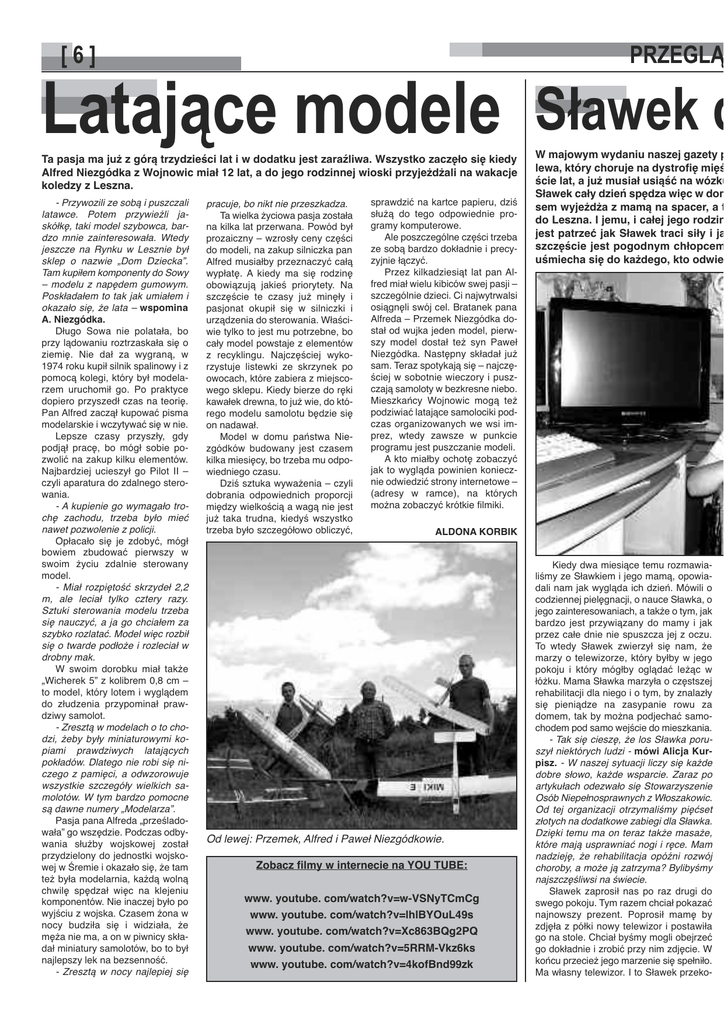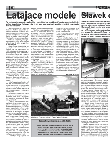 Latające modele Sławek d [6] PRZEGLĄ Ta pasja ma już z górą trzydzieści lat i w dodatku jest zaraźliwa. Wszystko zaczęło się kiedy Alfred Niezgódka z Wojnowic miał 12 lat, a do jego rodzinnej wioski przyjeżdżali na wakacje koledzy z Leszna. - Przywozili ze sobą i puszczali latawce. Potem przywieźli jaskółkę, taki model szybowca, bardzo mnie zainteresowała. Wtedy jeszcze na Rynku w Lesznie był sklep o nazwie „Dom Dziecka”. Tam kupiłem komponenty do Sowy – modelu z napędem gumowym. Poskładałem to tak jak umiałem i okazało się, że lata – wspomina A. Niezgódka. Długo Sowa nie polatała, bo przy lądowaniu roztrzaskała się o ziemię. Nie dał za wygraną, w 1974 roku kupił silnik spalinowy i z pomocą kolegi, który był modelarzem uruchomił go. Po praktyce dopiero przyszedł czas na teorię. Pan Alfred zaczął kupować pisma modelarskie i wczytywać się w nie. Lepsze czasy przyszły, gdy podjął pracę, bo mógł sobie pozwolić na zakup kilku elementów. Najbardziej ucieszył go Pilot II – czyli aparatura do zdalnego sterowania. - A kupienie go wymagało trochę zachodu, trzeba było mieć nawet pozwolenie z policji. Opłacało się je zdobyć, mógł bowiem zbudować pierwszy w swoim życiu zdalnie sterowany model. - Miał rozpiętość skrzydeł 2,2 m, ale leciał tylko cztery razy. Sztuki sterowania modelu trzeba się nauczyć, a ja go chciałem za szybko rozlatać. Model więc rozbił się o twarde podłoże i rozleciał w drobny mak. W swoim dorobku miał także „Wicherek 5” z kolibrem 0,8 cm – to model, który lotem i wyglądem do złudzenia przypominał prawdziwy samolot. - Zresztą w modelach o to chodzi, żeby były miniaturowymi kopiami prawdziwych latających pokładów. Dlatego nie robi się niczego z pamięci, a odwzorowuje wszystkie szczegóły wielkich samolotów. W tym bardzo pomocne są dawne numery „Modelarza”. Pasja pana Alfreda „prześladowała” go wszędzie. Podczas odbywania służby wojskowej został przydzielony do jednostki wojskowej w Śremie i okazało się, że tam też była modelarnia, każdą wolną chwilę spędzał więc na klejeniu komponentów. Nie inaczej było po wyjściu z wojska. Czasem żona w nocy budziła się i widziała, że męża nie ma, a on w piwnicy składał miniatury samolotów, bo to był najlepszy lek na bezsenność. - Zresztą w nocy najlepiej się pracuje, bo nikt nie przeszkadza. Ta wielka życiowa pasja została na kilka lat przerwana. Powód był prozaiczny – wzrosły ceny części do modeli, na zakup silniczka pan Alfred musiałby przeznaczyć całą wypłatę. A kiedy ma się rodzinę obowiązują jakieś priorytety. Na szczęście te czasy już minęły i pasjonat okupił się w silniczki i urządzenia do sterowania. Właściwie tylko to jest mu potrzebne, bo cały model powstaje z elementów z recyklingu. Najczęściej wykorzystuje listewki ze skrzynek po owocach, które zabiera z miejscowego sklepu. Kiedy bierze do ręki kawałek drewna, to już wie, do którego modelu samolotu będzie się on nadawał. Model w domu państwa Niezgódków budowany jest czasem kilka miesięcy, bo trzeba mu odpowiedniego czasu. Dziś sztuka wyważenia – czyli dobrania odpowiednich proporcji między wielkością a wagą nie jest już taka trudna, kiedyś wszystko trzeba było szczegółowo obliczyć, sprawdzić na kartce papieru, dziś służą do tego odpowiednie programy komputerowe. Ale poszczególne części trzeba ze sobą bardzo dokładnie i precyzyjnie łączyć. Przez kilkadziesiąt lat pan Alfred miał wielu kibiców swej pasji – szczególnie dzieci. Ci najwytrwalsi osiągnęli swój cel. Bratanek pana Alfreda – Przemek Niezgódka dostał od wujka jeden model, pierwszy model dostał też syn Paweł Niezgódka. Następny składał już sam. Teraz spotykają się – najczęściej w sobotnie wieczory i puszczają samoloty w bezkresne niebo. Mieszkańcy Wojnowic mogą też podziwiać latające samolociki podczas organizowanych we wsi imprez, wtedy zawsze w punkcie programu jest puszczanie modeli. A kto miałby ochotę zobaczyć jak to wygląda powinien koniecznie odwiedzić strony internetowe – (adresy w ramce), na których można zobaczyć krótkie filmiki. W majowym wydaniu naszej gazety p lewa, który choruje na dystrofię mięś ście lat, a już musiał usiąść na wózku Sławek cały dzień spędza więc w dom sem wyjeżdża z mamą na spacer, a t do Leszna. I jemu, i całej jego rodzin jest patrzeć jak Sławek traci siły i ja szczęście jest pogodnym chłopcem uśmiecha się do każdego, kto odwie ALDONA KORBIK Od lewej: Przemek, Alfred i Paweł Niezgódkowie. Zobacz filmy w internecie na YOU TUBE: www. youtube. com/watch?v=w-VSNyTCmCg www. youtube. com/watch?v=lhlBYOuL49s www. youtube. com/watch?v=Xc863BQg2PQ www. youtube. com/watch?v=5RRM-Vkz6ks www. youtube. com/watch?v=4kofBnd99zk Kiedy dwa miesiące temu rozmawialiśmy ze Sławkiem i jego mamą, opowiadali nam jak wygląda ich dzień. Mówili o codziennej pielęgnacji, o nauce Sławka, o jego zainteresowaniach, a także o tym, jak bardzo jest przywiązany do mamy i jak przez całe dnie nie spuszcza jej z oczu. To wtedy Sławek zwierzył się nam, że marzy o telewizorze, który byłby w jego pokoju i który mógłby oglądać leżąc w łóżku. Mama Sławka marzyła o częstszej rehabilitacji dla niego i o tym, by znalazły się pieniądze na zasypanie rowu za domem, tak by można podjechać samochodem pod samo wejście do mieszkania. - Tak się cieszę, że los Sławka poruszył niektórych ludzi - mówi Alicja Kurpisz. - W naszej sytuacji liczy się każde dobre słowo, każde wsparcie. Zaraz po artykułach odezwało się Stowarzyszenie Osób Niepełnosprawnych z Włoszakowic. Od tej organizacji otrzymaliśmy pięćset złotych na dodatkowe zabiegi dla Sławka. Dzięki temu ma on teraz także masaże, które mają usprawniać nogi i ręce. Mam nadzieję, że rehabilitacja opóźni rozwój choroby, a m