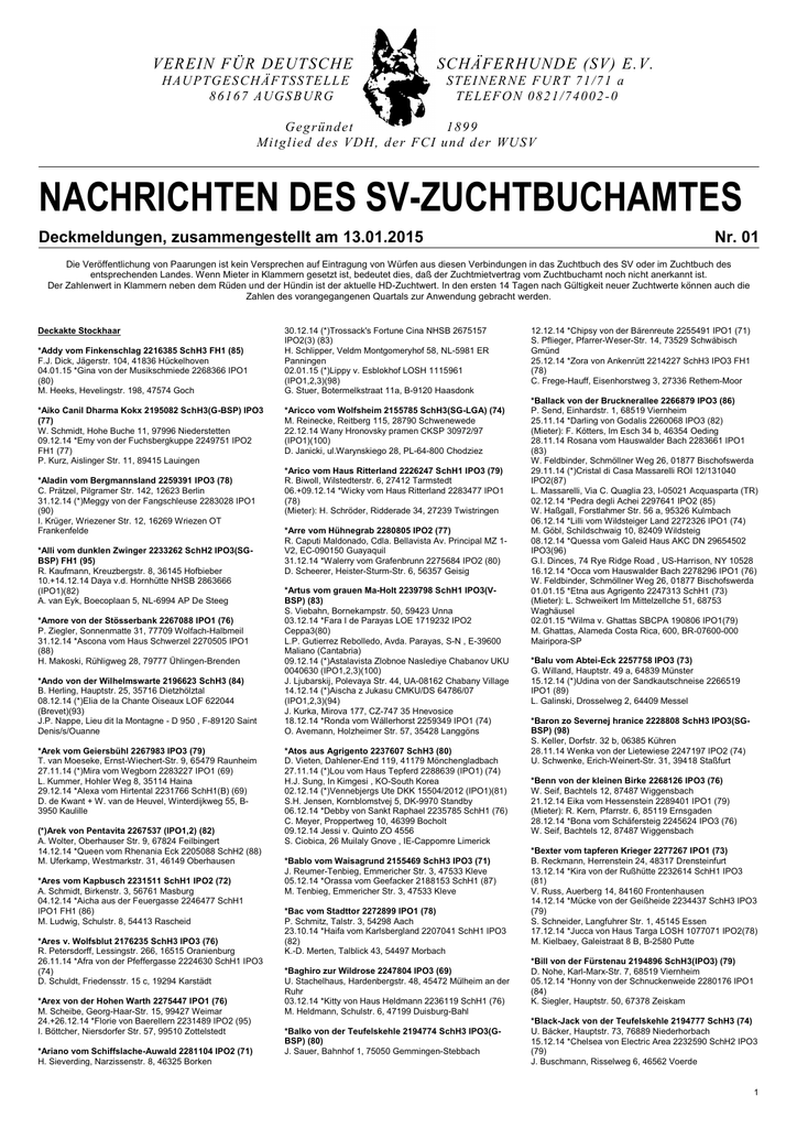 VEREIN FÜR DEUTSCHE HAU PT GES CH ÄF TS S T E LL E 8 6 1 6 7 AUGS BUR G SCHÄFERHUNDE (SV) E.V. S TEI NER N E F URT 7 1 /7 1 a TE LEF O N 0 8 2 1 /7 4 0 0 2 - 0 Geg rü n d et 1899 Mi tg l ied d es VD H, d e r F CI u n d d er WUS V NACHRICHTEN DES SV-ZUCHTBUCHAMTES Deckmeldungen, zusammengestellt am 13.01.2015 Nr. 01 Die Veröffentlichung von Paarungen ist kein Versprechen auf Eintragung von Würfen aus diesen Verbindungen in das Zuchtbuch des SV oder im Zuchtbuch des entsprechenden Landes. Wenn Mieter in Klammern gesetzt ist, bedeutet dies, daß der Zuchtmietvertrag vom Zuchtbuchamt noch nicht anerkannt ist. Der Zahlenwert in Klammern neben dem Rüden und der Hündin ist der aktuelle HD-Zuchtwert. In den ersten 14 Tagen nach Gültigkeit neuer Zuchtwerte können auch die Zahlen des vorangegangenen Quartals zur Anwendung gebracht werden. Deckakte Stockhaar *Addy vom Finkenschlag 2216385 SchH3 FH1 (85) F.J. Dick, Jägerstr. 104, 41836 Hückelhoven 04.01.15 *Gina von der Musikschmiede 2268366 IPO1 (80) M. Heeks, Hevelingstr. 198, 47574 Goch *Aiko Canil Dharma Kokx 2195082 SchH3(G-BSP) IPO3 (77) W. Schmidt, Hohe Buche 11, 97996 Niederstetten 09.12.14 *Emy von der Fuchsbergkuppe 2249751 IPO2 FH1 (77) P. Kurz, Aislinger Str. 11, 89415 Lauingen *Aladin vom Bergmannsland 2259391 IPO3 (78) C. Prätzel, Pilgramer Str. 142, 12623 Berlin 31.12.14 (*)Meggy von der Fangschleuse 2283028 IPO1 (90) I. Krüger, Wriezener Str. 12, 16269 Wriezen OT Frankenfelde *Alli vom dunklen Zwinger 2233262 SchH2 IPO3(SGBSP) FH1 (95) R. Kaufmann, Kreuzbergstr. 8, 36145 Hofbieber 10.+14.12.14 Daya v.d. Hornhütte NHSB 2863666 (IPO1)(82) A. van Eyk, Boecoplaan 5, NL-6994 AP De Steeg *Amore von der Stösserbank 2267088 IPO1 (76) P. Ziegler, Sonnenmatte 31, 77709 Wolfach-Halbmeil 31.12.14 *Ascona vom Haus Schwerzel 2270505 IPO1 (88) H. Makoski, Rühligweg 28, 79777 Ühlingen-Brenden *Ando von der Wilhelmswarte 2196623 SchH3 (84) B. Herling, Hauptstr. 25, 35716 Dietzhölztal 08.12.14 (*)Elia de la Chante Oiseaux LOF 622044 (Brevet)(93) J.P. Nappe, Lieu dit la Montagne - D 950 , F-89120 Saint Denis/s/Ouanne *Arek vom Geiersbühl 2267983 IPO3 (79) T. van Moeseke, Ernst-Wiechert-Str. 9, 65479 Raunheim 27.11.14 (*)Mira vom Wegborn 2283227 IPO1 (69) L. Kummer, Hohler Weg 8, 35114 Haina 29.12.14 *Alexa vom Hirtental 2231766 SchH1(B) (69) D. de Kwant + W. van de Heuvel, Winterdijkweg 55, B3950 Kaulille (*)Arek von Pentavita 2267537 (IPO1,2) (82) A. Wolter, Oberhauser Str. 9, 67824 Feilbingert 14.12.14 *Queen vom Rhenania Eck 2205088 SchH2 (88) M. Uferkamp, Westmarkstr. 31, 46149 Oberhausen *Ares vom Kapbusch 2231511 SchH1 IPO2 (72) A. Schmidt, Birkenstr. 3, 56761 Masburg 04.12.14 *Aicha aus der Feuergasse 2246477 SchH1 IPO1 FH1 (86) M. Ludwig, Schulstr. 8, 54413 Rascheid *Ares v. Wolfsblut 2176235 SchH3 IPO3 (76) R. Petersdorff, Lessingstr. 266, 16515 Oranienburg 26.11.14 *Afra von der Pfeffergasse 2224630 SchH1 IPO3 (74) D. Schuldt, Friedensstr. 15 c, 19294 Karstädt *Arex von der Hohen Warth 2275447 IPO1 (76) M. Scheibe, Georg-Haar-Str. 15, 99427 Weimar 24.+26.12.14 *Florie von Baerellern 2231489 IPO2 (95) I. Böttcher, Niersdorfer Str. 57, 99510 Zottelstedt *Ariano vom Schiffslache-Auwald 2281104 IPO2 (71) H. Sieverding, Narzissenstr. 8, 46325 Borken 30.12.14 (*)Trossack's Fortune Cina NHSB 2675157 IPO2(3) (83) H. Schlipper, Veldm Montgomeryhof 58, NL-5981 ER Panningen 02.01.15 (*)Lippy v. Esblokhof LOSH 1115961 (IPO1,2,3)(98) G. Stuer, Botermelkstraat 11a, B-9120 Haasdonk *Aricco vom Wolfsheim 2155785 SchH3(SG-LGA) (74) M. Reinecke, Reitberg 115, 28790 Schwenewede 22.12.14 Wany Hronovsky pramen CKSP 30972/97 (IPO1)(100) D. Janicki, ul.Warynskiego 28, PL-64-800 Chodziez *Arico vom Haus Ritterland 2226247 SchH1 IPO3 (79) R. Biwoll, Wilstedterstr. 6, 27412 Tarmstedt 06.+09.12.14 *Wicky vom Haus Ritterland 2283477 IPO1 (78) (Mieter): H. Schröder, Ridderade 34, 27239 Twistringen *Arre vom Hühnegrab 2280805 IPO2 (77) R. Caputi Maldonado, Cdla. Bellavista Av. Principal MZ 1V2, EC-090150 Guayaquil 31.12.14 *Walerry vom Grafenbrunn 2275684 IPO2 (80) D. Scheerer, Heister-Sturm-Str. 6, 56357 Geisig *Artus vom grauen Ma-Holt 2239798 SchH1 IPO3(VBSP) (83) S. Viebahn, Bornekampstr. 50, 59423 Unna 03.12.14 *Fara I de Parayas LOE 1719232 IPO2 Ceppa3(80) L.P. Gutierrez Rebolledo, Avda. Parayas, S-N , E-39600 Maliano (Cantabria) 09.12.14 (*)Astalavista Zlobnoe Naslediye Chabanov UKU 0040630 (IPO1,2,3)(100) J. Ljubarskij, Polevaya Str. 44, UA-08162 Chabany Village 14.12.14 (*)Aischa z Jukasu CMKU/DS 64786/07 (IPO1,2,3)(94) J. Kurka, Mirova 177, CZ-747 35 Hnevosice 18.12.14 *Ronda vom Wällerhorst 2259349 IPO1 (74) O. Avemann, Holzheimer Str. 57, 35428 Langgöns *Atos aus Agrigento 2237607 SchH3 (80) D. Vieten, Dahlener-End 119, 41179 Mönchengladbach 27.11.14 (*)Lou vom Haus Tepferd 2288639 (IPO1) (74) H.J. Sung, In Kimgesi , KO-South Korea 02.12.14 (*)Vennebjergs Ute DKK 15504/2012 (IPO1)(81) S.H. Jensen, Kornblomstvej 5, DK-9970 Standby 06.12.14 *Debby von Sankt Raphael 2235785 SchH1 (76) C. Meyer, Proppertweg 10, 46399 Bocholt 09.12.14 Jessi v. Quinto ZO 4556 S. Ciobica, 26 Muilaly Gnove , IE-Cappomre Limerick *Bablo vom Waisagrund 2155469 SchH3 IPO3 (71) J. Reumer-Tenbieg, Emmericher Str. 3, 47533 Kleve 05.12.14 *Orassa vom Geefacker 2188153 SchH1 (87) M. Tenbieg, Emmericher Str. 3, 47533 Kleve *Bac vom Stadttor 2272899 IPO1 (78) P. Schmitz, Talstr. 3, 54298 Aach 23.10.14 *Haifa vom Karlsbergland 2207041 SchH1 IPO3 (82) K.-D. Merten, Talblick 43, 54497 Morbach *Baghiro zur Wildrose 2247804 IPO3 (69) U. Stachelhaus, Hardenbergstr. 48, 45472 Mülheim an der Ruhr 03.12.14 *Kitty von Haus Heldmann 2236119 SchH1 (76) M. Heldmann, Schulstr. 6, 47199 Duisburg-Bahl *Balko von der Teufelskehle 2194774 SchH3 IPO3(GBSP) (80) J. Sauer, Bahnhof 1, 75050 Gemmingen-Stebbach 12.12.14 *Chipsy von der Bärenreute 2255491 IPO1 (71) S. Pflieger, Pfarrer-Weser-Str. 14, 73529 Schwäbisch Gmünd 25.12.14 *Zora von Ankenrütt 2214227 SchH3 IPO3 FH1 (78) C. Frege