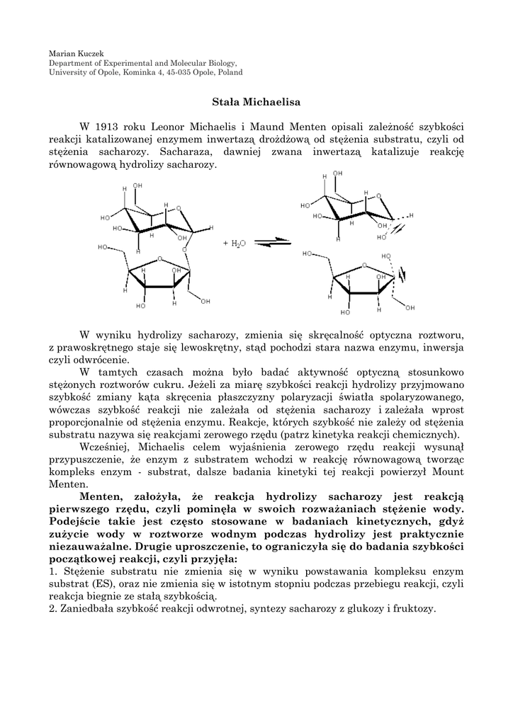 Marian Kuczek Department of Experimental and Molecular Biology, University of Opole, Kominka 4, 45-035 Opole, Poland Stała Michaelisa W 1913 roku Leonor Michaelis i Maund Menten opisali zależność szybkości reakcji katalizowanej enzymem inwertazą drożdżową od stężenia substratu, czyli od stężenia sacharozy. Sacharaza, dawniej zwana inwertazą katalizuje reakcję równowagową hydrolizy sacharozy. W wyniku hydrolizy sacharozy, zmienia się skręcalność optyczna roztworu, z prawoskrętnego staje się lewoskrętny, stąd pochodzi stara nazwa enzymu, inwersja czyli odwrócenie. W tamtych czasach można było badać aktywność optyczną stosunkowo stężonych roztworów cukru. Jeżeli za miarę szybkości reakcji hydrolizy przyjmowano szybkość zmiany kąta skręcenia płaszczyzny polaryzacji światła spolaryzowanego, wówczas szybkość reakcji nie zależała od stężenia sacharozy i zależała wprost proporcjonalnie od stężenia enzymu. Reakcje, których szybkość nie zależy od stężenia substratu nazywa się reakcjami zerowego rzędu (patrz kinetyka reakcji chemicznych). Wcześniej, Michaelis celem wyjaśnienia zerowego rzędu reakcji wysunął przypuszczenie, że enzym z substratem wchodzi w reakcję równowagową tworząc kompleks enzym - substrat, dalsze badania kinetyki tej reakcji powierzył Mount Menten. Menten, założyła, że reakcja hydrolizy sacharozy jest reakcją pierwszego rzędu, czyli pominęła w swoich rozważaniach stężenie wody. Podejście takie jest często stosowane w badaniach kinetycznych, gdyż zużycie wody w roztworze wodnym podczas hydrolizy jest praktycznie niezauważalne. Drugie uproszczenie, to ograniczyła się do badania szybkości początkowej reakcji, czyli przyjęła: 1. Stężenie substratu nie zmienia się w wyniku powstawania kompleksu enzym substrat (ES), oraz nie zmienia się w istotnym stopniu podczas przebiegu reakcji, czyli reakcja biegnie ze stałą szybkością. 2. Zaniedbała szybkość reakcji odwrotnej, syntezy sacharozy z glukozy i fruktozy. Szybkość reakcji. Szybkością reakcji nazywamy pochodną stężenia substratu(ów) lub produktu(ów) po czasie reakcji. Ze względów praktycznych zamiast równia różniczkowego stosuje się równanie różnicowe a umownie nazywa się je różniczkowym. v= − d[S ] dt v≈ ∆ [S] ∆t Szybkość reakcji inwersji (hydrolizy) sacharozy Menten badała wagowo i w przeciwieństwie do wcześniejszych badaczy mogła oznaczyć stężenia produktów reakcji przy bardzo małych stężeniach sacharozy. Wykonanie W pierwszych latach ubiegłego stulecia stężenie cukrów redukujących badano wagowo. W wyniku reakcji zasadowego roztworu soli miedzi 2 powstaje osad tlenku miedzi 1. Osad ten odsączano, przemywano, suszono i ważono. Metoda ta była bardzo pracochłonna. W 1944 roku opisano kolorymetryczną metodę oznaczania cukrów redukujących i od tego czasu jest to najczęściej stosowania metoda. Do kolejnych probówek dodaje się 0, 0.05, 0.1, 0.2, 0.5, 1, 3, 9 cm 3 0.2 M roztworu sacharozy w 0.1 M buforze octanowym o pH 4.5, dopełnia się do 9 cm3 buforem octanowym, miesza się i wstawia do łaźni wodnej o temperaturze 323 K. Po 10 minutach inkubacji w łaźni wodnej, kolejno do każdej probówki, w odstępach co 10 min, dodaje się po 1 cm3 ekstraktu białek z drożdży ponownie miesza się i umieszcza w łaźni wodnej. Stężenia sacharozy wynoszą kolejno: 0, 1, 2, 4, 10, 20, 60, 180 mM. W takich samych odstępach czasu (co 10 min), po każdych 10 minutach dalszej inkubacji, z kolejnych probówek pobiera się po 0.1 cm3 roztworu, dodaje do 2.9 cm3 odczynnika odbiałczającego, miesza, po 5 mim odwirowuje osad białka. Do 1 cm3 supernatantu dodaje się 1 cm3 odczynnika miedziowego (zasadowy roztwór winianu miedziowego), miesza, wstawia do wrzącej łaźni wodnej na 20 min. Po ostudzeniu dodaje się 1 cm3 odczynnika arseno-molibdenowego, wstrząsa do usunięcia wydzielonego dwutlenku węgla, dodaje się 7 cm3 wody, miesza i mierzy absorbancję przy 660 nm. Stężenie cukrów redukujących odczytuje się z wcześniej przygotowanej krzywej wzorcowej. Przedstawiona poniżej na wykresie zależność stężenia produktów reakcji od czasu początkowo układa się liniowo, czyli reakcja w początkowej części wykresu zachodzi z prawie stałą szybkością. Po długim czasie szybkość reakcji zmniejsza się, reakcja osiąga stan końcowy. Wykres nachylenia krzywych początkowego przyrostu stężenia produktów reakcji od czasu, czyli wykres szybkości początkowej reakcji od stężenia substratu, przedstawia wycinek hiperboli. Wraz ze wzrostem stężenia substratu, zwiększa się szybkość reakcji i asymptotycznie zbliża się do wartości zwanej szybkością maksymalną Vm. Krzywą zależności szybkości początkowej reakcji od stężenia sacharozy Menten opisała równaniem zwanym równaniem Michaelis-Menten. Równanie to jest uproszczonym rozwiązaniem równania reakcji równowagowej po której następuje reakcja nieodwracalna: E + S = ES ES = E + P gdzie: E - enzym, S - substrat, ES - kompleks enzym substrat, P - produkt. Zakładając, że szybkość reakcji jest wprost proporcjonalna do stężenia kompleksu ES, że szybkość maksymalna, czyli szybkość początkowa reakcji przy nieskończenie wielkim stężeniu substratu, jest wprost proporcjonalna do całkowitego stężenia enzymu, gdyż przy maksymalnie dużym stężeniu substratu, wystąpi maksymalne przesunięcie równowagi reakcji w kierunku powstawania kompleksu ES. W warunkach gdy mierzy się szybkość początkową reakcji można zaniedbać ubytek stężenia substratu oraz przy znikomym stężeniu produktu reakcji można założyć, że nie powstaje kompleks EP (enzym-produkt) w wyniku reakcji: E + P = EP. Stała równowagi reakcji dysocjacji ES K= [E ][S ] [ES ] Przyjmując, że stężenie enzymu [E] w stanie równowagi jest równe stężeniu całkowitemu enzymu [E(0)] pomniejszonemu o stężenie [ES], molowe stę