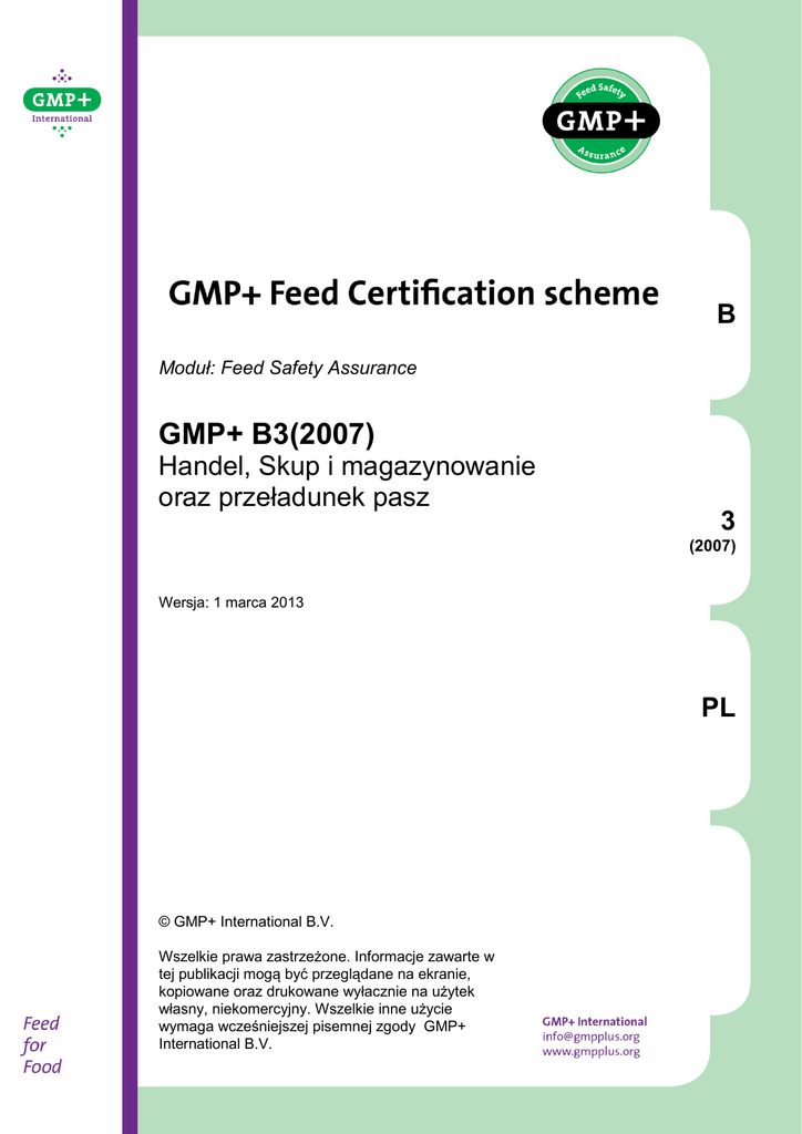 B Moduł: Feed Safety Assurance GMP+ B3(2007) Handel, Skup i magazynowanie oraz przeładunek pasz 3 (2007) Wersja: 1 marca 2013 PL © GMP+ International B.V. Wszelkie prawa zastrzeżone. Informacje zawarte w tej publikacji mogą być przeglądane na ekranie, kopiowane oraz drukowane wyłacznie na użytek własny, niekomercyjny. Wszelkie inne użycie wymaga wcześniejszej pisemnej zgody GMP+ International B.V. Historia dokumentu Przegląd nr. / Data akceptacji 0.0 / 09-2010 0.1 / 09-2011 dotyczy Data wdrożenia Całego dokumentu Całego dokumentu 1.1/1.2 01-01-2011 Różnych rozdziałów 01-01-2012 Dodanie wymogów dotyczących opakowań wielokrotnego użytku 5.2.4 01-01-2012 Zmiana wymogów wewnętrznego śledzenia produktów 5.4.1 01-01-2012 Przeniesienie wymogów oznakowania produktów nie certyfikowanych GMP+ do GMP+ BA6. Dodanie odnośników do wymogów oznakowania olejów i tłuszczów w GMP+ BA6. 7.1.7 01-01-2012 7.3.1 01-01-2012 7.2.2 01-01-2012 7.3.4 01-01-2012 7.3.3 Transport drogowy 01-01-2013 Cały dokument 01-03-2013 4.3 01-03-2013 Uczestnik musi otrzymać wystarczające informacje, aby zapewnić właściwe magazynowanie. 7.2.8 01-03-2014 Lista Paliw NIedozwolonych została zastąpiona odniesieniem do Paliw Niedozwolonych wymienionych w GMP+ Aneks 1 01-03-2013 Poprawka Przeniesienie dokumentu z PDV do GMP International Ogólna aktualizacja/informacja Aktualizacja wstępu Zmiany redakcyjne Uzupełnienie wymogów dla transportu pasz opakowanych. Odpowiedzialnośc uczestnika za dostarczenie przewoźnikowi wystarczających informacji o produkcie. Dokładniejszy opis wymogów kontroli na przyjęciu. 0.1 / 09-2011 0.2 / 11-2012 Dodatkowe działania związane z transportem śródlądowym drogami wodnymi. Wycofanie wymogów dotyczących korzystania z transportu nie certyfikowanego z tego dokumenty i umieszczenie ich w GMP+ BA10. Ponieważ GMP+ BA14 będzie wycofany do 01-03-2013, wszystkie odniesienia do GMP+BA14 są zastąpione odniesieniami do odpowiednich sekcji dokumentu Procedury na stronie internetowej IDTF. Korekta błędu GMP+ B3(2007) Handel, skup i magazynowanie oraz przeladunek pasz Wersja: 1 marca 2013 01-07-2011 01-01-2012 2/61 GMP+ International Przegląd nr. / Data akceptacji dotyczy Data wdrożenia Wymagania dla transportu pasz pakowanych zostały przeniesione z sekcji 7.3.1 I rozszerzone o wymagania dla użycia plombowanych jednostek ładunkowych. 7.3.3 01-03-2013 Nowe wprowadzenie oraz zmieniony tekst dotyczący Feed Certification scheme Cały dokument 01-03-2013 Poprawka BA3 Minimalne Wymogi Lista Negatywna, rozdział 5. GMP+ B3(2007) Handel, skup i magazynowanie oraz przeladunek pasz Wersja: 1 marca 2013 3/61 GMP+ International INDEKS 1 WPROWADZENIE .............................................................................................................. 6 1.1 1.2 1.3 1.4 1.5 2 INFORMACJE OGÓLNE .......................................................................................................... 6 STRUKTURA GMP+ FEED CERTIFICATION ......................................................................... 7 ZAKRES I ZASTOSOWANIE NINIEJSZEGO STANDARDU ......................................................... 7 STRUKTURA NINIEJSZEGO STANDARDU ............................................................................ 10 W YŁĄCZENIE WYMOGÓW ................................................................................................... 11 ODNOŚNIKI NORMATYWNE .......................................................................................... 13 2.1 2.2 DOKUMENTY GMP+ .......................................................................................................... 13 ZGODNOŚĆ Z PRAWEM ...................................................................................................... 13 3 TERMINY I DEFINICJE .................................................................................................... 14 4 SYSTEM BEZPIECZEŃSTWA PASZ.............................................................................. 15 4.1 ODPOWIEDZIALNOŚĆ KADRY KIEROWNICZEJ .................................................................... 15 4.2 OSOBA ODPOWIEDZIALNA ZA JAKOŚĆ ............................................................................... 15 4.3 W YMOGI DLA SYSTEMU BEZPIECZEŃSTWA PASZ .............................................................. 16 4.4 DOKUMENTACJA I REJESTRACJA ....................................................................................... 18 4.4.1 Dokumentacja i podręcznik jakości .......................................................................... 18 4.4.2 Administrowanie dokumentacją i danymi ................................................................ 18 5 PROGRAM WARUNKÓW WSTĘPNYCH....................................................................... 20 5.1 PERSONEL ......................................................................................................................... 20 5.1.1 Informacje ogólne ....................................................................................................... 20 5.1.2 Kompetencje i szkolenia ............................................................................................ 21 5.2 INFRASTRUKTURA .............................................................................................................. 22 5.2.1 Środowisko .................................................................................................................. 22 5.2.2 Powierzchnie produkcyjne i sprzęt ........................................................................... 22 5.2.3 Kontrola dostępu ......................................................................................................... 25 5.2.4 Inne wymogi ................................................................................................................ 25 5.3 KONSERWACJA I HIGIENA ....................................................................