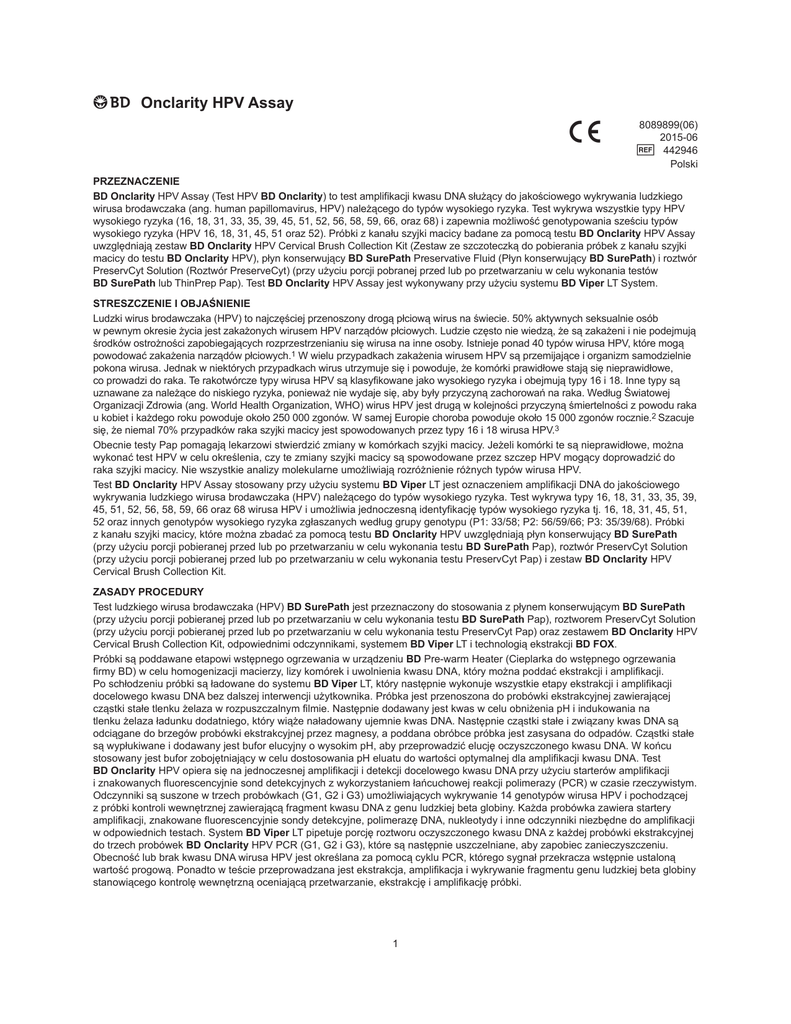 B Onclarity HPV Assay 8089899(06) 2015-06 442946 Polski PRZEZNACZENIE BD Onclarity HPV Assay (Test HPV BD Onclarity) to test amplifikacji kwasu DNA służący do jakościowego wykrywania ludzkiego wirusa brodawczaka (ang. human papillomavirus, HPV) należącego do typów wysokiego ryzyka. Test wykrywa wszystkie typy HPV wysokiego ryzyka (16, 18, 31, 33, 35, 39, 45, 51, 52, 56, 58, 59, 66, oraz 68) i zapewnia możliwość genotypowania sześciu typów wysokiego ryzyka (HPV 16, 18, 31, 45, 51 oraz 52). Próbki z kanału szyjki macicy badane za pomocą testu BD Onclarity HPV Assay uwzględniają zestaw BD Onclarity HPV Cervical Brush Collection Kit (Zestaw ze szczoteczką do pobierania próbek z kanału szyjki macicy do testu BD Onclarity HPV), płyn konserwujący BD SurePath Preservative Fluid (Płyn konserwujący BD SurePath) i roztwór PreservCyt Solution (Roztwór PreserveCyt) (przy użyciu porcji pobranej przed lub po przetwarzaniu w celu wykonania testów BD SurePath lub ThinPrep Pap). Test BD Onclarity HPV Assay jest wykonywany przy użyciu systemu BD Viper LT System. STRESZCZENIE I OBJAŚNIENIE Ludzki wirus brodawczaka (HPV) to najczęściej przenoszony drogą płciową wirus na świecie. 50% aktywnych seksualnie osób w pewnym okresie życia jest zakażonych wirusem HPV narządów płciowych. Ludzie często nie wiedzą, że są zakażeni i nie podejmują środków ostrożności zapobiegających rozprzestrzenianiu się wirusa na inne osoby. Istnieje ponad 40 typów wirusa HPV, które mogą powodować zakażenia narządów płciowych.1 W wielu przypadkach zakażenia wirusem HPV są przemijające i organizm samodzielnie pokona wirusa. Jednak w niektórych przypadkach wirus utrzymuje się i powoduje, że komórki prawidłowe stają się nieprawidłowe, co prowadzi do raka. Te rakotwórcze typy wirusa HPV są klasyfikowane jako wysokiego ryzyka i obejmują typy 16 i 18. Inne typy są uznawane za należące do niskiego ryzyka, ponieważ nie wydaje się, aby były przyczyną zachorowań na raka. Według Światowej Organizacji Zdrowia (ang. World Health Organization, WHO) wirus HPV jest drugą w kolejności przyczyną śmiertelności z powodu raka u kobiet i każdego roku powoduje około 250 000 zgonów. W samej Europie choroba powoduje około 15 000 zgonów rocznie.2 Szacuje się, że niemal 70% przypadków raka szyjki macicy jest spowodowanych przez typy 16 i 18 wirusa HPV.3 Obecnie testy Pap pomagają lekarzowi stwierdzić zmiany w komórkach szyjki macicy. Jeżeli komórki te są nieprawidłowe, można wykonać test HPV w celu określenia, czy te zmiany szyjki macicy są spowodowane przez szczep HPV mogący doprowadzić do raka szyjki macicy. Nie wszystkie analizy molekularne umożliwiają rozróżnienie różnych typów wirusa HPV. Test BD Onclarity HPV Assay stosowany przy użyciu systemu BD Viper LT jest oznaczeniem amplifikacji DNA do jakościowego wykrywania ludzkiego wirusa brodawczaka (HPV) należącego do typów wysokiego ryzyka. Test wykrywa typy 16, 18, 31, 33, 35, 39, 45, 51, 52, 56, 58, 59, 66 oraz 68 wirusa HPV i umożliwia jednoczesną identyfikację typów wysokiego ryzyka tj. 16, 18, 31, 45, 51, 52 oraz innych genotypów wysokiego ryzyka zgłaszanych według grupy genotypu (P1: 33/58; P2: 56/59/66; P3: 35/39/68). Próbki z kanału szyjki macicy, które można zbadać za pomocą testu BD Onclarity HPV uwzględniają płyn konserwujący BD SurePath (przy użyciu porcji pobieranej przed lub po przetwarzaniu w celu wykonania testu BD SurePath Pap), roztwór PreservCyt Solution (przy użyciu porcji pobieranej przed lub po przetwarzaniu w celu wykonania testu PreservCyt Pap) i zestaw BD Onclarity HPV Cervical Brush Collection Kit. ZASADY PROCEDURY Test ludzkiego wirusa brodawczaka (HPV) BD SurePath jest przeznaczony do stosowania z płynem konserwującym BD SurePath (przy użyciu porcji pobieranej przed lub po przetwarzaniu w celu wykonania testu BD SurePath Pap), roztworem PreservCyt Solution (przy użyciu porcji pobieranej przed lub po przetwarzaniu w celu wykonania testu PreservCyt Pap) oraz zestawem BD Onclarity HPV Cervical Brush Collection Kit, odpowiednimi odczynnikami, systemem BD Viper LT i technologią ekstrakcji BD FOX. Próbki są poddawane etapowi wstępnego ogrzewania w urządzeniu BD Pre-warm Heater (Cieplarka do wstępnego ogrzewania firmy BD) w celu homogenizacji macierzy, lizy komórek i uwolnienia kwasu DNA, który można poddać ekstrakcji i amplifikacji. Po schłodzeniu próbki są ładowane do systemu BD Viper LT, który następnie wykonuje wszystkie etapy ekstrakcji i amplifikacji docelowego kwasu DNA bez dalszej interwencji użytkownika. Próbka jest przenoszona do probówki ekstrakcyjnej zawierającej cząstki stałe tlenku żelaza w rozpuszczalnym filmie. Następnie dodawany jest kwas w celu obniżenia pH i indukowania na tlenku żelaza ładunku dodatniego, który wiąże naładowany ujemnie kwas DNA. Następnie cząstki stałe i związany kwas DNA są odciągane do brzegów probówki ekstrakcyjnej przez magnesy, a poddana obróbce próbka jest zasysana do odpadów. Cząstki stałe są wypłukiwane i dodawany jest bufor elucyjny o wysokim pH, aby przeprowadzić elucję oczyszczonego kwasu DNA. W końcu stosowany jest bufor zobojętniający w celu dostosowania pH eluatu do wartości optymalnej dla amplifikacji kwasu DNA. Test BD Onclarity HPV opiera się na jednoczesnej amplifikacji i detekcji docelowego kwasu DNA przy użyciu starterów amplifikacji i znakowanych fluorescencyjnie sond detekcyjnych z wykorzystaniem łańcuchowej reakcji polimerazy (PCR) w czasie rzeczywistym. Odczynniki są suszone w trzech probówkach (G1, G2 i G3) umożliwiających wykrywanie 14 genotypów wirusa HPV i pochodzącej z próbki kontroli wewnętrznej zawierającą fragment kwasu DNA z genu ludzkiej beta globiny. Każda probówka zawiera startery amplifikacji, znakowane fluorescencyjnie sondy detekcyjne, polimerazę DNA, nukleotydy i inne odczynniki niezbędne do amplifi