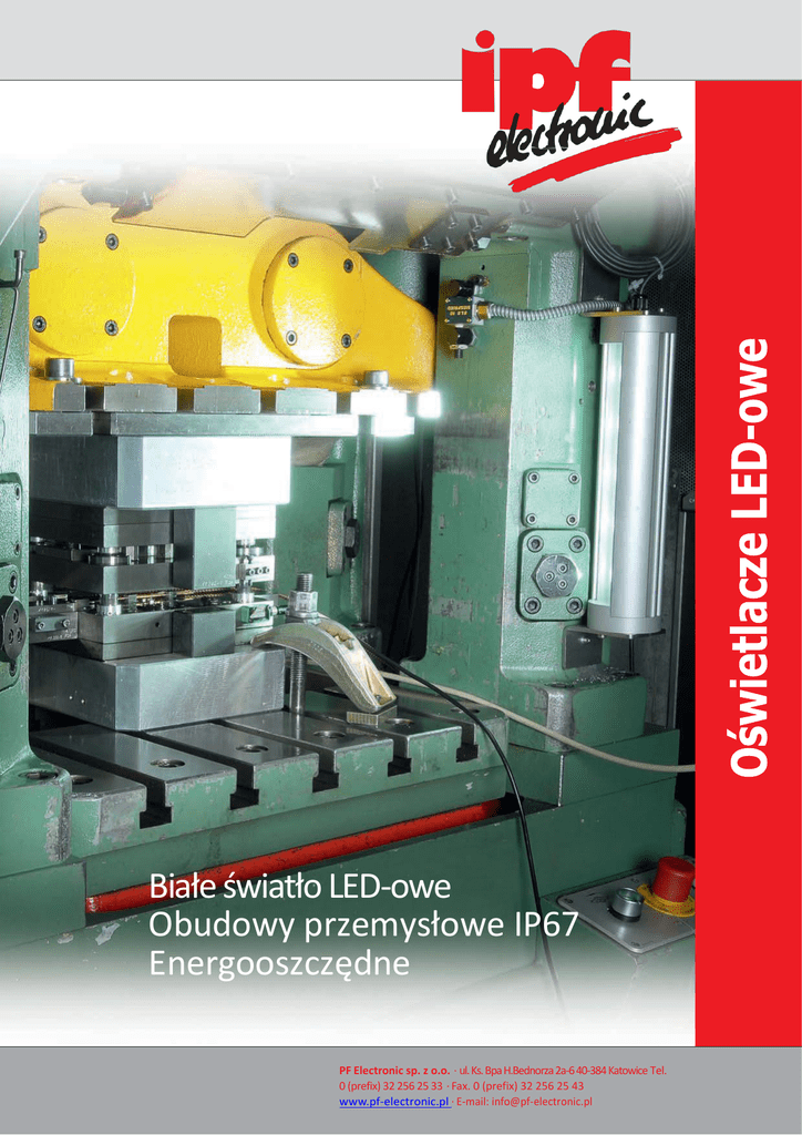 Białe światło LED-owe Obudowy przemysłowe IP67 Energooszczędne PF Electronic sp. z o.o. · ul. Ks. Bpa H.Bednorza 2a-6 40-384 Katowice Tel. 0 (prefix) 32 256 25 33 · Fax. 0 (prefix) 32 256 25 43 www.pf-electronic.pl · E-mail: [email protected] 2 Oświetlacze LED-owe Wysoka niezawodność Energooszczędność Wysoka jasność Elastyczne do różnych zastosowań Białe światło LED-owe Niska moc wejściowa Długa żywotność Metalowa obudowa Okrągła lub prostopadłościenna obudowa Łabędzia szyja Te solidne oświetlacze LED-owe są bardzo wszechstronne. Montaż może nastąpić bezpośrednio na maszynie lub też w pomieszczeniach biurowych. Obie lampy posiadają konektor M12 do podłączenia elektrycznego, napięcie dostarczane jest przez PIN 1(+24V DC, przewód brązowy ) i przez PIN 3(0V, przewód niebieski). Dodatkowo wyposażone są one w wejście sterujące wyłączeniem dostępu. Oświetlacze mogą być sterowane bezpośrednio z wyjścia PLC ponieważ pobór prądu jest pomiędzy 27 a 38 mA. Przy napięciu od +5,5 do +30V DC oświetlacz jest wyłączony. W przypadku dłuższych kabli (>2m) powinno być używane wejście sterujące z GND. Barwa światła: biała. Typ Artykułu Napięcie pracy Pobór prądu Ilość diod LED Kąt rozproszenia Wymiary Materiał (Przednia szyba) pf electronic sp. z o.o. ul. Ks. Bpa H.Bednorza 2a-6 40-484 Katowice AO000188 AO000189 10 ... 30V DC 27mA (24V DC) 3 22° M18x1 Luxacryl 2h 10 ... 30V DC 38mA (24V DC) 1 120° M18x1 Luxacryl 2h Tel. 0 (prefix) 32 356 25 33 Fax 0 (prefix) 32 256 25 43 www.pf-electronic.pl [email protected] Oświetlacze LED-owe Oświetlacze robocze giętkie dostępne są w różnych długościach i opcjach montażu. Wykonane są z wytrzymałego i odpornego na uderzenia tworzywa sztucznego, które jest również olejoodporne. Kąt świecenia wynosi 25°( w środowisku przyjaznym ok. Ø30 cm w odległości 50 cm). Lampka nadaje się do tokarek, frezarek, maszyn EDM, wykrawarek oraz formowania wtryskowego. Może być również stosowana jako lampka do stołów, ławek testowych lub oświetlenia mikroskopu. Lampka wyposażona jest w 3 wysokiej mocy diody LED. Wszelkie ciepło rozpraszane jest przez aluminiowy radiator z tyłu. Połączenie odbywa się za pomocą złącza M12. Lampka może być złączana i wyłączna za pomocą przycisku na podstawce. Typ Artykułu Napięcie pracy Moc wejściowa Pobór prądu Ilość diod LED Długość szyi Montaż Materiał (Przednia szyba) AO000345 AO000346 AO000347 AO000348 16 ... 36V AC/DC typ. 9W 400mA (przy 24V DC) 3 250mm Magnetyczny Hartowane szkło 16 ... 36V AC/DC typ. 9W 400mA (przy 24V DC) 3 250mm Płyta mocująca Hartowane szkło 16 ... 36V AC/DC typ. 9W 400mA (przy 24V DC) 3 500mm Magnetyczny Hartowane szkło 16 ... 36V AC/DC typ. 9W 400mA (przy 24V DC) 3 500mm Płyta mocująca Hartowane szkło Te wytrzymałe oprawy LED są przystosowane do montażu bezpośrednio na urządzeniu. Kwadratowa lampka AO000193 posiada okrągłą geometrie oświetlenia, natomiast podłużna lampka AO000194 posiada rozproszoną geometrię oświetlenia. Obie lampki posiadają konektor M12 połączenia elektrycznego. Zasilanie dostarczane jest poprzez PIN 4(+24V DC, czarny przewód) oraz PIN 3(0V, niebieski przewód) Światła mogą być sterowane bezpośrednio za pomocą PLC, ponieważ pobór prądu wynosi maksymalnie 250 mA. Lampy posiadają aktywne zarządzanie temperaturą służące do ochrony diod LED. Jeśli temperatura jest zbyt wysoka to moc regulowana jest odpowiednio w dół. Barwa światła to chłodna biel. Użyte materiały obudowy pozwalają na wykorzystanie tego oświetlenia w krytycznych środowiskach (np. chłodziwa i smary). Kwadratowa lampka posiada obudowę z aluminium natomiast podłużna z tworzywa sztucznego. Dzięki zastosowaniu technologii LED lampa osiąga żywotność ponad 50.000 godzin pracy. Regularna wymiana żarówek nie jest już konieczna. Typ Artykułu. AO000193 Napięcie pracy Moc wejściowa Pobór prądu Ilość diod LED Kąt rozproszenia Wymiary Materiał (Przednia szyba) pf electronic sp. z o.o 24V DC ± 25% 4W 150mA (24V DC) 3 120° 41x41x66mm Hartowane szkło ul. Ks. Bpa H. Bednorza 2a-6 40-384 Katowice Tel. 0 (prefix) 32 256 25 33 Fax 0 (prefix) 32 256 25 43 AO000194 24V DC ± 25% 6W 250mA (24V DC) 2 90° 120x25x23,5mm Podwójnie hartowane szkło 3 4 Oświetlacze LED-owe Ten wysokiej mocy oświetlacz LED AO000330 jest solidną, zwartą konstrukcją o dużej mocy świetlnej. Lampa nadaje się do oświetlania powierzchni obszaru roboczej maszyn i urządzeń. Zainstalowanie urządzenia możliwe jest przy użyciu uchwytu mocującego ze stali nierdzewnej lub za pomocą nakrętki kłowej. Niniejsze diodowe źródła światła mogą być wykorzystywane do tokarek, wiertarko-frezarek jak również wykrawarek. Lampa wyposażona jest w 6 diod LED dużej mocy, każda 1,5W. Ze względu na kąt świecenia 70° zostało osiągnięte równomierne oświetlenie powierzchni. Wszystkie uszczelnienia wykonane są za pomocą gumy Viton dzięki czemu został osiągnięty stopień ochrony IP67. Połączenie urządzenia odbywa się za pomocą złącza M12. Zacisk dodatni zasilania może być podłączony zarówno przez PIN 1(brązowy) jak i PIN4(czarny). Typ Artykułu AO000330 Napięcie pracy Moc wejściowa Pobór prądu Ilość diod LED Wymiary Materiał (Przednia szyba) 24V DC ±10% 9W 350mA (24V DC) 6 143x40x40mm Hartowane szkło Ta wysokiej mocy lampa LED cechuje się wytrzymałością, kompaktową obudową oraz wysoką wydajnością. Jasność światła jest stała nawet przy różnym napięciu zasilania. Dostępne są dwie wersje z 8° lub 38° kątami emisji. Solidna aluminiowa obudowa, utwardzana termicznie podkładka oraz specjalne kapsułkowanie w celu ochrony elektroniki umożliwiają wykorzystanie lampy w krytycznym środowisku (woda, chłodziwa i smary). Aktywny termiczny system zarządzania obniża pobór prądu w przypadku nadmiernego ciepła, np. w wysokich temperatu