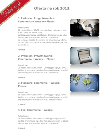 Oferta na rok 2013. 1. Exslusive: Przygotowania + Ceremonia + Wesele + Plener. Fotoalbum: 20 rozkładówek, 30x30 cm, okładka z naturalnej skóry + 450 zdjęć na płycie DVD. Wideoprezentacja z podkładem dźwiękowym ze zdjęć albumowych w rozdzielczości HD oraz FullHD. W zestawie kaseta drewniana na fotoalbum, pudełko LUX na płyty DVD obite w tkaniny introligatoryjne lub z eco-skórę. 4900 zł 2. Premium: Przygotowania + Ceremonia + Wesele + Plener. Fotoalbum: 20 rozkładówek 30x30 cm + 250 zdjęć na płycie DVD. Wideo prezentacja z podkładem dźwiękowym ze zdjęć albumowych w rozdzielczości HD oraz FullHD. 3600 zł 3. Standard: Ceremonia + Wesele + Plener. Fotoalbum: 15 rozkładówek 30x30 cm + 250 zdjęć na płycie DVD. Wideo prezentacja z podkładem dźwiękowym ze zdjęć albumowych w rozdzielczości HD oraz w FullHD. 3200 zł 4. Eko: Ceremonia + Wesele. Fotoalbum: 10 rozkładówek 20x20 cm + 150 zdjęć na płycie DVD. Wideo prezentacja z podkładem dźwiękowym ze zdjęć albumowych w rozdzielczości HD oraz FullHD. 2200 zł 1 Oferta na rok 2013. 5. Plener Ślubny. Fotoalbum: 10 rozkładówek 20x20 cm + 50 zdjęć na płycie DVD. 1400 zł 6. Ślub Kościelny. Fotoalbum: 10 rozkładówek 20x20 cm + 100 zdjęć na płycie DVD. 1200 zł 7. Ślub Cywilny. Fotoalbum: 10 rozkładówek 15x15 cm + ok. 100 zdjęć na płycie DVD. 900 zł www.slubniacy.pl | tel. 501 170 236 2 Oferta na rok 2013. Dodatki: Fotoalbumy: Ilość rozkładówek Rozmiar Cena 20 30x30 cm 500 zł 20 20x20 cm 400 zł 10 30x30 cm 350 zł 10 20x20 cm 220 zł Okładka Rozmiar CD Rozmiar DVD 1 płyta ECO 20 zł 30 zł 2 płyty ECO 25 zł 35 zł 1 płyta LUX 60 zł 70 zł 2 płyty LUX 65 zł 75 zł Okładki wykonane są ze skóry ekologicznej, tkaniny introligatoryjnej oraz skóry naturalnej. W przypadku zamiany dodatkowego fotoalbumu na fotoksiążkę – 50 % na każdy album. W przypadku wybrania okładki ze skóry naturalnej: + 150 zł do każdego albumu. Wykończenie albumów: - Okładka z gąbką: 0 zł. Papier metallic: +5 zł/rozkładówka Zaokrąglanie rogów kartek: +10 zł Stempel: +5 zł Okucia okładki: +5 zł Grawerowanie: napis 15 zł, wzór 40 zł. www.slubniacy.pl | tel. 501 170 236 3 Oferta na rok 2013. Opakowania na albumy: - Etui (od 15x15 cm do 20x20 cm): 60 zł Etui (od 20x30 cm do 30x40 cm): 80 zł Kaseta drewniana 30x45 cm: 79 zł Kaseta drewniana 30x30 cm: 49 zł Kaseta drewniana 20x30 cm: 45 zł Kaseta drewniana 20x20 cm: 39 zł Pudełko ekskluzywne 20x20 cm: 15 zł Pudełko ekskluzywne 30x30 cm: 19 zł Opakowanie Prestige 119 zł. Więcej rozmiarów wraz ze wzorami okładek znajdują się na naszej stronie: http://www.slubniacy.pl/fotoalbumy Usługi dodatkowe: Makijaże: Para Młoda: Makijaż testowy: 150 zł Makijaż główny: 450 zł Pan Młody: Gratis Dodatkowe osoby: Kobiety: 150 zł/osoba. Mężczyźni: 50 zł/osoba. www.slubniacy.pl | tel. 501 170 236 4