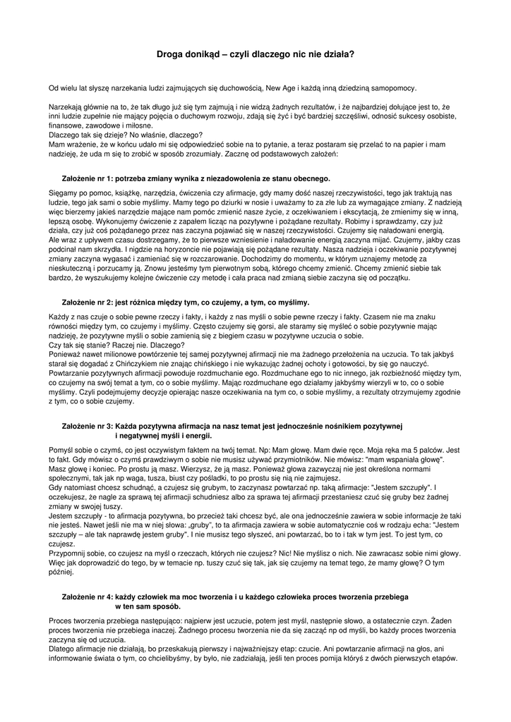 Droga donikąd – czyli dlaczego nic nie działa? Od wielu lat słyszę narzekania ludzi zajmujących się duchowością, New Age i każdą inną dziedziną samopomocy. Narzekają głównie na to, że tak długo już się tym zajmują i nie widzą żadnych rezultatów, i że najbardziej dołujące jest to, że inni ludzie zupełnie nie mający pojęcia o duchowym rozwoju, zdają się żyć i być bardziej szczęśliwi, odnosić sukcesy osobiste, finansowe, zawodowe i miłosne. Dlaczego tak się dzieje? No właśnie, dlaczego? Mam wrażenie, że w końcu udało mi się odpowiedzieć sobie na to pytanie, a teraz postaram się przelać to na papier i mam nadzieję, że uda m się to zrobić w sposób zrozumiały. Zacznę od podstawowych założeń: Założenie nr 1: potrzeba zmiany wynika z niezadowolenia ze stanu obecnego. Sięgamy po pomoc, książkę, narzędzia, ćwiczenia czy afirmacje, gdy mamy dość naszej rzeczywistości, tego jak traktują nas ludzie, tego jak sami o sobie myślimy. Mamy tego po dziurki w nosie i uważamy to za złe lub za wymagające zmiany. Z nadzieją więc bierzemy jakieś narzędzie mające nam pomóc zmienić nasze życie, z oczekiwaniem i ekscytacją, że zmienimy się w inną, lepszą osobę. Wykonujemy ćwiczenie z zapałem licząc na pozytywne i pożądane rezultaty. Robimy i sprawdzamy, czy już działa, czy już coś pożądanego przez nas zaczyna pojawiać się w naszej rzeczywistości. Czujemy się naładowani energią. Ale wraz z upływem czasu dostrzegamy, że to pierwsze wzniesienie i naładowanie energią zaczyna mijać. Czujemy, jakby czas podcinał nam skrzydła. I nigdzie na horyzoncie nie pojawiają się pożądane rezultaty. Nasza nadzieja i oczekiwanie pozytywnej zmiany zaczyna wygasać i zamieniać się w rozczarowanie. Dochodzimy do momentu, w którym uznajemy metodę za nieskuteczną i porzucamy ją. Znowu jesteśmy tym pierwotnym sobą, którego chcemy zmienić. Chcemy zmienić siebie tak bardzo, że wyszukujemy kolejne ćwiczenie czy metodę i cała praca nad zmianą siebie zaczyna się od początku. Założenie nr 2: jest różnica między tym, co czujemy, a tym, co myślimy. Każdy z nas czuje o sobie pewne rzeczy i fakty, i każdy z nas myśli o sobie pewne rzeczy i fakty. Czasem nie ma znaku równości między tym, co czujemy i myślimy. Często czujemy się gorsi, ale staramy się myśleć o sobie pozytywnie mając nadzieję, że pozytywne myśli o sobie zamienią się z biegiem czasu w pozytywne uczucia o sobie. Czy tak się stanie? Raczej nie. Dlaczego? Ponieważ nawet milionowe powtórzenie tej samej pozytywnej afirmacji nie ma żadnego przełożenia na uczucia. To tak jakbyś starał się dogadać z Chińczykiem nie znając chińskiego i nie wykazując żadnej ochoty i gotowości, by się go nauczyć. Powtarzanie pozytywnych afirmacji powoduje rozdmuchanie ego. Rozdmuchane ego to nic innego, jak rozbieżność między tym, co czujemy na swój temat a tym, co o sobie myślimy. Mając rozdmuchane ego działamy jakbyśmy wierzyli w to, co o sobie myślimy. Czyli podejmujemy decyzje opierając nasze oczekiwania na tym co, o sobie myślimy, a rezultaty otrzymujemy zgodnie z tym, co o sobie czujemy. Założenie nr 3: Każda pozytywna afirmacja na nasz temat jest jednocześnie nośnikiem pozytywnej i negatywnej myśli i energii. Pomyśl sobie o czymś, co jest oczywistym faktem na twój temat. Np: Mam głowę. Mam dwie ręce. Moja ręka ma 5 palców. Jest to fakt. Gdy mówisz o czymś prawdziwym o sobie nie musisz używać przymiotników. Nie mówisz: "mam wspaniała głowę". Masz głowę i koniec. Po prostu ją masz. Wierzysz, że ją masz. Ponieważ głowa zazwyczaj nie jest określona normami społecznymi, tak jak np waga, tusza, biust czy pośladki, to po prostu się nią nie zajmujesz. Gdy natomiast chcesz schudnąć, a czujesz się grubym, to zaczynasz powtarzać np. taką afirmacje: "Jestem szczupły". I oczekujesz, że nagle za sprawą tej afirmacji schudniesz albo za sprawa tej afirmacji przestaniesz czuć się gruby bez żadnej zmiany w swojej tuszy. Jestem szczupły - to afirmacja pozytywna, bo przecież taki chcesz być, ale ona jednocześnie zawiera w sobie informacje że taki nie jesteś. Nawet jeśli nie ma w niej słowa: „gruby”, to ta afirmacja zawiera w sobie automatycznie coś w rodzaju echa: "Jestem szczupły – ale tak naprawdę jestem gruby". I nie musisz tego słyszeć, ani powtarzać, bo to i tak w tym jest. To jest tym, co czujesz. Przypomnij sobie, co czujesz na myśl o rzeczach, których nie czujesz? Nic! Nie myślisz o nich. Nie zawracasz sobie nimi głowy. Więc jak doprowadzić do tego, by w temacie np. tuszy czuć się tak, jak się czujemy na temat tego, że mamy głowę? O tym później. Założenie nr 4: każdy człowiek ma moc tworzenia i u każdego człowieka proces tworzenia przebiega w ten sam sposób. Proces tworzenia przebiega następująco: najpierw jest uczucie, potem jest myśl, następnie słowo, a ostatecznie czyn. Żaden proces tworzenia nie przebiega inaczej. Żadnego procesu tworzenia nie da się zacząć np od myśli, bo każdy proces tworzenia zaczyna się od uczucia. Dlatego afirmacje nie działają, bo przeskakują pierwszy i najważniejszy etap: czucie. Ani powtarzanie afirmacji na głos, ani informowanie świata o tym, co chcielibyśmy, by było, nie zadziałają, jeśli ten proces pomija któryś z dwóch pierwszych etapów. Założenie nr 5: czuciem nie da się manipulować. Jeśli coś czujesz, to czujesz to i koniec. Jeśli czujesz się gruby, a chciałbyś poczuć się szczupły, już wiesz, że proces tworzenia zaczyna się od czucia. Aby schudnąć, najpierw musisz prawdziwie i sam z siebie poczuć, że jesteś szczupły, by potem to uczucie zaczęło formułować się w myśl. Dopiero potem ta myśl staje się na tyle silna i wystarczająco natrętna, że udaje nam się ją świadomie wyłowić z morza naszych myśli i wyartykułować. Gdy już mówimy o sobie jako 