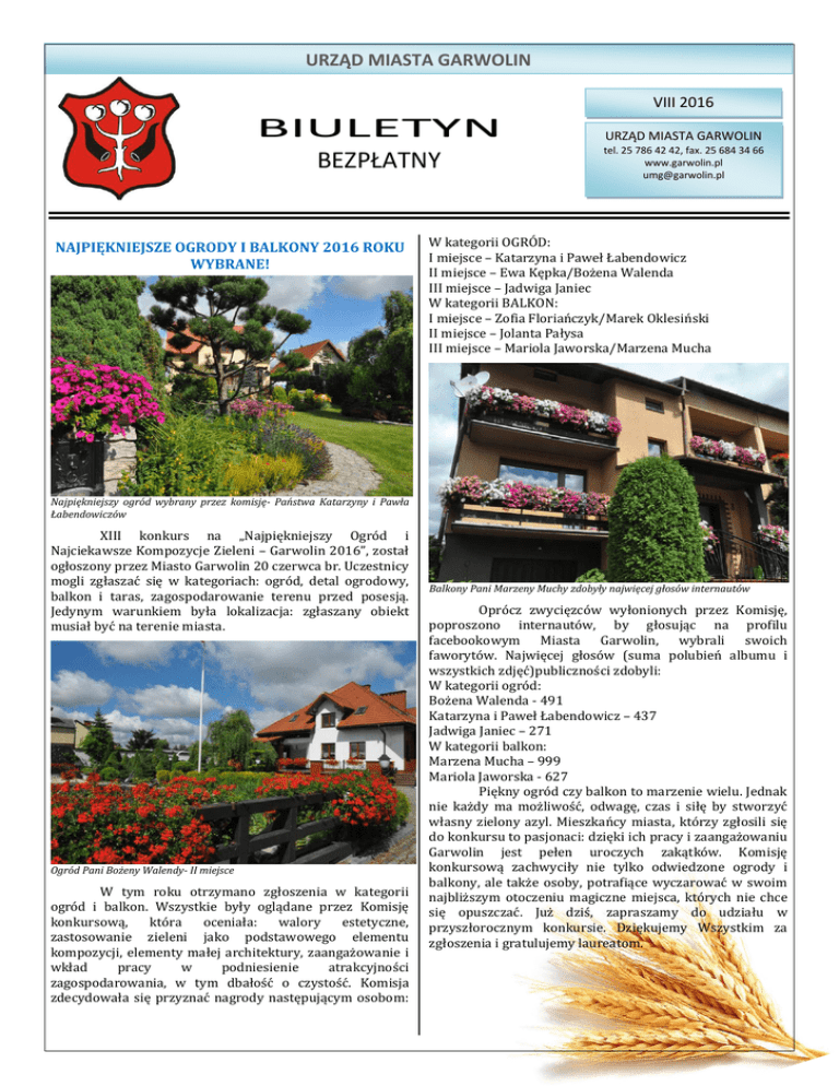 URZĄD MIASTA GARWOLIN VIII 2016 BIULETYN BEZPŁATNY NAJPIĘKNIEJSZE OGRODY I BALKONY 2016 ROKU WYBRANE! URZĄD MIASTA GARWOLIN tel. 25 786 42 42, fax. 25 684 34 66 www.garwolin.pl [email protected] W kategorii OGRÓD: I miejsce – Katarzyna i Paweł Łabendowicz II miejsce – Ewa Kępka/Bożena Walenda III miejsce – Jadwiga Janiec W kategorii BALKON: I miejsce – Zofia Floriańczyk/Marek Oklesiński II miejsce – Jolanta Pałysa III miejsce – Mariola Jaworska/Marzena Mucha Najpiękniejszy ogród wybrany przez komisję- Państwa Katarzyny i Pawła Łabendowiczów XIII konkurs na „Najpiękniejszy Ogród i Najciekawsze Kompozycje Zieleni – Garwolin 2016”, został ogłoszony przez Miasto Garwolin 20 czerwca br. Uczestnicy mogli zgłaszać się w kategoriach: ogród, detal ogrodowy, balkon i taras, zagospodarowanie terenu przed posesją. Jedynym warunkiem była lokalizacja: zgłaszany obiekt musiał być na terenie miasta. Ogród Pani Bożeny Walendy- II miejsce W tym roku otrzymano zgłoszenia w kategorii ogród i balkon. Wszystkie były oglądane przez Komisję konkursową, która oceniała: walory estetyczne, zastosowanie zieleni jako podstawowego elementu kompozycji, elementy małej architektury, zaangażowanie i wkład pracy w podniesienie atrakcyjności zagospodarowania, w tym dbałość o czystość. Komisja zdecydowała się przyznać nagrody następującym osobom: Balkony Pani Marzeny Muchy zdobyły najwięcej głosów internautów Oprócz zwycięzców wyłonionych przez Komisję, poproszono internautów, by głosując na profilu facebookowym Miasta Garwolin, wybrali swoich faworytów. Najwięcej głosów (suma polubień albumu i wszystkich zdjęć)publiczności zdobyli: W kategorii ogród: Bożena Walenda - 491 Katarzyna i Paweł Łabendowicz – 437 Jadwiga Janiec – 271 W kategorii balkon: Marzena Mucha – 999 Mariola Jaworska - 627 Piękny ogród czy balkon to marzenie wielu. Jednak nie każdy ma możliwość, odwagę, czas i siłę by stworzyć własny zielony azyl. Mieszkańcy miasta, którzy zgłosili się do konkursu to pasjonaci: dzięki ich pracy i zaangażowaniu Garwolin jest pełen uroczych zakątków. Komisję konkursową zachwyciły nie tylko odwiedzone ogrody i balkony, ale także osoby, potrafiące wyczarować w swoim najbliższym otoczeniu magiczne miejsca, których nie chce się opuszczać. Już dziś, zapraszamy do udziału w przyszłorocznym konkursie. Dziękujemy Wszystkim za zgłoszenia i gratulujemy laureatom. URZĄD MIASTA GARWOLIN UCZNIOWIE ZESPOŁU SZKÓŁ NR 5 DOCZEKAJĄ SIĘ HALI SPORTOWEJ NA MIARĘ XXI WIEKU! W dniu 23 sierpnia br. Burmistrz Miasta podpisał umowę na budowę hali sportowej przy Zespole Szkół Nr 5 Wykonawca – garwolińską firmą „Rembud”, wybuduje obiekt za 5 934 328 zł. Termin oddania do użytku to 16 sierpnia 2018 r., z tego wynika że dzieci z Zespołu Szkół Nr 5 będą mogły korzystać z nowej hali w roku szkolnym 2018/2019. 2 Nim roboty wejdą w decydujący etap prac budowlanych, wykonawca zobowiązany jest do przeprowadzenia rozbiórki stacji transformatorowej, wykonania przebudowy istniejących przyłączy a także wykonania wewnętrznych dróg dojazdowych. Obiekty tej skali co hala sportowa czy basen, dla każdego miasta są istotnymi elementami przyczyniającymi się do zrównoważonego rozwoju całości organizmu miejskiego. Poza pełnieniem swoich podstawowych funkcji współtworzą one przestrzeń publiczną, która jest dobrem wspólnym mieszkańców. Dzięki tej inwestycji kolejne pokolenia będą mogły rozwijać swoje pasje i talenty sportowe. TRWA BUDOWA ZBIORNIKA RETENCYJNEGO Podpisanie umowy z firmą Rembud, od lewej: Zastępca Burmistrza Miasta Maria Perek, właściciel firmy Rembud Kazimierz Jasiński, Burmistrz Miasta Tadeusz Mikulski i Skarbnik Miasta Katarzyna Nozdryn-Płotnicka Nowoczesny obiekt sportowy który powstanie przy ulicy Korczaka, będzie wyposażony w pełnowymiarowe boiska do koszykówki, siatkówki i piłki ręcznej. Hala posłuży także miłośnikom unihokeja i tenisa ziemnego. Projektanci hali pomyśleli także o publiczności, dla której przygotowano trybuny z 298 miejscami. Będzie to kolejne miejsce na mapie Garwolina pozwalające przeprowadzać zawody sportowe o zasięgu regionalnym i ogólnopolskim. Dzięki zamontowaniu kurtyn przesuwnych, główne boisko sportowe o wymiarze 22,13 m x 44,51 m będzie można podzielić na trzy pola treningowe. Na parterze budynku przewidziano również salę gimnastyki korekcyjnej, siłownię, szatnie, magazyny sprzętu sportowego i pomieszczenia techniczne. Nowa hala będzie połączona z istniejącym budynkiem szkoły za pomocą łącznika na poziomie I piętra. Obiekt będzie w pełni przystosowany do korzystania przez osoby niepełnosprawne. Zbiornik retencyjny został zlokalizowany na prawym brzegu rzeki Wilgi na wysokości Leszczyn Starych. Powstanie blisko wschodniej granicy miasta Garwolin, gdzie brzegi rzeki są nieuregulowane, a rzeka ma charakter meandrujący. Celem planowanego przedsięwzięcia jest stworzenie możliwości retencyjnych dla przechwycenia części wód w rzece Wilga niemieszczących się w korycie rzeki podczas wezbrań powyżej terenu miasta. I etap inwestycji- wykonanie rowów opaskowych został przeprowadzony w 2014-2015 roku, obecnie trwa kolejny etap prac: wykonanie części czaszy zbiornika, urządzeń zrzutu wody i budowa drogi dojazdowej. Zgodnie z planem prace II etapu mają się zakończyć w październiku 2016 r. URZĄD MIASTA GARWOLIN ŚWIATOWE DNI MŁODZIEŻY W GARWOLINIEPODSUMOWANIE W ramach Światowych Dni Młodzieży, które odbyły się w Krakowie w dniach 26-31 lipca br. zorganizowano wydarzenie poprzedzające: Dni w Diecezjach. Miasto Garwolin również zaangażowało się w tą akcję. Gościliśmy 7 pielgrzymów z Czadu, 50 z USA, 45 z Rosji, 6 z Finlandii i 8 z Islandii , których przyjęły pod swój dach garwolińskie rodziny. Przyjechali w środę 20 lipca wieczorem, a w poniedz