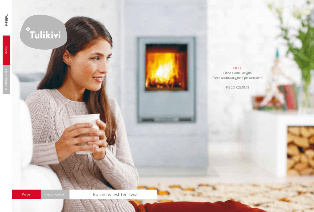 Tulikivi Piece Pieco kominki Piece Piece akumulacyjne Piece akumulacyjne z piekarnikiem Pieco kominki Piece Pieco kominki Bo zimny jest ten świat. Piec Dom powinien być ciepłym i przytulnym miejscem. Najlepiej jest kiedy wchodząc do niego serdecznie nas wita ciepłem, które rozgrzewa nie tylko ciało, ale i duszę. Ciepło, które nie jest nieprzyjemnie gorącym, lecz przechodzącym przez nasze ciało dostarczając pozytywnej energii. Nazywamy je Komfortowym Ciepłem Tulikivi. Jego unikalna i niepowtarzalna technologia nie jest jego jedyną zaletą, ważnym aspektem jest również nowoczesny desing, który odgrywa ważną rolę w naszej filozofii. www.tulikivi.com · www.facebook.com/tulikivi · www.twitter.com/tulikivi · www.plus.google.com · www.pinterest.com/tulikivi · www.youtube.com/user/tulikivioyj Zdolności w adaptacji wnętrza wraz z nowoczesnym designem naszej szerokiej gamy modeli. 15 Innowacja Tulikivi: to komfortowe ciepło Komfort i ciepło możesz teraz zobaczyć i poczuć, ciepło Tulikivi rozchodzi się równomiernie, poprawiając klimat w pomieszczeniu oraz rozpieszczając skórę. Serce wykonane z czystego steatytu Steatyt z kamieniołomów Tulikivi jest znany ze swojej jakości. Steatyt jest skałą wulkaniczną o bardzo wysokiej gęstości (3000 kg/m3), w jego skład wchodzą: talk, magnezyt i chloryt. Steatyt Tulikivi przewodzi ciepło 8 do 9 razy lepiej niż inne materiały stosowane w systemach grzewczych. Szybko się rozgrzewa oraz jest odporny na działanie rozpuszczalników i kwasów, a jego powierzchnia ze względu na wysoką zawartość talku jest odporna na wysokie temperatury. Również dzięki obecności talku efektywnie ogrzewa pozostając bezpiecznym w dotyku, oraz łatwym w czyszczeniu. Tulikivi jest jedynym producentem pieców, który regularnie poddaje testom swój materiał skalny w Instytucie Biologicznym w Rosenheim. Steatyt jest bezpiecznym materiałem, dla instalatora oraz użytkownika. 3 Zasada przeciwprądu Wszystkie piece akumulacyjne Tulikivi funkcjonują według zasady przeciwprądu, która umożliwia efektywne wykorzystanie energii gorących gazów spalinowych. Płomienie z komory paleniska wznoszą się do górnej komory spalania, gdzie rozdzielają się do bocznych kanałów, w których powstałą energię wchłaniają powierzchnie wewnętrzne. Zasada przeciwprądu zapewnia wysoki współczynnik sprawności jak również niską i bezpieczną temperaturę gazów spalinowych w kominie. I co najważniejsze; od 1do 4 godzin palenia wystarcza na 12 do 24 godzin oddawania ciepła przez piec. Czyste i efektywne spalanie Niezwykłe właściwości steatytu dają idealne możliwości do magazynowania dużych ilości ciepła. Zasada przeciwprądu z wysoko rozwiniętą komorą spalania umożliwia czyste oraz efektywne spalanie jak również wysoki współczynnik sprawności. Niskie temperatury spalin panujące u wejścia do komina oznaczają, że większość ciepła pozostaje w domu. A zasoby naturalne przyrody są w ten sposób chronione. 17:30 19:30 21:30 24:00 06:00 08:00 10:00 16:00 Za gorąco Przyjemnie Chłodno Za gorąco Przyjemnie Chłodno Jak często, dziennie chcą Państwo palić w piecu? Powyżej porównanie temperatury pomieszczenia z zastosowaniem różnych systemów grzewczych. W górnym pomieszczeniu znajduje się piec akumulacyjny Tulikivi, a w dolnym klasyczny kominek. Przyjemne zdrowe ciepło prawidłowo dobranego wielkością pieca Tulikivi emitowane jest do około 24 godzin. 4 5 Co to jest komfortowe ciepło naszych pieców? To cud Steatytowe serce zatrzymuje w sobie maksymalną ilość ciepła, którą pomału oddaje do otoczenia. Od poczucia odpowiedzialności Nowa Green technologia wykorzystująca i efektywnie optymalizująca ciepło, która nic po sobie nie pozostawia z wyjątkiem niższych rachunków za ogrzewanie. To piękno Elegancki, nowoczesny design i adaptacyjna powierzchnia pieca Tulikivi zaszczyci i wzbogaci każde wnętrze. 6 7 Zdrowe komfortowe ciepło 21 °C 19 °C 18 °C Przyjemne i komfortowe ciepło emitowane przez piec Tulikivi rozprzestrzenia się po całym pomieszczeniu, otaczając zarówno ludzi jaki i przedmioty. Gdy temperatura powietrza nie jest nadmiernie wysoka powietrze jest świeże i można swobodnie oddychać. Ciepło samo w sobie nie wystarcza do trwałego z achowania równowagi. Musimy również myśleć o przyszłości, a jakość powietrza którym oddychamy w domu odgrywa kluczową rolę. Stopniowo uwalniane ciepło z pieca akumulacyjnego Tulikivi charakteryzuje się 2-4 krotnie niższą wartością cyrkulacji powietrza w porównaniu do ciepła konwekcyjnego. Metalowe zakurzone powierzchnie emitują suche i niezdrowe ciepło konwekcyjne, które utrzymuje w domu niezdrowy i nieprzyjazny klimat. Zdrowe i naturalne ciepło w przyjemny sposób ogrzewa dom, a świeże powietrze pozwala o wiele łatwiej zachować zdrowie i pozytywną energię w domu na długi czas. 25 °C 20 °C 17 °C Ciepło konwekcyjne tradycyjnego kominka gromadzi się w górnej części pomieszczenia, oraz tworzy gorący i mniej przyjemny klimat wokół swego źródła. Ciepło nie jest także akumulowane, a jego większość uchodzi do komina. 8 9 hiisi 2 Nisko emisyjny Hiisi jest piecem Hybrydowym, w którym steatyt akumuluje i powoli uwalnia przyjemne, komfortowe ciepło. Czytaj więcej na www.tulikivi.com 10 Hiisi W 21 wieku, jest bardzo popularny szczególnie wśród architektów wnętrz. Smukły kształt i lekkość struktury powierzchni idealnie pasuje do każdego nowoczesnego wnętrza. 11 hiisi 4 Hiisi 4 Piece te cechują się prostą formą linii: nie ma widocznych otworów powietrza oraz wyczystek. Hiisi 4, biały Aranżacja wnętrz ciągle się zmienia. Powłoka Tulikivi Color otwiera nową a lternatywę oraz pobudza zainstalowane modele do nowego życia. 12 13 hiisi 5 Hiisi 5 Gładko polerowana powierzchnia nadaje modelowi Hiisi 5 subtelnie elegancki wygląd. Model ten jest standardowo wyposażony w duże dr