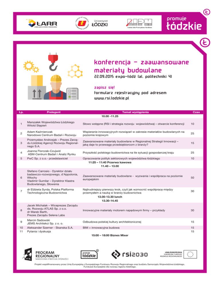 konferencja - zaawansowane materiały budowlane 22.09.2015 expo-łódź (al. politechniki 4) zapisz się! formularz rejestracyjny pod adresem www.rsi.lodzkie.pl Lp. Prelegent Temat wystąpienia Czas 10.00 -11.25 1 Marszałek Województwa Łódzkiego Witold Stępień Słowo wstępne (RSI i strategia rozwoju województwa) – otwarcie konferencji 10 2 Adam Kaźmierczak Narodowe Centrum Badań i Rozwoju Wspieranie innowacyjnych rozwiązań w zakresie materiałów budowlanych na poziomie krajowym 25 3 Przemysław Andrzejak – Prezes Zarządu Łódzkiej Agencji Rozwoju Regionalnego S.A. Zaawansowane materiały budowlane w Regionalnej Strategii Innowacji – jaką daje to przewagę przedsiębiorcom z branży? 15 4 Joanna Florczak-Czujwid ASM-Centrum Badań i Analiz Rynku Przyszłość polskiego budownictwa na tle sytuacji gospodarczej kraju 25 5 PwC Sp. z o.o.- przedstawiciel Opracowanie polityk sektorowych województwa łódzkiego 11:25 – 11:40 Przerwa kawowa 11.40 – 13.00 10 6 Stefano Carrosio - Dyrektor działu badawczo-rozwojowego, d‘Appolonia, Włochy Vladimir Gumilar – Dyrektror Klastra Budowlanego, Słowenia Zaawansowane materiały budowlane - wyzwania i współpraca na poziomie europejskim 50 7 dr Elżbieta Syrda, Polska Platforma Technologiczna Budownictwa Najtrudniejszy pierwszy krok, czyli jak wzmocnić współpracę między przemysłem a nauką w branży budownictwa 30 13.00-13.30 lunch 13.30-14.45 8 Jacek Michalak – Wiceprezes Zarządu ds. Rozwoju ATLAS Sp. z o.o. dr Marek Barth, Prezes Zarządu Selena Labs Innowacyjne materiały motorem napędowym firmy – przykłady 30 9 Marcin Sadowski JEMS Architekci Sp. z o. o. Odbudowa polskiej kultury architektonicznej 15 10 11 Aleksander Szerner - Skanska S.A. Pytania i dyskusja BIM = innowacyjna budowa 15 15 15:00 – 18:00 Biznes Mixer Projekt współfinansowany przez Unię Europejską z Europejskiego Funduszu Rozwoju Regionalnego oraz budżetu Samorządu Województwa Łódzkiego. Fundusze Europejskie dla rozwoju regionu łódzkiego.