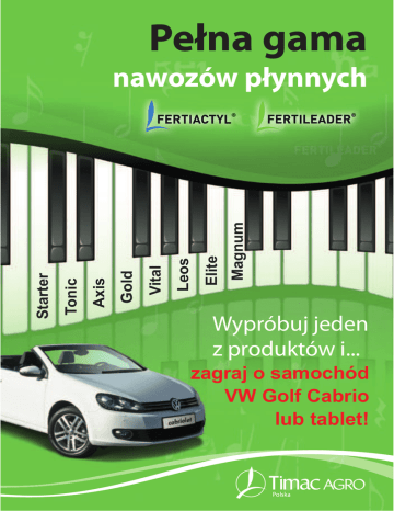 Pełna gama Magnum Elite Leos Vital Gold Axis Tonic Starter nawozów płynnych Wypróbuj jeden z produktów i... zagraj o samochód VW Golf Cabrio lub tablet! Pełna gama nawozów płynnych 1. FERTIACTYL STARTER FERTIACTYL STARTER należy stosować w początkowej fazie wzrostu: wpływa na lepsze ukorzenienie się kiełkujących i młodych roślin, poprawia przyswajalność składników pokarmowych i wzmacnia rośliny, stymuluje rozwój systemu korzeniowego. 2. FERTILEADER TONIC Przeznaczony do stosowania w uprawie zbóż. Zalecany do stosowania wiosną w fazie krzewienia. Zawiera miedź i mangan, ważne mikroelementy wpływające na żywotność pyłku, sztywność łodyg oraz wykorzystanie azotu. 3. FERTILEADER GOLD-BMo Przeznaczony do stosowania w uprawach wymagających zasilania borem i molibdenem, takich jak: rzepak, burak, warzywa, sady. Wpływa na lepsze kwitnienie i transport cukrów, zwiększając plonowanie. 4. FERTILEADER VITAL-954 Produkt stosuje się podczas całego okresu wegetacji, w celu poprawy syntezy i magazynowania białek oraz cukrów w organach generatywnych. Jest optymalnym dodatkiem gwarantującym plon i wysoką jakość wszystkich upraw. 5. FERTILEADER ELITE Dzięki wysokiej zawartości wapnia jest optymalnym dodatkiem gwarantującym plon i wysoką jakość upraw sadowniczych i warzywniczych. Wpływa także na poprawę warunków przechowalniczych plonów. 6. FERTILEADER LEOS Działa antystresowo i podnosi odporność roślin. Bogaty w bor i cynk. Stymuluje podziały komórkowe, fotosyntezę oraz sprzyja rozwojowi pąków kwiatowych. 7. FERTILEADER AXIS Dostarcza azot, fosfor, cynk i mangan niezbędny w generatywnych fazach rozwojowych roślin. Zapobiega stresom, podnosi odporność. Zapewnia właściwe zaopatrzenie w energię. Gwarantuje optymalne wykorzystanie potencjału roślin. 8. FERTILEADER MAGNUM To szybkie dostarczenie roślinie magnezu i azotu w sytuacji zwiększonego zapotrzebowania. Dzięki jego zastosowaniu wzrasta efektywność procesu fotosyntezy. Magnez jako składnik pokarmowy przyczynia się do prawidłowej absorpcji azotu. zboża rzepak kukurydza buraki cukrowe ziemniaki warzywa owoce Nawozy płynne Timac Agro zawierają kompleks SEACTIV - naturalne ekstrakty z alg morskich stymulujące aktywność fizjologiczną roślin oraz ograniczające ich stres. Kup co najmniej 40 lQDZR]yZSá\QQ\FK REMĊW\FKSURPRFMąLZ\JUDM ZVSDQLDá\VDPRFKyGRVRERZ\ ZVSDQLD VW Golf Cabrio ]EDUG]RERJDW\P Z\SRVDĪHQLHP GRGDWNRZ\P lub MHGHQ]PDUNRZ\FKWDEOHWyZ±PRG MHGHQ]PDUNRZ\FKWDEOHWyZ±PRGHO*%]IDQWDVW\F]Q\P Z\ĞZLHWODF]HP]DSHZQLDMąF\P]GMĊFLRPLQDJUDQLRPYLGHR Ī\ZHNRORU\LERJDFWZRV]F]HJyáyZ =DVDG\ORWHULL D okonaj w terminie 02.01. – 30.04.2013 r. jednorazowego zakupu XGRNXPHQWRZDQHJRSDUDJRQHPOXEIDNWXUąPLQOQDZR]yZSá\QQ\FK REMĊW\FKSURPRFMą 1DZR]\Sá\QQHELRUąFHXG]LDáZORWHULLÄ3HáQDJDPDQDZR]yZSá\QQ\FK´WR FERTIACTYL STARTER, FERTILEADER VITAL, FERTILEADER TONIC, FERTILEADER GOLD, FERTILEADER ELITE, FERTILEADER LEOS, FERTILEADER AXIS, FERTILEADER MAGNUM. :\SHáQLMLSRGSLV]NXSRQSURPRF\MQ\ :\SHáQLRQ\NXSRQRGGDM'RUDGF\7HFKQLF]QR+DQGORZHPX¿UP\7LPDF$JUR 3ROVNDOXESU]HĞOLMQDDGUHV2UJDQL]DWRUDORWHULL /27(5,$,PSUHVDULDW.DUOVEDG6S]RR:DUV]DZDXO:ROEURPVND .DĪG\]DNXSOQDZR]yZREMĊW\FKSURPRFMąGDMHPRĪOLZRĞüZ\SHáQLHQLD kolejnego kuponu. 7HUPLQGRVWDUF]HQLD]JáRV]HĔGR2UJDQL]DWRUDXSá\ZDU /RVRZDQLHRGEĊG]LHVLĊZWHUPLQLHU .ROHMQ\]DNXS]ZLĊNV]D7ZRMHV]DQVHQDZ\JUDQą ĩ\F]\P\SRZRG]HQLDZORVRZDQLX 6]F]HJyá\LUHJXODPLQORWHULLQDZZZWLPDFDJURSOLZVLHG]LELH2UJDQL]DWRUD 6LHURVáDZXO*LSVRZD7DUQRZR3RGJyUQH 7HO)D[ZZZWLPDFDJURSO