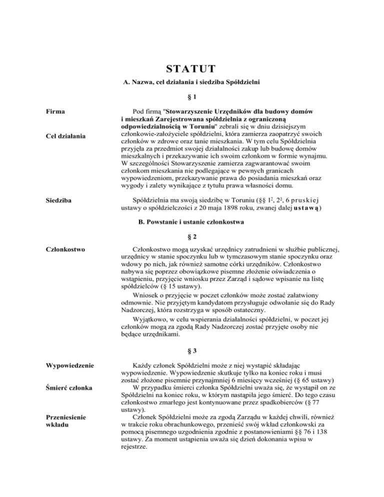 STATUT A. Nazwa, cel działania i siedziba Spółdzielni §1 Firma Cel działania Siedziba Pod firmą "Stowarzyszenie Urzędników dla budowy domów i mieszkań Zarejestrowana spółdzielnia z ograniczoną odpowiedzialnością w Toruniu" zebrali się w dniu dzisiejszym członkowie-założyciele spółdzielni, która zamierza zaopatrzyć swoich członków w zdrowe oraz tanie mieszkania. W tym celu Spółdzielnia przyjęła za przedmiot swojej działalności zakup lub budowę domów mieszkalnych i przekazywanie ich swoim członkom w formie wynajmu. W szczególności Stowarzyszenie zamierza zagwarantować swoim członkom mieszkania nie podlegające w pewnych granicach wypowiedzeniom, przekazywanie prawa do posiadania mieszkań oraz wygody i zalety wynikające z tytułu prawa własności domu. Spółdzielnia ma swoją siedzibę w Toruniu (§§ 17, 23, 6 pruskiej ustawy o spółdzielczości z 20 maja 1898 roku, zwanej dalej ustawą) B. Powstanie i ustanie członkostwa §2 Członkostwo Członkostwo mogą uzyskać urzędnicy zatrudnieni w służbie publicznej, urzędnicy w stanie spoczynku lub w tymczasowym stanie spoczynku oraz wdowy po nich, jak również samotne córki urzędników. Członkostwo nabywa się poprzez obowiązkowe pisemne złożenie oświadczenia o wstąpieniu, przyjęcie wniosku przez Zarząd i sądowe wpisanie na listę spółdzielców (§ 15 ustawy). Wniosek o przyjęcie w poczet członków może zostać załatwiony odmownie. Nie przyjętym kandydatom przysługuje odwołanie się do Rady Nadzorczej, która rozstrzyga w sposób ostateczny. Wyjątkowo, w celu wspierania działalności spółdzielni, w poczet jej członków mogą za zgodą Rady Nadzorczej zostać przyjęte osoby nie będące urzędnikami. §3 Wypowiedzenie Śmierć członka Przeniesienie wkładu Każdy członek Spółdzielni może z niej wystąpić składając wypowiedzenie. Wypowiedzenie skutkuje tylko na koniec roku i musi zostać złożone pisemnie przynajmniej 6 miesięcy wcześniej (§ 65 ustawy) W przypadku śmierci członka Spółdzielni uważa się, że wystąpił on ze Spółdzielni na koniec roku, w którym nastąpiła jego śmierć. Do tego czasu członkostwo zmarłego jest kontynuowane przez spadkobierców (§ 77 ustawy). Członek Spółdzielni może za zgodą Zarządu w każdej chwili, również w trakcie roku obrachunkowego, przenieść swój wkład członkowski za pomocą pisemnego uzgodnienia zgodnie z postanowieniami §§ 76 i 138 ustawy. Za moment ustąpienia uważa się dzień dokonania wpisu w rejestrze. Zarząd może wykluczyć członka na koniec roku ze Spółdzielni ze względu na utratę praw obywatelskich, a ponadto jeśli mimo dwukrotnego wezwania nie spełni on należących do niego obowiązków wynikających z § 51 oraz § 52 niniejszego statutu lub naruszy postanowienia § 53 (§ 68 ustawy). Wykluczonemu przysługuje odwołanie się w przeciągu 14 dni do Rady Nadzorczej oraz od jej decyzji, odwołanie się do Walnego Zgromadzenia. Wykluczenie C. Prawa i obowiązki członków §4 Prawa Prawo wykonywania głosu Dywidenda 1. 2. Przydział mieszkań 3. Niepodleganie wypowiedzeniu 4. Członkowie mają prawo: do uczestnictwa z równym prawem głosu we wszystkich głosowaniach nad uchwałami i we wszystkich wyborach odbywających się podczas walnych zgromadzeń (§ 29 statutu, § 43 ustawy). zgodnie z § 11 niniejszego Statutu do dywidendy (§§ 19, 48 ustawy; § 7 Statutu) oraz do uwzględnienia ich w równym stopniu podczas przydzielania mieszkań według ogólnych zasad zatwierdzonych przez Walne Zgromadzenie (§ 12 Statutu). Członkowie mają w końcu prawo do tego, aby ich mieszkanie nie podlegało wypowiedzeniu, zgodnie z treścią obowiązujących warunków wynajmu (§ 12 Statutu, § 18 ustawy). §5 Obowiązki Wkłady Wpisowe 1. 2. 3. Postanowienia Statutu 4. Ponoszenie odpowiedzialności materialnej Członkowie są zobowiązani: do uiszczenia na poczet swoich udziałów płatności określonych w § 6 Statutu, do uiszczenia przy pierwszej wpłacie opłaty wpisowej zgodnie z § 10 Statutu, do nienaruszania postanowień Statutu, uchwał i interesów Spółdzielni oraz do ponoszenia zgodnie z obowiązującą ustawą o spółdzielczości odpowiedzialności materialnej za zobowiązania Spółdzielni do wysokości 300 marek, o ile nie wystarczy do tego celu majątek Stowarzyszenia. Odpowiedzialność członka, który posiada więcej niż jeden udział, zwiększa się do – odpowiadającej liczbie udziałów – wielokrotności tej sumy. Nie można domagać się od członka, aby ponosił odpowiedzialność materialną powyżej tej sumy (§§ 23, 71, 23, 105-116, 131, 135, 141 ustawy.) D. Udziały członków Spółdzielni §6 Wysokość Liczba Zgoda na nabycie dalszych udziałów Wpłata na poczet udziałów Oświadczenie dot. wpłat Udział członkowski ustala się na sumę 300 marek. Każdy członek musi posiadać jeden udział oraz może objąć do 10 takich udziałów (§§ 72, 22, 134 ustawy.) Objęcie drugiego i każdego następnego udziału wymaga zezwolenia Zarządu i jest dopuszczalne tylko wtedy, gdy uiszczono pełną opłatę za ostatnio nabyty udział. Objęcie udziałów wchodzi w życie po złożeniu obowiązkowego oświadczenia, wyrażeniu zgody przez Zarząd i dokonaniu wpisu na listę członków (§§ 136, 137 ustawy). Członkowie są zobowiązani do uiszczania na każdy udział wpłat gotówkowych do wysokości 150 marek, w regularnych ratach w wysokości przynamniej 6 marek, płatnych w pierwszych trzech dniach każdego kwartału (§ 72 ustawy) Jeśli po osiągnięciu sumy 150 marek członek nie będzie chciał wnosić dalszych płatności, wówczas winien to zgłosić do kasy Stowarzyszenia. Udziały lub składka obowiązkowa mogą być uiszczane w jednej kwocie, w momencie wstąpienia do Spółdzielni względnie z chwilą nabycia dalszych udziałów. W każdej chwili dopuszczalne są również przedpłaty oraz wkłady nadzwyczajne na poczet udziałów. W oświadcze