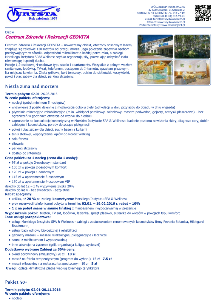SPÓŁDZIELNIA TURYSTYCZNA 32-600 Oświęcim, ul. Solskiego 2 telefony: (0 48 33) 842-43-76, 842-27-19 tel/fax: (0 48 33) 842-59-94 e-mail: [email protected] Internet: www.turysta.oswiecim.pl Portal internetowy: www.nawakacje24.pl Centrum Zdrowia i Rekreacji GEOVITA Centrum Zdrowia i Rekreacji GEOVITA – nowoczesny obiekt, otoczony sosnowym lasem, znajduje się zaledwie 120 metrów od brzegu morza. Jego położenie zapewnia osobom przebywającym w ośrodku odpowiedni mikroklimat o każdej porze roku, a zabiegi Morskiego Instytutu SPA&Wellness szybko regenerują siły, pozwalając odzyskać ciału równowagę i spokój ducha. Pokoje 1,2-osobowe, 4-osobowe typu studio i apartamenty. Wszystkie z pełnym węzłem sanitarnym, lodówką, TV-sat, telefonem, dostępem do Internetu, sprzętem plażowym. Na miejscu: kawiarnia, Chata grillowa, kort tenisowy, boisko do siatkówki, koszykówki, pokój i plac zabaw dla dzieci, parking strzeżony. Termin pobytu: 02.01–26.03.2016 W cenie pakietu oferujemy: noclegi (pobyt minimum 5 noclegów) wyżywienie 3 posiłki dziennie z możliwością doboru diety (od kolacji w dniu przyjazdu do obiadu w dniu wyjazdu) pływalnia rekreacyjno-rehabilitacyjna (m.in. whirlpool perełkowy, solankowy, masaże podwodne, gejzery, natryski płaszczowe) – bez ograniczeń w godzinach otwarcia od wtorku do niedzieli zaproszenie na konsultację kosmetyczną w Morskim Instytucie SPA & Wellness: badanie poziomu nawilżenia skóry, diagnoza cery, dobór zabiegów i kosmetyków, porady dotyczące pielęgnacji pokój i plac zabaw dla dzieci, suchy basen z kulkami tenis stołowy, wypożyczenie kijków do Nordic Walking sala fitness siłownia parking strzeżony dostęp do Internetu Cena pakietu za 1 nocleg (cena dla 1 osoby): 95 zł w pokoju 2-osobowym standard 105 zł w pokoju 2-osobowym komfort 120 zł w pokoju 1-osobowym 115 zł w apartamencie 3-osobowym 150 zł w apartamencie 4-osobowym VIP dziecko do lat 12 – z ½ wyżywienia zniżka 20% dziecko do lat 4 - bez świadczeń - bezpłatnie Rabat specjalny: zniżka, aż 20 % na zabiegi kosmetyczne Morskiego Instytutu SPA & Wellness przy rezerwacji telefonicznej pobytu w terminie: 02.01. – 19.02.2016 r. rabat – 10% 1 x na pobyt seans w saunie fińskiej z minibasenem i wypoczywalnią w prezencie Wyposażenie pokoi: telefon, TV sat, lodówka, łazienka, sprzęt plażowy, suszarka do włosów w pokojach typu komfort Inne usługi pozapakietowe: usługi Morskiego Instytutu SPA & Wellness - zabiegi z zastosowaniem renomowanych kosmetyków firmy Pevonia Botanica, Hildegard Braukmann, usługi bazy odnowy biologicznej i rehabilitacji gabinety masażu – masaże relaksacyjne, pielęgnacyjne i lecznicze sauna z minibasenem i wypoczywalnią inne atrakcje na życzenie (grill, organizacja kuligu, wycieczki) Dodatkowo wybrane Zabiegi za 50% ceny: okład borowinowy (miejscowy) 20 zł 10 zł masaż na fotelu terapeutycznym (program do wyboru) 15 zł 7,5 zł masaż wibracyjny na materacu terapeutycznym 10 zł 5 zł Uwagi: opłata klimatyczna płatna według lokalnego taryfikatora Termin pobytu: 02.01-20.11.2016 W cenie pakietu oferujemy: noclegi wyżywienie 3 posiłki dziennie z możliwością doboru diety (od kolacji w dniu przyjazdu do obiadu w dniu wyjazdu) konsultacja lekarska: ocena ogólnego stanu zdrowia, wykluczenie ewentualnych przeciwwskazań do zabiegów oraz zlecenie zabiegów z zakresu fizykoterapii 6 zabiegów fizykoterapeutycznych przy pobycie 7-dniowym 12 zabiegów fizykoterapeutycznych przy pobycie 14-dniowym 3 masaże lecznicze częściowe przy pobycie 7- dniowym 6 masaży leczniczych częściowych przy pobycie 14-dniowym pływalnia rekreacyjno-rehabilitacyjna (m.in. masaże podwodne, gejzery, natryski płaszczowe, whirlpool perełkowy, solankowy) od wtorku do niedzieli – bez ograniczeń w godzinach otwarcia korzystanie z sauny fińskiej z basenem i wypoczywalnią – bez ograniczeń w godzinach otwarcia zaproszenie na konsultację kosmetyczną w Morskim Instytucie SPA & Wellness: badanie poziomu nawilżenia skóry, diagnoza cery, dobór zabiegów i kosmetyków, porady dotyczące pielęgnacji lampka wina co dwa tygodnie organizowany wieczorek taneczny korzystanie ze sprzętu Nordic Walking (przy grupach ćwiczenia z trenerem) gimnastyka w wodzie, zajęcia fitness (minimum 15 osób chętnych) pokój, plac zabaw oraz suchy basen z kulkami dla dzieci boisko do piłki siatkowej, koszykówki i kometki sala fitness siłownia sala gier, tenis stołowy prasa codzienna parking strzeżony dostęp do Internetu Termin pobytu: 02.01-26.03.2016 lub 15.10-20.11.2016 Cena pakietu za 7 noclegów (cena dla 1 osoby): 810 zł w pokoju 2-osobowym standard 880 zł w pokoju 2-osobowym komfort 930 zł w pokoju 1-osobowym 930 zł w apartamencie 3-osobowym Cena pakietu za 14 noclegów (cena dla 1 osoby): 1 580 zł w pokoju 2-osobowym standard 1 710 zł w pokoju 2-osobowym komfort 1 790 zł w pokoju 1-osobowym 1 790 zł w apartamencie 3-osobowym Termin pobytu: 26.03-25.06.2016 lub 13.08-15.10 2016 Cena pakietu za 7 noclegów (cena dla 1 osoby): 980 zł w pokoju 2-osobowym standard 1 080 zł w pokoju 2-osobowym komfort 1 260 zł w pokoju 1-osobowym 1 260 zł w apartamencie 3-osobowym Cena pakietu za 14 noclegów (cena dla 1 osoby):1 910 zł w pokoju 2-osobowym standard 2 110 zł w pokoju 2-osobowym komfort 2 460 zł w pokoju 1-osobowym 2 460 zł w apartamencie 3-osobowym Rabat specjalny: zniżka 10 % na zabiegi Morskiego Instytutu SPA & Wellness oraz odnowy biologicznej Wyposażenie pokoi: telefon, TV sat, lodówka, łazienka, sprzęt plażowy, suszarka do włosów w pokojach typu komfort Inne usługi pozapakietowe: usługi Morskiego Instytutu SPA & Wellness - zabiegi z zastosowaniem renomowanych kosmetyków firmy Pevonia Botanica, Hildegard Braukmann, dodatkowe usługi bazy odnowy biologicznej, rehabilitacji oraz masaże relaksacyjne, pielęgnacyjne i lecznicze inne atrakcje na życzenie (kort tenisowy, grill, organizacja przejażdżki bryczką, wy