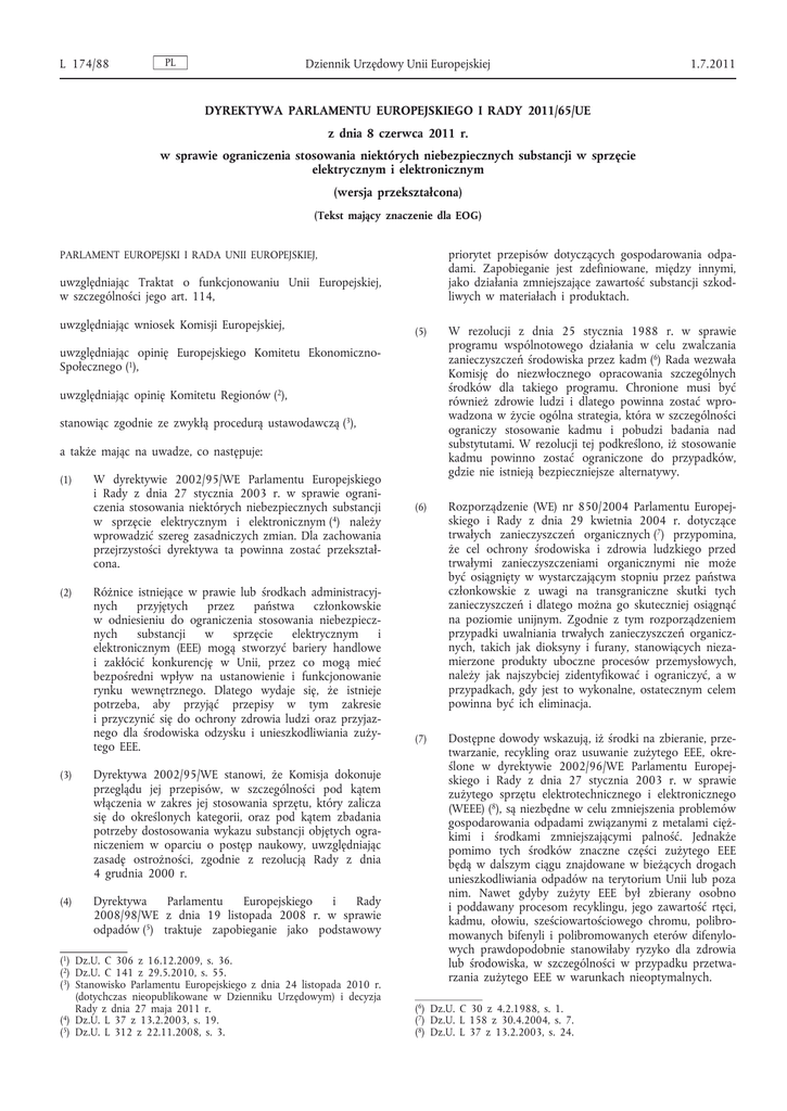 L 174/88 PL Dziennik Urzędowy Unii Europejskiej 1.7.2011 DYREKTYWA PARLAMENTU EUROPEJSKIEGO I RADY 2011/65/UE z dnia 8 czerwca 2011 r. w sprawie ograniczenia stosowania niektórych niebezpiecznych substancji w sprzęcie elektrycznym i elektronicznym (wersja przekształcona) (Tekst mający znaczenie dla EOG) priorytet przepisów dotyczących gospodarowania odpa dami. Zapobieganie jest zdefiniowane, między innymi, jako działania zmniejszające zawartość substancji szkod liwych w materiałach i produktach. PARLAMENT EUROPEJSKI I RADA UNII EUROPEJSKIEJ, uwzględniając Traktat o funkcjonowaniu Unii Europejskiej, w szczególności jego art. 114, uwzględniając wniosek Komisji Europejskiej, (5) W rezolucji z dnia 25 stycznia 1988 r. w sprawie programu wspólnotowego działania w celu zwalczania zanieczyszczeń środowiska przez kadm (6) Rada wezwała Komisję do niezwłocznego opracowania szczególnych środków dla takiego programu. Chronione musi być również zdrowie ludzi i dlatego powinna zostać wpro wadzona w życie ogólna strategia, która w szczególności ograniczy stosowanie kadmu i pobudzi badania nad substytutami. W rezolucji tej podkreślono, iż stosowanie kadmu powinno zostać ograniczone do przypadków, gdzie nie istnieją bezpieczniejsze alternatywy. (6) Rozporządzenie (WE) nr 850/2004 Parlamentu Europej skiego i Rady z dnia 29 kwietnia 2004 r. dotyczące trwałych zanieczyszczeń organicznych (7) przypomina, że cel ochrony środowiska i zdrowia ludzkiego przed trwałymi zanieczyszczeniami organicznymi nie może być osiągnięty w wystarczającym stopniu przez państwa członkowskie z uwagi na transgraniczne skutki tych zanieczyszczeń i dlatego można go skuteczniej osiągnąć na poziomie unijnym. Zgodnie z tym rozporządzeniem przypadki uwalniania trwałych zanieczyszczeń organicz nych, takich jak dioksyny i furany, stanowiących nieza mierzone produkty uboczne procesów przemysłowych, należy jak najszybciej zidentyfikować i ograniczyć, a w przypadkach, gdy jest to wykonalne, ostatecznym celem powinna być ich eliminacja. (7) Dostępne dowody wskazują, iż środki na zbieranie, prze twarzanie, recykling oraz usuwanie zużytego EEE, okre ślone w dyrektywie 2002/96/WE Parlamentu Europej skiego i Rady z dnia 27 stycznia 2003 r. w sprawie zużytego sprzętu elektrotechnicznego i elektronicznego (WEEE) (8), są niezbędne w celu zmniejszenia problemów gospodarowania odpadami związanymi z metalami cięż kimi i środkami zmniejszającymi palność. Jednakże pomimo tych środków znaczne części zużytego EEE będą w dalszym ciągu znajdowane w bieżących drogach unieszkodliwiania odpadów na terytorium Unii lub poza nim. Nawet gdyby zużyty EEE był zbierany osobno i poddawany procesom recyklingu, jego zawartość rtęci, kadmu, ołowiu, sześciowartościowego chromu, polibro mowanych bifenyli i polibromowanych eterów difenylo wych prawdopodobnie stanowiłaby ryzyko dla zdrowia lub środowiska, w szczególności w przypadku przetwa rzania zużytego EEE w warunkach nieoptymalnych. uwzględniając opinię Europejskiego Komitetu EkonomicznoSpołecznego (1), uwzględniając opinię Komitetu Regionów (2), stanowiąc zgodnie ze zwykłą procedurą ustawodawczą (3), a także mając na uwadze, co następuje: (1) (2) W dyrektywie 2002/95/WE Parlamentu Europejskiego i Rady z dnia 27 stycznia 2003 r. w sprawie ograni czenia stosowania niektórych niebezpiecznych substancji w sprzęcie elektrycznym i elektronicznym (4) należy wprowadzić szereg zasadniczych zmian. Dla zachowania przejrzystości dyrektywa ta powinna zostać przekształ cona. Różnice istniejące w prawie lub środkach administracyj nych przyjętych przez państwa członkowskie w odniesieniu do ograniczenia stosowania niebezpiecz nych substancji w sprzęcie elektrycznym i elektronicznym (EEE) mogą stworzyć bariery handlowe i zakłócić konkurencję w Unii, przez co mogą mieć bezpośredni wpływ na ustanowienie i funkcjonowanie rynku wewnętrznego. Dlatego wydaje się, że istnieje potrzeba, aby przyjąć przepisy w tym zakresie i przyczynić się do ochrony zdrowia ludzi oraz przyjaz nego dla środowiska odzysku i unieszkodliwiania zuży tego EEE. (3) Dyrektywa 2002/95/WE stanowi, że Komisja dokonuje przeglądu jej przepisów, w szczególności pod kątem włączenia w zakres jej stosowania sprzętu, który zalicza się do określonych kategorii, oraz pod kątem zbadania potrzeby dostosowania wykazu substancji objętych ogra niczeniem w oparciu o postęp naukowy, uwzględniając zasadę ostrożności, zgodnie z rezolucją Rady z dnia 4 grudnia 2000 r. (4) Dyrektywa Parlamentu Europejskiego i Rady 2008/98/WE z dnia 19 listopada 2008 r. w sprawie odpadów (5) traktuje zapobieganie jako podstawowy (1) Dz.U. C 306 z 16.12.2009, s. 36. (2) Dz.U. C 141 z 29.5.2010, s. 55. (3) Stanowisko Parlamentu Europejskiego z dnia 24 listopada 2010 r. (dotychczas nieopublikowane w Dzienniku Urzędowym) i decyzja Rady z dnia 27 maja 2011 r. (4) Dz.U. L 37 z 13.2.2003, s. 19. (5) Dz.U. L 312 z 22.11.2008, s. 3. (6) Dz.U. C 30 z 4.2.1988, s. 1. (7) Dz.U. L 158 z 30.4.2004, s. 7. (8) Dz.U. L 37 z 13.2.2003, s. 24. 1.7.2011 (8) PL Dziennik Urzędowy Unii Europejskiej Biorąc pod uwagę wykonalność z punktu widzenia tech nicznego i gospodarczego, w tym dla małych i średnich przedsiębiorstw (MŚP), najefektywniejszym sposobem zapewnienia znacznego obniżenia ryzyka dla zdrowia i środowiska związanego z tymi substancjami, w celu osiągnięcia wybranego poziomu bezpieczeństwa w Unii, jest zastąpienie takich substancji w EEE bezpiecznymi lub bezpieczniejszymi materiałami. Ograniczenie stosowania takich niebezpiecznych substancji prawdopodobnie zwiększy możliwości i ekonomiczną rentowność recy klingu zużytego EEE oraz obniży negatywny wpływ na zdrowie pracowników zakładów utylizacji. (9) Substancje objęte niniejszą dyrektywą są naukowo dobrze zbadane i ocenione oraz są przedmiotem różnych śr