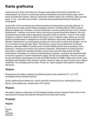 Karta graficzna Janek pracuje w firmie informatycznej. Na jego nieszczęście był leniwym studentem nie interesującym się niczym co wykraczało poza prześlizgnięcie się przez kolejną sesję. Jak to bywa ze studentami pokroju Janka po ukończeniu studiów ciężko jest o ambitną i pełną wyzwań pracę. To nic - pomyślał nasz bohater i rozpoczął swoją błyskotliwą karierę od skręcania komputerów. Janek trafił na linię montażową przy której przykręca się kartę graficzną do płyty głównej. To, wydawać by się mogło, proste zajęcie przysparza Jankowi mnóstwa kłopotu. Otóż na płycie głównej znajduje się n otworów o różnych średnicach, na karcie graficznej zaś n śrub o różnych wielkościach - każdemu rozmiarowi otworu oraz śruby przypisana jest litera alfabetu. Aby móc przykręcić kartę do płyty należy dopasować wszystkie śruby do otworów - śruba A musi zostać wkręcona w otwór A, śruba B w otwór B itd. Rzecz w tym, iż bardzo często zdarza się, że karty graficzne produkowane w nielegalnych chińskich fabrykach mają śruby nieprzystosowane do otworów. Stwierdzenie czy karta pasuje do płyty jest o tyle trudne, że karty te są okrągłe i nie ma na nich żadnych oznaczeń typu "góra". Na pierwszy rzut oka można stwierdzić, że do płyty głównej o otworach ABBA nie pasuje karta o śrubach BBAA jednak kartę tą wystarczy nieco przekręcić i okazuje się że otwory są w dobrych miejscach. Stwierdzenie czy karta pasuje to tylko jeden z problemów naszego bohatera, równie trudny jest dla niego proces samego przykręcania. Przebiega on w bardzo charakterystyczny sposób - przykręca się sąsiednie śruby w kierunku zgodnym z ruchem wskazówek zegara, tak aby wyraz powstały z liter przy śrubach był jak najmniejszy leksykograficznie (dla śrub BBAA będzie to AABB). Gdyby tylko Janek umiał napisałby sobie program, który wykona "czarną" robotę za niego lecz jak już wiesz był on słabym studentem i nie ma pojęcia jak to zrobić. Pomóż mu, napisz program który wykona niezbędne obliczenia. Wejście W pierwszej linii wejścia znajduje się dokładnie jedna liczba całkowita Z (1 ≤ Z ≤ 105) określająca liczbę zestawów danych. Każdy zestaw danych składa się z dwóch wyrazów umieszczonych w oddzielnych liniach. Wyraz może składać się z maksymalnie 106 znaków. Wyjście Na wyjściu należy w oddzielnej linii dla każdego zestawu danych wypisać 0 jeżeli karty nie da się przykręcić do płyty lub kolejność dokręcania śrub jeżeli jest inaczej. Przykład Wejście: 3 ABCABC ABC ABABBAB BBABABA XYZZXY ZZXYXY Wyjście: 0 ABABABB XYXYZZ