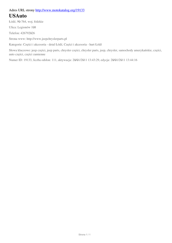 Adres URL strony http://www.motokatalog.org/19133 USAuto Łódź, 90-764, woj. łódzkie Ulica: Legionów 108 Telefon: 426792026 Strona www: http://www.jeepchryslerparts.pl Kategorie: Części i akcesoria - detal Łódź, Części i akcesoria - hurt Łódź Słowa kluczowe: jeep części, jeep parts, chrysler części, chrysler parts, jeep, chrysler, samochody amerykańskie, części, auto części, części zamienne Numer ID: 19133, liczba odsłon: 111, aktywacja: 20/01/2011 13:43:29, edycja: 20/01/2011 13:44:16 Strona 1 / 1