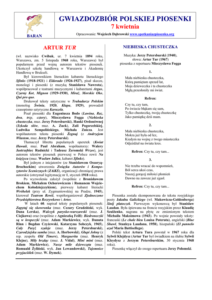 GWIAZDOZBIÓR POLSKIEJ PIOSENKI 7 kwietnia Opracowanie: Wojciech Dąbrowski www.spotkaniazpiosenka.org BARAN ARTUR TUR NIEBIESKA CHUSTECZKA (wł. nazwisko Cwibak, ur. 7 kwietnia 1894 roku, Warszawa, zm. 5 listopada 1968 roku, Warszawa) był popularnym przed wojną autorem tekstów piosenek. Ukończył szkołę handlową w Warszawie i Akademię Handlową w Brukseli. Był kierownikiem literackim kabaretu literackiego Sfinks (1918-1921) i Eldorado (1926-1927), pisał skecze, monologi i piosenki (z muzyką Stanisława Nawrota), współpracował z teatrami muzycznymi i kabaretami Argus, Czarny Kot, Mignon (1929-1930), Miraż, Morskie Oko, Qui pro quo. Drukował teksty satyryczne w Trubadurze Polskim (monolog Świnia, 1920, Klapa, 1929), prowadził czasopismo satyryczne Karuzela. Pisał piosenki dla Eugeniusza Bodo (Lawina, Raz, dwa, trzy, cztery), Mieczysława Fogga (Niebieska chusteczka, muz. Jerzy Petersburski), Hanki Ordonównej (Szkoda słów, muz. A. Zuck), Zuli Pogorzelskiej, Ludwika Sempolińskiego, Michała Znicza. Jest współautorem tekstu piosenki Żegnaj (z Andrzejem Włastem, muz. Jerzy Petersburski). Tłumaczył libretta popularnych operetek (Kwiat Hawaii, muz. Paul Abraham, współautorzy: Walery Jastrzębiec Rudnicki i Tadeusz Żeromski Wrzos), jest autorem tekstów piosenek pierwszej w Polsce rewii Na księżycu (muz. Wacław Julicz, kabaret Sfinks). Był jednym z inicjatorów (ze Stanisławem OssoryąBrochockim) utworzenia Związku Autorów i Kompozytorów Scenicznych (ZAiKS), organizacji chroniącej prawa autorskie (otrzymał legitymację nr 1, styczeń 1918 roku). Po wyzwoleniu założył (wspólnie z Bronisławem Brokiem, Michałem Ochorowiczem i Romanem Wojciechem Kołodziejczykiem), pierwszy kabaret literacki Wróbelek (przy ul. Zygmuntowskiej na Pradze, 1945), kierował Teatrem Rewii, współorganizował Zjednoczone Przedsiębiorstwa Rozrywkowe i Artos. W latach 60. napisał teksty popularnych piosenek: Zapytaj się skowronka (muz. Cezary Grudziński, wyk. Dana Lerska), Walczyk parysko-warszawski (muz. J. Ciejkowa) oraz (wspólnie z Agnieszką Feill): Biedroneczki są w kropeczki (muz. Adam Markiewicz, wyk. Danuta Rinn i Bogdan Czyżewski, Katarzyna Sobczyk, 1965), Cały Paryż szaleje (muz. Jerzy Petersburski), Czarodziejska samba (muz. A. Horbowski), Głupi Johny (z rep. zespołu Old Timers), Marguerita (muz. Henryk Klejne), Miły brzdąc (muz. J. Vidal), Mini mini (muz. Adam Markiewicz), Nasze miłe dziewczęta (muz. Romuald Żyliński, wyk. Jan Lewandowski), Tajemnice przyjaciółek (muz. W. Dymek). Muzyka: Jerzy Petersburski (1940), słowa: Artur Tur (1967) piosenka z repertuaru Mieczysława Fogga 1. Mała niebieska chusteczka, Którą pamiętam sprzed lat, Moja dzieweczka i ta chusteczka Mgłą przesłoniły mi świat. Refren: Czy tu, czy tam, Po świecie błąkam się sam, Tylko chusteczkę, twoją chusteczkę Jako pamiątkę dziś mam. 2. Mała niebieska chusteczka, Mokra już była od łez, Kiedym na wojnę z twego miasteczka Odjeżdżał na świata kres. Refren: Czy tu, czy tam... 3. Nie trzeba wracać do wspomnień, Ból serca ukoi czas, Naszej gorącej miłości płomień Dawno na zawsze już zgasł. Refren: Czy tu, czy tam... Piosenka została skomponowana do tekstu rosyjskiego poety Jakuba Galickiego (wł. Makowicza-Goldenberga) Sinij płatoczek. Pierwszym wykonawcą był Stanisław Laudan. Była śpiewana na froncie rosyjskim przez Klaudię Szulżenko, nagrana na płytę ze zmienionym tekstem Michaiła Maksimowa (1943). Po wojnie powstały teksty: francuski (Le chale bleu Louisa Poterata), angielski (Blue Shawl, Stanleya Laudana, 1958), hiszpański (El pannelo azul Maria Battisellego). Polski tekst Artura Tura powstał w 1967 roku dla Sylwii Klejdysz (Artur Tur był świadkiem na ślubie Sylwii Kleydysz z Jerzym Petersburskim, 30 stycznia 1968 roku). Piosenkę włączył do swego repertuaru Jerzy Połomski.