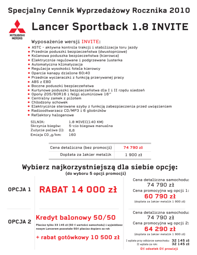 Specjalny Cennik Wyprzeda¿owy Rocznika 2010 Lancer Sportback 1.8 INVITE Wyposa¿enie wersji INVITE: ASTC - aktywna kontrola trakcji i stabilizacja toru jazdy Przednie poduszki bezpieczeñstwa (dwustopniowe) Kolanowa poduszka bezpieczeñstwa (kierowca) Elektrycznie regulowane i podgrzewane lusterka Automatyczna klimatyzacja Regulacja wysokoœci fotela kierowcy Oparcie kanapy dzielone 60:40 Przednie wycieraczki z funkcj¹ przerywanej pracy ABS z EBD Boczne poduszki bezpieczeñstwa Kurtynowe poduszki bezpieczeñstwa dla I i II rzêdu siedzeñ Opony 205/60R16 i felgi aluminiowe 16'’ Centralny zamek z pilotem Ch³odzony schowek Elektrycznie sterowane szyby z funkcj¹ zabezpieczenia przed uwiêzieniem Radioodtwarzacz CD/MP3 i 6 g³oœników Reflektory halogenowe SILNIK: Skrzynia biegów: Zu¿ycie paliwa (l): Emisja CO 2 g/km: 1.8 MIVEC(140 KM) 5-cio biegowa manualna 6,6 160 Cena detaliczna (bez promocji) 74 790 z³ Dop³ata za lakier metalik 1 900 z³ Wybierz najkorzystniejsz¹ dla siebie opcjê: (do wyboru 5 opcji promocji) Cena detaliczna samochodu: OPCJA 1 RABAT 14 000 z³ 74 790 z³ Cena promocyjna wg opcji 1: 60 790 z³ (dop³ata za lakier metalik 1 900 z³) Cena detaliczna samochodu: OPCJA 2 Kredyt balonowy 50/50 P³acisz tylko 33 145 z³ (50 % wartoœci samochodu) i wyje¿d¿asz nowym Lancerem pozosta³e 50% p³acisz dopiero za rok + rabat gotówkowy 10 500 z³ 74 790 z³ Cena promocyjna wg opcji 2: 64 290 z³ (dop³ata za lakier metalik 1 900 z³) I wp³ata przy odbiorze samochodu: II wp³ata za rok: 32 145 z³ 32 145 z³ 0% odsetek 0% prowizji Cena detaliczna samochodu: OPCJA 3 74 790 z³ Kredyt 50/50 (24M) Cena promocyjna wg opcji 3: 64 290 z³ P³acisz tylko 32 145 z³ (50 % wartoœci samochodu) i wyje¿d¿asz nowym Lancerem na pozosta³e 50% udzielamy nieoprocentowanego kredytu na okres 24 miesiêcy. + rabat gotówkowy 10 500 z³ (dop³ata za lakier metalik 1 900 z³) 32 145 z³ 1 339,38 z³ I wp³ata przy odbiorze samochodu: Miesiêczna rata kredytu: (1 339,38 z³ x 24 = 32 145 z³) 0% odsetek 0% prowizji OPCJA 4 Cena detaliczna samochodu: Kredyt 3x33% 74 790 z³ Cena promocyjna wg opcji 4: 66 790 z³ Wartoœæ samochodu roz³o¿ona jest na 3 nieoprocentowane raty. Wp³acasz tylko 33,4% wartoœci samochodu czyli (dop³ata za lakier metalik 1 900 z³) 22 976 z³ i wyje¿d¿asz nowym Lancerem I wp³ata przy odbiorze samochodu (33,4%): 22 + rabat gotówkowy 8 000 z³ II wp³ata za rok (33,3%): III wp³ata za dwa lata (33,3%): 308 z³ 22 241 z³ 22 241 z³ Podane ceny w PLN zawierajà podatek VAT. Wszelkie informacje podane w cenniku nie stanowià ofert w rozumieniu Kodeksu cywilnego. Cennik wa¿ny od 01.12 do 31.12.2011. Iloœæ samochodów ograniczona. W przypadku zainteresowania ofert¹ wskazana jest rezerwacja samochodu. tel. 725 257 464 e-mail: [email protected] e-mail: [email protected] www.mitsubishi-sobczyk.pl