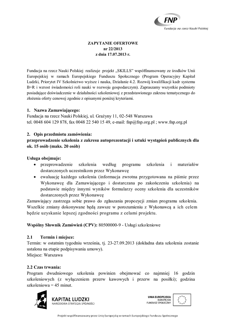 ZAPYTANIE OFERTOWE nr 22/2013 z dnia 17.07.2013 r. Fundacja na rzecz Nauki Polskiej realizuje projekt „SKILLS” współfinansowany ze środków Unii Europejskiej w ramach Europejskiego Funduszu Społecznego (Program Operacyjny Kapitał Ludzki, Priorytet IV Szkolnictwo wyższe i nauka, Działanie 4.2. Rozwój kwalifikacji kadr systemu B+R i wzrost świadomości roli nauki w rozwoju gospodarczym). Zapraszamy wszystkie podmioty posiadające doświadczenie w działalności szkoleniowej z przedstawionego zakresu tematycznego do złożenia oferty cenowej zgodnie z opisanymi poniżej kryteriami. 1. Nazwa Zamawiającego: Fundacja na rzecz Nauki Polskiej, ul. Grażyny 11, 02-548 Warszawa tel. 0048 604 129 878, fax 0048 22 540 15 49, e-mail: [email protected] ; www.fnp.org.pl 2. Opis przedmiotu zamówienia: przeprowadzenie szkolenia z zakresu autoprezentacji i sztuki wystąpień publicznych dla ok. 15 osób (maks. 20 osób) Usługa obejmuje: przeprowadzenie szkolenia według programu szkolenia i materiałów dostarczonych uczestnikom przez Wykonawcę ewaluację każdego szkolenia (informacja zwrotna przygotowana na piśmie przez Wykonawcę dla Zamawiającego i dostarczana po zakończeniu szkolenia) na podstawie między innymi wyników formularzy oceny szkolenia dla uczestników dostarczonych przez Wykonawcę Zamawiający zastrzega sobie prawo do zgłaszania propozycji zmian programu szkolenia. Wszelkie zmiany dokonywane będą zawsze w porozumieniu z Wykonawcą a ich celem będzie uzyskanie lepszej zgodności programu z celami projektu. Wspólny Słownik Zamówień (CPV): 80500000-9 - Usługi szkoleniowe 2.1 Termin i miejsce: Termin: w ostatnim tygodniu września, tj. 23-27.09.2013 (dokładna data szkolenia zostanie ustalona na etapie podpisywania umowy). Miejsce: Warszawa 2.2 Czas trwania: Program dwudniowego szkolenia powinien obejmować co najmniej 16 godzin szkoleniowych (z wyłączeniem przerw kawowych i przerw na posiłki); godzina szkoleniowa = 45 minut. 2.3 Uczestnicy: Uczestnicy projektu SKILLS, w tym przede wszystkim naukowcy ze stopniem doktora lub doktoranci, będący laureatami i stypendystami FNP, pracujący w jednostkach naukowych mających siedzibę na terenie Polski. Szkolenie adresowane będzie do około 15-osobowej (maks. 20-osobowej) grupy naukowców, uczestników programu INTER prowadzonego w ramach projektu SKILLS. 2.4 Temat szkolenia: Autoprezentacja i sztuka wystąpień publicznych Każdy z uczestników szkolenia będzie musiał zaprezentować się podczas finału programu INTER przed komisją złożoną z przedstawicieli nauki i mediów oraz publicznością złożoną z osób w różnym wieku, zainteresowanych badaniami naukowymi, ale niebędących aktywnymi naukowcami. Podczas pięciominutowego wystąpienia każdy z uczestników będzie przedstawiał komisji swój interdyscyplinarny projekt naukowy, tak jednak by prezentacja była jednocześnie zrozumiała dla szerokiej publiczności. Szkolenie z zakresu autoprezentacji i wystąpień publicznych ma za zadanie m.in. przygotować uczestników do opracowania, a następnie wygłoszenia tego rodzaju prezentacji w sposób interesujący i atrakcyjny, a jednocześnie rzetelny pod względem naukowym. Po szkoleniu każdy z uczestników powinien posiadać zarówno ogólną wiedzę i umiejętności z zakresu autoprezentacji adekwatne do obszaru działalności uczestników i dostosowane do formy finału programu INTER, jak również informację zwrotną na temat swoich umiejętności, predyspozycji, mocnych i słabych stron oraz wskazówki do dalszej pracy w tym zakresie. 3. Zawartość oferty: wypełniony Formularz Oferty wraz z wymaganymi załącznikami (1. aktualny odpis z właściwego rejestru albo aktualne zaświadczenie o wpisie do ewidencji działalności gospodarczej, wystawione nie wcześniej niż 6 miesięcy przed upływem terminu składania ofert; 2. CV trenera/-ów; 3. wypełniony formularz dotyczący potrzebnej infrastruktury lokalowo-sprzętowej; 4. proponowany program szkolenia) Oferty należy składać w języku polskim. Dopuszcza się składanie skanów wymaganych dokumentów, które są w innych językach, ale Zamawiający zastrzega sobie prawo do wymagania tłumaczenia. Oferty niekompletne nie będą rozpatrywane. Podana cena jest ceną końcową, żadne podatki ani opłaty nie mogą być naliczane po złożeniu oferty. 4. Zamawiający zapewnia: 4.1 Trenerom, którzy nie zamieszkują na stałe w Polsce: Podróż w obie strony (bilet w klasie ekonomicznej lub refundacja do ustalonego limitu*) z lotniska położonego najbliższej miejsca zamieszkania trenera do lotniska położonego najbliższej miejsca szkolenia w Polsce; (refundacja nie obejmuje podróży wewnątrz kraju wylotu/wyjazdu; możliwe jest zastąpienie przelotu przejazdem koleją lub autobusem; szczegółowe warunki zostaną ustalone w umowie między Zamawiającym a Oferentem) * limit jest równy cenie biletu w obie strony (w dniach odpowiadających terminowi szkolenia) podawanej przez biuro podróży współpracujące z Zamawiającym Transport z lotniska/ dworca w Polsce do hotelu (miejsca szkolenia) i z powrotem tylko w przypadku, gdy miejsce szkolenia znajduje się poza miastem przylotu/ przyjazdu (jeśli w jego granicach, Zamawiający nie zapewnia transportu; Oferent może zawrzeć koszty dojazdu w cenie oferty); Zakwaterowanie podczas szkolenia wraz z noclegami przed i po szkoleniu; Posiłki tylko podczas szkolenia (włącznie z kolacją w pierwszym dniu szkolenia). 4.2 Trenerom, którzy zamieszkują na stałe w Polsce: Transport z lotniska/ dworca z miasta najbliższego do hotelu (miejsca szkolenia) i z powrotem tylko w przypadku, gdy znajduje się on poza miastem przylotu/ przyjazdu (jeśli w jego granicach Zamawiający nie zapewnia transportu, Oferent może zawrzeć koszty dojazdu w cenie oferty); Zakwaterowanie podczas szkoleń wraz z noclegami przed i po każdym ze szkoleń, jeśli trener na stałe zamieszkuje poza miastem/miejscem, gdzie odb