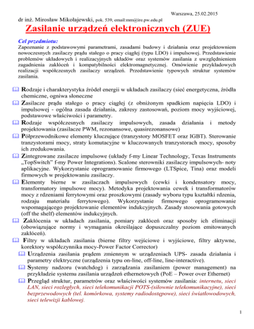 Warszawa, 25.02.2015 dr inŜ. Mirosław Mikołajewski, pok. 539, email:[email protected] Zasilanie urządzeń elektronicznych (ZUE) Cel przedmiotu: Zapoznanie z podstawowymi parametrami, zasadami budowy i działania oraz projektowniem nowoczesnych zasilaczy prądu stałego o pracy ciągłej (typu LDO) i impulsowej. Przedstawienie problemów układowych i realizacyjnych układów oraz systemów zasilania z uwzględnieniem zagadnienia zakłóceń i kompatybilności elektromagnetycznej. Omówienie przykładowych realizacji współczesnych zasilaczy urządzeń. Przedstawienie typowych struktur systemów zasilania. Rodzaje i charakterystyka źródeł energii w układach zasilaczy (sieć energetyczna, źródła chemiczne, ogniwa słoneczne Zasilacze prądu stałego o pracy ciągłej (z obniŜonym spadkiem napięcia LDO) i impulsowej - ogólna zasada działania, zakresy zastosowań, poziom mocy wyjściowej, podstawowe właściwości i parametry. Rodzaje współczesnych zasilaczy impulsowych, zasada działania i metody projektowania (zasilacze PWM, rezonansowe, quasirezonansowe) Półprzewodnikowe elementy kluczujące (tranzystory MOSFET oraz IGBT). Sterowanie tranzystorami mocy, straty komutacyjne w kluczowanych tranzystorach mocy, sposoby ich zredukowania. Zintegrowane zasilacze impulsowe (układy f-my Linear Technology, Texas Instruments „TopSwitch” f-my Power Integrations). Scalone sterowniki zasilaczy impulsowych- noty aplikacyjne. Wykorzystanie oprogramowanie firmowego (LTSpice, Tina) oraz modeli firmowych w projektowaniu zasilaczy. Elementy bierne w zasilaczach impulsowych (cewki i kondensatory mocy, transformatory impulsowe mocy). Metodyka projektowania cewek i transformatorów mocy z rdzeniami ferrytowymi oraz proszkowymi (zasady wyboru typu kształtki rdzenia, rodzaju materiału ferrytowego). Wykorzystanie firmowego oprogramowanie wspomagającego projektowanie elementów indukcyjnych. Zasady stosowania gotowych (off the shelf) elementów indukcyjnych. Zakłócenia w układach zasilania, pomiary zakłóceń oraz sposoby ich eliminacji (obowiązujące normy i wymagania określające dopuszczalny poziom emitowanych zakłóceń). Filtry w układach zasilania (bierne filtry wejściowe i wyjściowe, filtry aktywne, korektory współczynnika mocy-Power Factor Corrector) Urządzenia zasilania prądem zmiennym w urządzeniach UPS- zasada działania i parametry elektryczne (urządzenia typu on-line, off-line, line-interactive). Systemy nadzoru (watchdog) i zarządzania zasilaniem (power management) na przykładzie systemu zasilania urządzeń ethernetowych (PoE – Power over Ethernet) Przegląd struktur, parametrów oraz właściwości systemów zasilania: internetu, sieci LAN, sieci rozległych, sieci telekomunikacji POTS-(siłownie telekomunikacyjne), sieci bezprzewodowych (tel. komórkowa, systemy radiodostępowe), sieci światłowodowych, sieci telewizji kablowej. 1 Zastosowania przemysłowe zasilaczy impulsowych: urządzenia spawalnicze, układy ładowania akumulatorów, urządzenia do nagrzewania indukcyjnego prądem w.cz., układy zasilania prądem w.cz. do lamp fluoroscencyjnych (balasty elektroniczne), zasilacze LED. Zakres laboratorium: Ćwiczenie 1: Badanie przetwornicy obniŜającej i podwyŜszającej napięcie: pomiary przebiegów czasowych prądów i napięć przy obciąŜeniu zmiennym statycznie i dynamicznie, pomiary sprawności energetycznej oraz współczynników stabilizacji napięcia wyjściowego, określanie zakresu regulacji zasilacza PWM. Ćwiczenie nr2: Badanie przetwornicy przeciwbieŜnej z izolacją galwaniczną: pomiary przebiegów czasowych prądów i napięć przy obciąŜeniu zmiennym statycznie i dynamicznie, pomiary sprawności energetycznej oraz współczynników stabilizacji napięcia wyjściowego, określanie zakresu regulacji zasilacza PW, badanie układów zabezpieczeń przetwornicy. Ćwiczenie 3 Badanie układów oświetleniowych (na przykładzie przetwornicy LED oraz balastu elektronicznego): pomiary przebiegów czasowych prądów i napięć, pomiary sprawności energetycznej. Badanie zakresu regulacji prądu wyjściowego przetwornicy LED przy sterowaniu dc oraz PWM. Identyfikacja cyklu pracy i jego charakterystycznych parametrów dla balastu elektronicznego. Ćwiczenie 4: Badanie panelu słonecznego oraz elementów indukcyjnych: pomiary charakterystyk prądowo-napięciowych panelu słonecznego dla róŜnych warunków ośwetlenia, znajdowanie punktu maksymalnej mocy. Pomiary impedancji oraz identyfikcja schematu zastępczego cewek i transformatorów mocy na rdzeniach ferrytowych. Badanie wpływu zjawiska naskórkowości oraz efektu zbliŜeniowego na parametry elementów indukcyjnych. Ćwiczenie 5 (rezerwowe dla chętnych zamiast ćw. 3 lub ćw. 4): Badanie rezonansowej przetwornicy napięcia stałego typu LLC: pomiary przebiegów czasowych prądu obwodu rezonansowego i napięć w układzie przy zmianach napięcia zasilania i prądu obciąŜenia, pomiary sprawności energetycznej, badanie układów: miękkiego startu, samozasilania oraz ogranicznika prądowego. Forma zaliczenia: zaliczenie na podstawie wyników pracy semestralnej. Literatura: 1. Ch. P. Basso; “Switch-mode power supplies. Spice Simulations and Practical Designs”, McGraw-Hill, 2008. 2. M. K. Kazimierczuk; “Pulse-width Modulated DC-DC Power Converters”, Wiley, 2008, 3. M. K. Kazimierczuk;”High-frequency magnetic components”, Wiley, 2009. 4. M. Brown, “Power Supply cookbook”, EDN series for design engineers, Newnes 2001. 5. M. Kazimierczuk, D. Czarkowski, Resonant Power Converters, J. Wiley and Sons, Ltd. New York 1995. 6. J. Baranowski, G. Czajkowski, Układy elektroniczne cz. II. Układy analogowe nieliniowe i impulsowe, WNT, Warszawa 1993. 7. O. Ferenczi, Zasilanie układów elektronicznych. Zasilacze impulsowe, WNT, Warszawa 1989. 8. R. E. Tarter, Principles of Solid-State Power Conversion, H. W. Sams and Co. Inc., 1985. 9. A. Napieralski, M. Napieralska, Polowe półprz