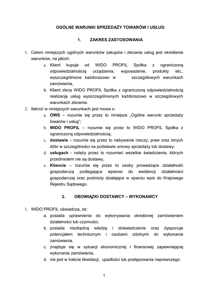 OGÓLNE WARUNKI SPRZEDAŻY TOWARÓW I USŁUG 1. ZAKRES ZASTOSOWANIA 1. Celem niniejszych ogólnych warunków zakupów i zlecania usług jest określenie warunków, na jakich: a. Klient kupuje od WIDO PROFIL Spółka z ograniczoną odpowiedzialnością urządzenia, wyposażenie, produkty etc., wyszczególnione każdorazowo w szczegółowych warunkach zamówienia, b. Klient zleca WIDO PROFIL Spółka z ograniczoną odpowiedzialnością realizację usług wyszczególnionych każdorazowo w szczegółowych warunkach zlecenia. 2. Ilekroć w niniejszych warunkach jest mowa o: a. OWS – rozumie się przez to niniejsze „Ogólne warunki sprzedaży towarów i usług”; b. WIDO PROFIL – rozumie się przez to WIDO PROFIL Spółka z ograniczoną odpowiedzialnością; c. dostawie – rozumie się przez to nabywanie rzeczy, praw oraz innych dóbr w szczególności na podstawie umowy sprzedaży lub dostawy; d. usługach - należy przez to rozumieć wszelkie świadczenia, których przedmiotem nie są dostawy, e. Kliencie – rozumie się przez to osoby prowadzące działalność gospodarczą podlegająca wpisowi do ewidencji działalności gospodarczej oraz podmioty działające w oparciu wpis do Krajowego Rejestru Sądowego. 2. OBOWIĄZKI DOSTAWCY – WYKONAWCY 1. WIDO PROFIL oświadcza, że: a. posiada uprawnienia do wykonywania określonej zamówieniem działalności lub czynności, b. posiada niezbędną wiedzę i doświadczenie oraz dysponuje potencjałem technicznym i osobami zdolnymi do wykonania zamówienia, c. znajduje się w sytuacji ekonomicznej i finansowej zapewniającej wykonanie zamówienia, d. nie jest w trakcie likwidacji, upadłości lub postępowania naprawczego. 1 2. W przypadku, gdy przedmiotem zamówienia jest dostawa WIDO PROFIL zobowiąże się do wykonania zamówienia w umówionym terminie oraz wyposażenia towarów w odpowiednią dokumentację techniczną w języku polskim. 3. W przypadku, gdy przedmiotem zamówienia jest wykonanie usług WIDO PROFIL zobowiąże się do realizacji w wyznaczonym terminie zamówienia zgodnie z zapisami zamówienia, w zakresie ilości, jakości, parametrów i z zastosowaniem obowiązujących w Polsce norm i przepisów prawa. 3 ZAMÓWIENIE - ZAWARCIE UMOWY 1. Klient składać będzie zamówienia w formie pisemnej lub elektronicznej (list, faks, e-mail etc.). 2. W przypadku gdy przedmiotem zamówienia będzie dostawa zamówienie zawierać będzie w szczególności: a. nazwę towaru, b. ilość towaru, c. pożądany termin realizacji, d. dokładną nazwę, adres i dane kontaktowe zamawiającego, e. cenę, jeżeli została uzgodniona. 3. Jeżeli w zamówieniu Klienta nie oznaczono innego terminu, odpowiedź WIDO PROFIL powinna być udzielona w terminie 14 dni licząc od dnia otrzymania zamówienia. 4. W przypadku gdy przedmiotem zamówienia będzie wykonanie usług zamówienie zawierać będzie w szczególności a. rodzaj zlecanej usługi lub roboty, b. pożądany termin realizacji, c. miejsce wykonania, d. cenę, jeżeli została uzgodniona. 5. Umowa zawarta w wyniku złożenia zamówienia przez Klienta oraz jego przyjęcia do realizacji przez WIDO PROFIL powinna być potwierdzona na piśmie, bądź w formie dokumentu podpisanego przez obie strony, bądź w drodze pisemnego potwierdzenia przez WIDO PROFIL przyjęcia zamówienia Klienta. 6. Przedstawiciele handlowi WIDO PROFIL nie są uprawnieni do zaciągania w imieniu i na rzecz WIDO PROFIL jakichkolwiek zobowiązań, chyba że posiadają pisemne pełnomocnictwo o charakterze szczegółowym udzielone przez statutowe organy WIDO PROFIL. 2 7. Projekty umów przedkładane Klientom przez przedstawicieli handlowych WIDO PROFIL nie mają mocy wiążącej i nie stanowią oferty do momentu ich podpisania przez statutowe organy WIDO PROFIL. 3. CENY, FAKTUROWANIE ORAZ ZAPŁATA 1. Strony ustalą, że uzgodnione - wynegocjowane ceny będą cenami netto, niezmiennymi przez cały okres obowiązywania umowy oraz nie podlegającymi indeksacji, chyba, że strony ustalą inne zasady. 2. Aktualne ceny usług świadczonych przez WIDO PROFIL oraz sprzedawanych towarów znajdują się na stronach internetowych WIDO PROFIL pod adresem www.wido.com.pl 3. Zmiana cennika towarów i usług obowiązuje od momentu jej ogłoszenia przez WIDO PROFIL na stronach internetowych WIDO PROFIL pod adresem www.wido.com.pl 4. Wszelkie udzielone Klientowi przez WIDO PROFIL rabaty obowiązują pod warunkiem dokonywania przez Klienta terminowej zapłaty za towary lub usługi. 5. Ceny zawarte w cenniku towarów i usług określone są na bazie loco zakład WIDO PROFIL. 6. Postanowienia niniejszego paragrafu nie znajdują zastosowania w przypadku kiedy zagadnienia dotyczące cen uregulowane są w pisemnej umowie zawartej pomiędzy Klientem a WIDO PROFIL. 7. Faktury będą wystawiane przez WIDO PROFIL po zrealizowaniu dostawy, zgodnie z zasadami określonymi w umowie. 8. Zapłata dokonywana będzie przelewem na konto WIDO PROFIL w terminie podanym na fakturze.. 9. Faktury będą wystawiane osobno dla każdego zamówienia. 10. W przypadku opóźnienia w zapłacie należności przez Klienta WIDO PROFIL ma prawo naliczać odsetki za takie opóźnienie w wysokości odsetek skarbowych. 11. Opóźnienie w zapłacie za towary lub usługi może stanowić podstawę do wstrzymania realizacji zamówień oraz odstąpienia od umowy przez WIDO PROFIL. W takim wypadku WIDO PROFIL nie ponosi odpowiedzialności za szkody Klienta spowodowane tym faktem. 12. Pogorszenie się sytuacji finansowej Klienta może stanowić dla WIDO PROFIL podstawę do wstrzymania realizacji zamówień, chyba że Klient zobowiąże się regulowania zobowiązań i przedstawi stosowne gwarancje bankowe zabezpieczające spłatę należności WIDO PROFIL. 3 13. Strony ustalają iż wszelkie wpłaty realizowane przez Klienta na rzecz WIDO PROFIL zaliczane będą na poczet wierzytelności najdawniej wymagalnych lub odsetek. 5. KREDYT KUPIECKI 1. WIDO PROFIL określa w umowie z Klientem l