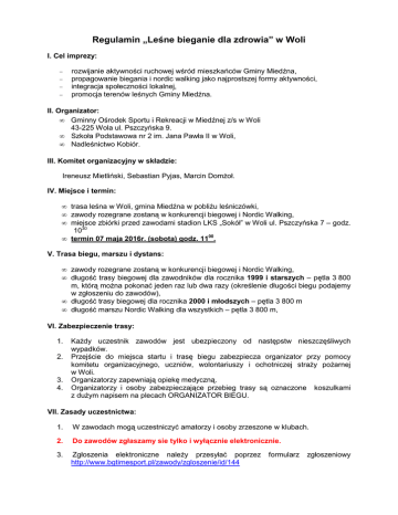 Regulamin „Leśne bieganie dla zdrowia” w Woli I. Cel imprezy: − − − − rozwijanie aktywności ruchowej wśród mieszkańców Gminy Miedźna, propagowanie biegania i nordic walking jako najprostszej formy aktywności, integracja społeczności lokalnej, promocja terenów leśnych Gminy Miedźna. II. Organizator: • Gminny Ośrodek Sportu i Rekreacji w Miedźnej z/s w Woli 43-225 Wola ul. Pszczyńska 9. • Szkoła Podstawowa nr 2 im. Jana Pawła II w Woli, • Nadleśnictwo Kobiór. III. Komitet organizacyjny w składzie: Ireneusz Mietliński, Sebastian Pyjas, Marcin Domżoł. IV. Miejsce i termin: • trasa leśna w Woli, gmina Miedźna w pobliżu leśniczówki, • zawody rozegrane zostaną w konkurencji biegowej i Nordic Walking, • miejsce zbiórki przed zawodami stadion LKS „Sokół” w Woli ul. Pszczyńska 7 – godz. 1030 • termin 07 maja 2016r. (sobota) godz. 1100. V. Trasa biegu, marszu i dystans: • zawody rozegrane zostaną w konkurencji biegowej i Nordic Walking, • długość trasy biegowej dla zawodników dla rocznika 1999 i starszych – pętla 3 800 m, którą można pokonać jeden raz lub dwa razy (określenie długości biegu podajemy w zgłoszeniu do zawodów), • długość trasy biegowej dla rocznika 2000 i młodszych – pętla 3 800 m • długość marszu Nordic Walking dla wszystkich – pętla 3 800 m, VI. Zabezpieczenie trasy: 1. 2. 3. 4. Każdy uczestnik zawodów jest ubezpieczony od następstw nieszczęśliwych wypadków. Przejście do miejsca startu i trasę biegu zabezpiecza organizator przy pomocy komitetu organizacyjnego, uczniów, wolontariuszy i ochotniczej straży pożarnej w Woli. Organizatorzy zapewniają opiekę medyczną. Organizatorzy i osoby zabezpieczające przebieg trasy są oznaczone koszulkami z dużym napisem na plecach ORGANIZATOR BIEGU. VII. Zasady uczestnictwa: 1. W zawodach mogą uczestniczyć amatorzy i osoby zrzeszone w klubach. 2. Do zawodów zgłaszamy sie tylko i wyłącznie elektronicznie. 3. Zgłoszenia elektroniczne należy przesyłać poprzez http://www.bgtimesport.pl/zawody/zgloszenie/id/144 formularz zgłoszeniowy 4. • • • • • 5. Startowe wpłacane na konto do 03 maja 2016r, do godz. 1400, liczy się data uznania rachunku bankowego GOSiR : dzieci i młodzież do lat 18 – w wysokości 10 zł. przelewem na konto, pozostałe osoby – w wysokości 15 zł. przelewem na konto, nr konta: BS Miedźna 27 8446 0006 2001 0000 3095 0002, faktury do odbioru w dniu zawodów na I piętrze w kasie krytej pływalni w Woli. w przypadku absencji uczestnika startowe nie będzie zwracane, Prawo startu w zawodach mają osoby, u których nie ma przeciwwskazań zdrowotnych do udziału w biegach długodystansowych. 6. Zgłoszenie się do zawodów jest jednocześnie oświadczeniem o biegu na własną odpowiedzialność. 1. Oświadczam, że biorę udział w „Leśnym bieganiu dla zdrowia” w Woli na własną odpowiedzialność, mając pełną świadomość, iż udział w biegu wiąże się z wysiłkiem fizycznym i pociąga za sobą naturalne ryzyko zagrożenia wypadkami oraz możliwość odniesienia obrażeń ciała i urazów fizycznych (w tym śmierci). 2. Oświadczam, że znajduję się w dobrym stanie zdrowia i nie są mi znane jakiekolwiek przeciwwskazania zdrowotne do mojego udziału w „Leśnym bieganiu dla zdrowia” w Woli. 3. Oświadczam, że zapoznałem się z regulaminem „Leśnego biegania dla zdrowia” oraz że w pełni akceptuję jego postanowienia i zobowiązuję się do ich przestrzegania. 4. Wyrażam zgodę na przetwarzanie moich danych osobowych, zgodnie z Ustawą z dnia 29 sierpnia 1997 r. o ochronie danych osobowych (Dz. U. nr 133, poz. 883 z późn. zm.), przez organizatorów „Leśnego biegania dla zdrowia” w Woli tj. Gminnego Ośrodka Sportu i Rekreacji w Miedźnej z/s w Woli, Szkołę Podstawową nr 2 im. Jana Pawła II w Woli oraz Nadleśnictwo Kobiór do celów związanych z organizacją i przeprowadzeniem „Leśnego biegania dla zdrowia” oraz do realizacji celów statutowych organizatorów. Zgadzam się, aby moje dane (imię, nazwisko, miasto, klub, data urodzenia) pojawiły się na liście zawodników publikowanej w internecie. 5. Wyrażam zgodę na nieodpłatne wykorzystywanie mojego wizerunku poprzez jego sporządzanie, utrwalanie i rozpowszechnianie przez organizatorów „Leśnego biegania dla zdrowia” w rozumieniu przepisów Ustawy z dnia 4 lutego 1994 r. o prawie autorskim i prawach pokrewnych (Dz. U. z 2014 r. poz. 121 z późn. zm.). Udzielam nieodpłatnej licencji na wykorzystanie mojego utrwalonego wizerunku. 7. Osoby niepełnoletnie zobowiązane są do posiadania pozwolenia na udział w zawodach od rodziców lub prawnych opiekunów. Warunkiem dopuszczenia do startu jest obecność rodzica lub opiekuna wraz z dowodem osobistym w momencie weryfikacji zawodnika w biurze zawodów. Rodzic/prawny opiekun pozostaje na starcie/mecie do momentu ukończenia biegu przez dziecko. OŚWIADCZENIE do pobrania na stronie www.basen.miedzna.pl 8. Limit miejsc startowych wynosi 200 osób, w tym 170 biegających i 30 osób Nordic Walking. VIII. Program zawodów: 1. Zapisy internetowe przez stronę http://www.bgtimesport.pl/zawody/zgloszenie/id/144 od 04 kwietnia 2016r. do 04 maja 2016 r. do godziny 2000 2. W dniu startu: − 930 – 1015 wydawanie numerów i faktur – na I piętrze w kasie krytej pływalni − 1030 zbiórka na stadionie LKS „Sokół” w Woli obok basenu (przebranie się w szatniach i na trybunach stadionu) − 1045 przejście na start (około 400 m) − 1100 start biegu − 1105 start Nordic Walking − po sportowej walce około godziny 1230 spotkanie na trybunach stadionu LKS „Sokół” Wola XI. Klasyfikacje i nagrody 1. Podczas zawodów będą prowadzone następujące klasyfikacje dla kobiet i mężczyzn w biegu i Nordic Walking: − kategoria (dziewcząt i chłopców) rocznik 2000 i młodsi w biegu na 3800 m, − nagrody niespodzianki dla zawodniczek i zawodnikó