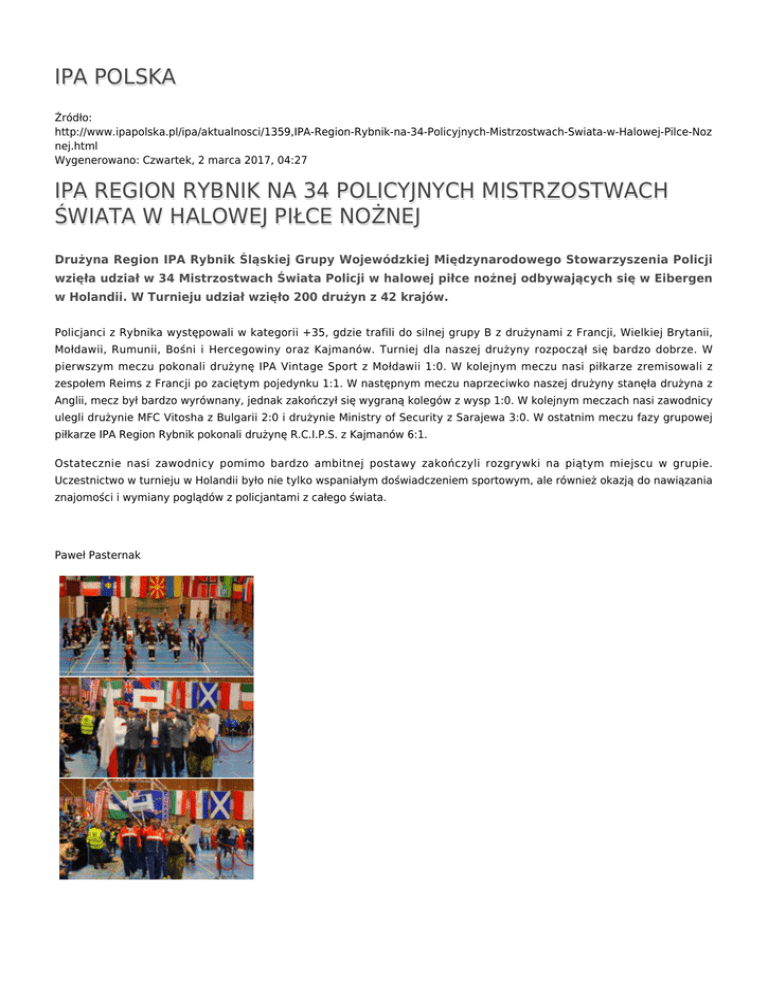 IPA POLSKA Źródło: http://www.ipapolska.pl/ipa/aktualnosci/1359,IPA-Region-Rybnik-na-34-Policyjnych-Mistrzostwach-Swiata-w-Halowej-Pilce-Noz nej.html Wygenerowano: Czwartek, 2 marca 2017, 04:27 IPA REGION RYBNIK NA 34 POLICYJNYCH MISTRZOSTWACH ŚWIATA W HALOWEJ PIŁCE NOŻNEJ Drużyna Region IPA Rybnik Śląskiej Grupy Wojewódzkiej Międzynarodowego Stowarzyszenia Policji wzięła udział w 34 Mistrzostwach Świata Policji w halowej piłce nożnej odbywających się w Eibergen w Holandii. W Turnieju udział wzięło 200 drużyn z 42 krajów. Policjanci z Rybnika występowali w kategorii +35, gdzie trafili do silnej grupy B z drużynami z Francji, Wielkiej Brytanii, Mołdawii, Rumunii, Bośni i Hercegowiny oraz Kajmanów. Turniej dla naszej drużyny rozpoczął się bardzo dobrze. W pierwszym meczu pokonali drużynę IPA Vintage Sport z Mołdawii 1:0. W kolejnym meczu nasi piłkarze zremisowali z zespołem Reims z Francji po zaciętym pojedynku 1:1. W następnym meczu naprzeciwko naszej drużyny stanęła drużyna z Anglii, mecz był bardzo wyrównany, jednak zakończył się wygraną kolegów z wysp 1:0. W kolejnym meczach nasi zawodnicy ulegli drużynie MFC Vitosha z Bulgarii 2:0 i drużynie Ministry of Security z Sarajewa 3:0. W ostatnim meczu fazy grupowej piłkarze IPA Region Rybnik pokonali drużynę R.C.I.P.S. z Kajmanów 6:1. Ostatecznie nasi zawodnicy pomimo bardzo ambitnej postawy zakończyli rozgrywki na piątym miejscu w grupie. Uczestnictwo w turnieju w Holandii było nie tylko wspaniałym doświadczeniem sportowym, ale również okazją do nawiązania znajomości i wymiany poglądów z policjantami z całego świata. Paweł Pasternak Ocena: 0/5 (0) Tweetnij