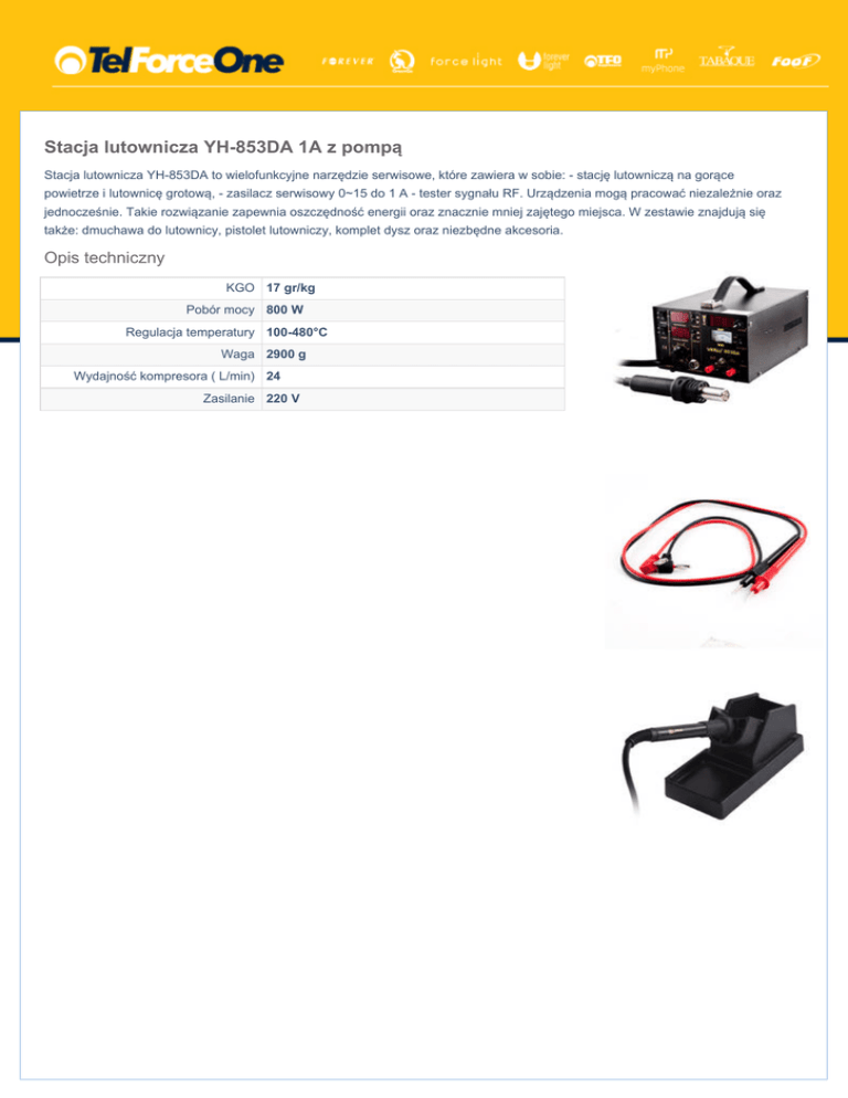 Stacja lutownicza YH-853DA 1A z pompą Stacja lutownicza YH-853DA to wielofunkcyjne narzędzie serwisowe, które zawiera w sobie: - stację lutowniczą na gorące powietrze i lutownicę grotową, - zasilacz serwisowy 0~15 do 1 A - tester sygnału RF. Urządzenia mogą pracować niezależnie oraz jednocześnie. Takie rozwiązanie zapewnia oszczędność energii oraz znacznie mniej zajętego miejsca. W zestawie znajdują się także: dmuchawa do lutownicy, pistolet lutowniczy, komplet dysz oraz niezbędne akcesoria. Opis techniczny KGO 17 gr/kg Pobór mocy 800 W Regulacja temperatury 100-480°C Waga 2900 g Wydajność kompresora ( L/min) 24 Zasilanie 220 V