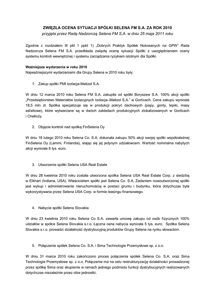 ZWIĘZŁA OCENA SYTUACJI SPÓŁKI SELENA FM S.A. ZA ROK 2010 przyjęta przez Radę Nadzorczą Selena FM S.A. w dniu 25 maja 2011 roku Zgodnie z rozdziałem III pkt 1 ppkt 1) „Dobrych Praktyk Spółek Notowanych na GPW” Rada Nadzorcza Selena FM S.A. przedkłada zwięzłą ocenę sytuacji Spółki z uwzględnieniem oceny systemu kontroli wewnętrznej i systemu zarządzania ryzykiem istotnym dla Spółki. Ważniejsze wydarzenia w roku 2010 Najważniejszymi wydarzeniami dla Grupy Selena w 2010 roku były: 1. Zakup spółki PMI Izolacja-Matizol S.A. W dniu 12 marca 2010 roku Selena FM S.A. zakupiła od spółki Boryszew S.A. 100% akcji spółki „Przedsiębiorstwo Materiałów Izolacyjnych Izolacja–Matizol S.A.” w Gorlicach. Cena zakupu wyniosła 18,5 mln zł. Spółka specjalizuje się w produkcji pokryć dachowych (papy, gonty, lepiki, masy asfaltowe), które wytwarzane są w dwóch zakładach produkcyjnych zlokalizowanych w Gorlicach i Chełmży. 2. Objęcie kontroli nad spółką FinSelena Oy W dniu 18 lutego 2010 roku Selena Co. S.A. dokonała zakupu 50% akcji swojej spółki współzależnej FinSelena Oy (Lammi, Finlandia), stając się jej jedynym udziałowcem. Wartość nominalna nabytych akcji wyniosła 8 tys. euro. 3. Utworzenie spółki Selena USA Real Estate W dniu 28 kwietnia 2010 roku została utworzona spółka Selena USA Real Estate Corp. z siedzibą w Elkhart (Indiana, USA). Właścicielem spółki jest Selena Co. S.A. Zadaniem nowoutworzonej spółki jest wykup i administrowanie nieruchomością w postaci gruntu i budynku, która dotychczas była wykorzystywana przez Selena USA Corp. w formie leasingu finansowego. 4. Nabycie spółki Selena Slovakia W dniu 23 kwietnia 2010 roku Selena Co S.A. zawarła umowę zakupu od osób fizycznych 100% udziałów w spółce Selena Slovakia s.r.o. Łączna cena nabycia wyniosła 5 tys. euro. Spółka Selena Slovakia s.r.o. prowadzi działalność dystrybucyjną produktów Grupy Selena na rynku słowackim. 5. Połączenie spółek Selena Co. S.A. i Sima Technologie Przemysłowe sp. z o.o. W dniu 31 marca 2010 roku zakończono proces połączenia spółek Selena Co. S.A. oraz Sima Technologie Przemysłowe sp. z o.o. Połączenie ma na celu restrukturyzację działalności prowadzonej przez spółkę Sima oraz skupienie w ramach jednego podmiotu funkcji dystrybucyjnych realizowanych dotychczas niezależnie przez obie jednostki. 6. Reorganizacja działalności Grupy w Turcji W 2009 roku została założona w Turcji spółka Selena Danismanlik, której udziałowcami są jednostki zależne spółki Selena FM – Carina Silicones sp. z o.o. (99%) oraz Reserach Center of Construction Technology sp. z o.o.(1%). Nowopowstała spółka przejęła działalność oraz majątek zakupionej przez Grupę w 2008 roku spółki Polyfoam. Kontynuowany jest proces restrukturyzacji zadłużenia spółki Polyfoam, która na dzień 31 grudnia 2010 roku wykazuje z zobowiązania z tytułu kredytów i pożyczek w wysokości 9,6 mln zł (w tym 4,3 mln zł wobec jednostek Grupy Selena FM). Na mocy porozumienia z Grupą Selena, udziałowiec mniejszościowy spółki Polyfoam, który gwarantował kredyty bankowe spółki, spłacił je z własnych środków w I kwartale 2011 roku. 7. Reorganizacja działalności Centrali Grupy W 2010 roku Zarząd Grupy rozpoczął projekt optymalizacji struktury organizacyjno-finansowej Centrali Grupy, którego elementami są: restrukturyzacja finansowa spółki Selena Co. S.A. oraz przeniesienie działalności operacyjnej oraz funkcji nadzoru właścicielskiego nad działalnością spółek zagranicznych do Selena FM S.A. 8. Reorganizacja spółki Siloxane sp. z o.o. W dniu 21 października 2010 roku dokonano zmiany nazwy spółki Siloxane sp. z o.o. na Research Centre of Construction Technology sp. z o.o. (RCoCT). Spółka w nowej formie rozpoczęła działalność jesienią 2010 roku. Jej zadaniem jest integracja i intensyfikacja działań badawczo-rozwojowych prowadzonych dotychczas niezależnie w poszczególnych spółkach w Grupie oraz wsparcie strategii budowania przewagi konkurencyjnej Grupy w oparciu o innowacyjne produkty i rozwiązania techniczne. 9. Zakończenie akwizycji spółki Quilosa – zdarzenie po dacie bilansu W dniu 30 marca 2011 roku Selena Co. S.A. i Holding Lowinter XXI S.L. (następca prawny Quilosa Holding XXI S.L.) podpisali dodatkową umowę, na mocy której Selena Co. S.A. dokonała zakupu pozostałych 49% udziałów spółki Quilosa przed terminem przewidzianym w umowie pierwotnej. Cena zakupu udziałów wyniosła 5,31 mln euro. 10. Uruchomienie produkcji testowej w fabryce w Nantongu W grudniu 2010 roku zakończono budowę zakładu produkcyjnego w Nantongu (Chiny) i rozpoczęto produkcję testową pian montażowych. W lutym 2011 roku nastąpiło uruchomienie regularnej 2 produkcji. Docelowo nowa fabryka będzie również produkować kleje i uszczelniacze, a jej planowane przychody mają przekroczyć 30 mln euro. Podstawowe wyniki finansowe Grupy i Spółki W okresie sprawozdawczym Grupa Selena osiągnęła przychody ze sprzedaży w wysokości 879 mln zł wobec 640 mln zł w roku 2009, tj. wyższe o 37 %. Zysk brutto na sprzedaży w 2010 roku wyniósł 267 mln zł wobec 216 mln zł w roku 2009, co oznacza wzrost o 23 % i uzyskanie rentowności na poziomie 30 %. Zysk netto w 2010 roku ukształtował się na poziomie 24 mln zł wobec 16 mln zł w 2009 roku. Oznacza to osiągnięcie rentowności netto na poziomie 3 %. Suma bilansowa Grupy Selena na dzień 31 grudnia 2010 roku wyniosła 603 mln zł, co oznacza jej wzrost o 12 % w odniesieniu do stanu na koniec 2009 r. Największy udział w wartości aktywów przypada na aktywa obrotowe – 334 mln zł., w których największą wartość stanowią należności handlowe (137 mln zł) oraz zapasy (119 mln zł). Aktywa trwałe o wartości 270 mln zł stanowią 45 % wartości sumy bilansowej Grupy, a największy udział w tej pozycji bilansowej mają rzeczow