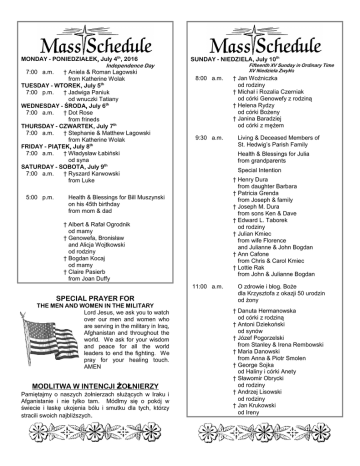 MONDAY - PONIEDZIAŁEK, July 4th, 2016 Independence Day 7:00 a.m. † Aniela & Roman Lagowski from Katherine Wolak TUESDAY - WTOREK, July 5th 7:00 p.m. † Jadwiga Paniuk od wnuczki Tatiany WEDNESDAY - ŚRODA, July 6th 7:00 a.m. † Dot Rose from frineds THURSDAY - CZWARTEK, July 7th 7:00 a.m. † Stephanie & Matthew Lagowski from Katherine Wolak FRIDAY - PIĄTEK, July 8th 7:00 a.m. † Władysław Łabiński od syna SATURDAY - SOBOTA, July 9th 7:00 a.m. † Ryszard Karwowski from Luke 5:00 p.m. SUNDAY - NIEDZIELA, July 10th Fifteenth XV Sunday in Ordinary Time XV Niedziela Zwykła 8:00 a.m. 9:30 a.m. Special Intention † Henry Dura from daughter Barbara † Patricia Grenda from Joseph & family † Joseph M. Dura from sons Ken & Dave † Edward L. Taborek od rodziny † Julian Kmiec from wife Florence and Julianne & John Bogdan † Ann Cafone from Chris & Carol Kmiec † Lottie Rak from John & Julianne Bogdan † Albert & Rafał Ogrodnik od mamy † Genowefa, Bronisław and Alicja Wojtkowski od rodziny † Bogdan Kocaj od mamy † Claire Pasierb from Joan Duffy 11:00 a.m. SPECIAL PRAYER FOR MODLITWA W INTENCJI ŻOŁNIERZY Pamiętajmy o naszych żołnierzach służących w Iraku i Afganistanie i nie tylko tam. Módlmy się o pokój w świecie i łaskę ukojenia bólu i smutku dla tych, którzy stracili swoich najbliższych. Living & Deceased Members of St. Hedwig’s Parish Family Health & Blessings for Julia from grandparents Health & Blessings for Bill Muszynski on his 45th birthday from mom & dad THE MEN AND WOMEN IN THE MILITARY Lord Jesus, we ask you to watch over our men and women who are serving in the military in Iraq, Afghanistan and throughout the world. We ask for your wisdom and peace for all the world leaders to end the fighting. We pray for your healing touch. AMEN † Jan Woźniczka od rodziny † Michał i Rozalia Czerniak od córki Genowefy z rodziną † Helena Rydzy od córki Bożeny † Janina Baradziej od córki z mężem O zdrowie i błog. Boże dla Krzysztofa z okazji 50 urodzin od żony † Danuta Hermanowska od córki z rodziną † Antoni Dziekoński od synów † Józef Pogorzelski from Stanley & Irena Rembowski † Maria Danowski from Anna & Piotr Smolen † George Sojka od Haliny i córki Anety † Sławomir Obrycki od rodziny † Andrzej Lisowski od rodziny † Jan Krukowski od Ireny XIV NIEDZIELA ZWYKŁA - Łk 10,1-12.17-20: Jezus wyznaczył jeszcze innych siedemdziesięciu dwóch i wysłał ich po dwóch przed sobą do każdego miasta i miejscowości, dokąd sam przyjść zamierzał. Powiedział też do nich: żniwo wprawdzie wielkie, ale robotników mało; proście więc Pana żniwa, żeby wyprawił robotników na swoje żniwo. Idźcie, oto was posyłam jak owce między wilki. Nie noście z sobą trzosa ani torby, ani sandałów; i nikogo w drodze nie pozdrawiajcie! Gdy do jakiego domu wejd ziecie, najpierw mówcie: Pokój temu domowi! Jeśli tam mieszka człowiek godny pokoju, wasz pokój spocznie na nim; jeśli nie, powróci do was. W tym samym domu zostańcie, jedząc i pijąc, co mają: bo zasługuje robotnik na swoją zapłatę. Nie przechodźcie z domu do domu. Jeśli do jakiego miasta wejdziecie i przyjmą was, jedzcie, co wam podadzą; uzdrawiajcie chorych, którzy tam są, i mówcie im: Przybliżyło się do was królestwo Boże. Lecz jeśli do jakiego miasta wejdziecie, a nie przyjmą was, wyjdźcie na jego ulice i powiedzcie: Nawet proch, który z waszego miasta przylgnął nam do nóg, strząsamy wam. Wszakże to wiedzcie, że bliskie jest królestwo Boże. Powiadam wam: Sodomie lżej będzie w ów dzień niż temu miastu. Wróciło siedemdziesięciu dwóch z radością mówiąc: Panie, przez wzgląd na Twoje imię, nawet złe duchy nam się poddają. Wtedy rzekł do nich: Widziałem szatana, spadającego z nieba jak błyskawica. Oto dałem wam władzę stąpania po wężach i skorpionach, i po całej potędze przeciwnika, a nic wam nie zaszkodzi. Jednak nie z tego się cieszcie, że duchy się wam poddają, lecz cieszcie się, że wasze imiona zapisane są w niebie. Z dzisiejszych czytań wyłania się temat pokoju ukazany w wielorakich aspektach. Pierwsze czytanie (Iz 66, 10-14c) przedstawia go jako syntezę — dóbr — radości, bezpieczeństwa, szczęścia, spokoju, pociechy — jakie Bóg obiecał odnowionej Jerozolimie, po wygnaniu babilońskim. „Oto skieruję do niej pokój jak rzekę i chwałę narodów jak strumień wezbrany... Jak kogo pociesza własna matka, tak Ja was pocieszać będę” (ww. 12-13). Cały ten zestaw określeń mówi jasno, że chodzi tu o dar Boży, charakterystyczny dla czasów mesjańskich. Jezus przyniesie ten pokój, który będzie równocześnie łaską, zbawieniem, szczęściem wiecznym, nie tylko dla poszczególnych ludzi, lecz dla całego Ludu Bożego, napływającego z całego świata do Jerozolimy niebieskiej, królestwa doskonałego pokoju. Lecz także Kościół jako nowa Jerozolima ziemska, posiada skarb pokoju, który ofiarował Jezus ludziom dobrej woli, i ma za zadanie rozszerzać go na świecie. Ten obowiązek powierzył Zbawiciel siedemdziesięciu dwom uczniom posianym głosić królestwo Boże. „Idźcie, oto was posyłam jak owce między wilki” (w. 3). Ta wypowiedź wskazuje właśnie na posłannictwo cichości, dobroci, pokoju. Posłannictwo podobne do Jezusowego: „Oto Baranek Boży, który gładzi grzechy świata” (J 1, 29), nie potępiający grzeszników, lecz ofiarujący siebie samego, „wprowadziwszy pokój przez krew Jego krzyża” (Kol 1, 20). „Gdy do jakiego domu wejdziecie, najpierw mówcie: pokój temu domowi! Jeśli tam mieszka człowiek godny pokoju, wasz pokój spocznie na nim; jeśli nie, powróci do was”. Nie chodzi tutaj o zwykłe pozdrowienie, lecz o błogosławieństwo Boże przynoszące dobro i zbawienie. Gdzie „zstępuje” pokój Jezusa, który pojednał ludzi z Bogiem i miedzy sobą, tam zstępuje zbawienie. Człowiek przyjmujący je w pokoju z Bogiem i