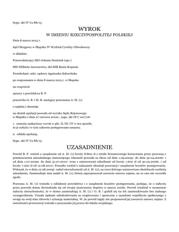 Sygn. akt IV Ca 88/13 WYROK W IMIENIU RZECZYPOSPOLITEJ POLSKIEJ Dnia 8 marca 2013 r. Sąd Okręgowy w Słupsku IV Wydział Cywilny Odwoławczy w składzie: Przewodniczący SSO Jolanta Deniziuk (spr.) SSO Elżbieta Jaroszewicz, del.SSR Beata Kopania Protokolant: sekr. sądowy Agnieszka Sobocińska po rozpoznaniu w dniu 8 marca 2013 r. w Słupsku na rozprawie sprawy z powództwa B. P. przeciwko G. B. i M. B. następcy prawnemu A. M. (1) o zapłatę i eksmisję na skutek apelacji powoda od wyroku Sądu Rejonowego w Słupsku z dnia 27 czerwca 2012r., sygn. akt IX C 207/06 1. zmienia zaskarżony wyrok w pkt. II, III i IV w ten sposób, że je uchyla i w tym zakresie postępowanie umarza; 2. oddala apelację. Sygn. akt IV Ca 88/13 UZASADNIENIE Powód B. P. wniósł o zasądzenie od A. M. (1) kwoty 8.800 zł z tytułu bezumownego korzystania przez pozwaną z pomieszczenia mieszkalnego stanowiącego własność powoda za okres od dnia 1.09.2005r. do dnia 30.04.2006r. i od dnia 1.07.2009r. do dnia 31.07.2011r. wraz z ustawowymi odsetkami od kwoty 1.600 zł od 30.05.2006r. i od kwoty 7.200 zł od 12.08.2011r. Ponadto wniósł o nakazanie eksmisji pozwanej i zasądzenie kosztów postępowania. Wskazał, że w dniu 12.08.2005r. nabył nieruchomość od A. M. (2), na rzecz którego ustanowiono służebność osobistą mieszkania. Zamieszkuje tam nadal A. M. (1), której zaproponował zawarcie umowy najmu, na co ona nie wyraziła zgody. Pozwana A. M. (1) wniosła o oddalenie powództwa i o zasądzenie kosztów postępowania, podając, że o nabyciu przez powoda domu dowiedziała się od swojej siostrzenicy dopiero w marcu 2006r. Powód wiedział w momencie nabycia nieruchomości, że w domu zamieszkują A. M. (1) i G. B. i godził się na ich zamieszkiwanie bez żadnego wynagrodzenia. Uznała żądanie odszkodowania za wygórowane i sprzeczne z zasadami współżycia społecznego z uwagi na swój stan zdrowia i sytuację materialną. W.,że powód nigdy nie proponował jej zawarcia umowy najmu. Z ostrożności procesowej wniosła o przyznanie jej prawa do lokalu socjalnego. Rozpoznający sprawę w I instancji Sąd Rejonowy ustalił, że w dniu 12.08.2005r. B. P. nabył od A. M. (2) nieruchomość stanowiącą działkę zabudowaną, położoną w K., dla której Sąd Rejonowy w Słupsku prowadzi KW nr (...). Strony umowy ustanowiły na rzecz A. M. (2) służebność osobistą mieszkania, polegającą na bezpłatnym i dożywotnim prawie do wyłącznego korzystania przez uprawnionego z dwóch pokoi znajdujących się na parterze budynku mieszkalnego oraz prawa do korzystania ze służących do użytku wspólnego kuchni, łazienki, wc i korytarza. W dacie zbycia nieruchomości ,za zgodą A. M. (2), w domu zamieszkiwała między innymi , A. M. (1) – siostra A. M. (2) . A. M. (2) i A. M. (1) prowadzili wspólne gospodarstwo domowe. Pozwana pomagała A. M. (2) w codziennym życiu, gotowała dla niego posiłki, sprzątała. W chwili zawarcia umowy A. M. (2) miał 70 lat, cierpiał na zespół otępienny, głuchotę lewego ucha oraz głęboki niedosłuch odbiorczy prawostronny. Ponadto A. M. (2) cierpiał na żylakowate owrzodzenie podudzi. Z ustaleń Sądu Rejonowego wynika dalej, że B. P. zaproponował A. M. (1) w dniu 1.04.2006r. zawarcie umowy najmu zajmowanych przez nią lokalu. Strony nie doszły do porozumienia w tym zakresie . W tych okolicznościach B. P. wezwał A. M. (1) pismem z dnia 26.04.2006r. do zapłaty wynagrodzenia za bezumowne korzystanie z nieruchomości oraz w przypadku niezawarcia umowy najmu do opuszczenia lokalu w terminie do końca maja 2006r. A. M. (1) sprzeciwiła się żądaniu zarówno w zakresie zapłaty za bezumowne korzystanie z nieruchomości jak i co do opuszczenia lokalu. Sąd Rejonowy ustalił w dalszej kolejności, że strony są silnie skłócone. Na tle korzystania przez pozwaną z nieruchomości dochodziło do ciągłych nieporozumień, interweniowała policja, toczyło się postępowanie o ochronę naruszonego posiadania. Miesięczny czynsz najmu dla lokalu mieszkalnego położonego na dole spornej nieruchomości wynosi 121 zł. A. M. (1) nie uiszczała opłat związanych z korzystaniem z lokali. A. M. (1) pobierała emeryturę w wysokości 821,35 zł. Pozwana nie miała prawa do innego lokalu. Mając na uwadze tak ustalony stan faktyczny sprawy Sąd Rejonowy w Słupsku wyrokiem z dnia 27 czerwca 2012r. zasądził od pozwanej A. M. (1) na rzecz powoda B. P. kwotę 2.177,50 zł z odsetkami ustawowymi od dnia 26.08.2011r. do dnia zapłaty, nakazał pozwanej ,aby opuściła, opróżniła i wydała powodowi B. P. lokal mieszkalny położony w K. przy ul. (...), orzekł, że pozwanej przysługuje prawo do lokalu socjalnego, nakazał jednak wstrzymanie wykonania opróżnienia lokalu do czasu złożenia przez Gminę K. oferty zawarcia z pozwaną A. M. (1) umowy najmu lokalu socjalnego, oddalił powództwo pozostałym zakresie. Następnie rozliczył koszty procesu zgodnie z wynikiem postępowania uwzględniając , iż pozwana korzystała z pomocy prawnej udzielonej jej z urzędu. Sąd Rejonowy uznał powództwo o nakazanie eksmisji pozwanej z lokalu należącego do powoda za zasadne, natomiast jedynie w części uwzględnił powództwo o zapłatę .Sąd I instancji miał na uwadze, że pozwana korzystała z nieruchomości, obecnie stanowiącej własność powoda. Tym nie mniej czerpała własne prawo do korzystania z nieruchomości od A. M. (2), na którego rzecz ustanowiono służebność osobistą mieszkania, polegającą na bezpłatnym i dożywotnim prawie do wyłącznego korzystania przez uprawnionego z dwóch pokoi znajdujących się na parterze budynku mieszkalnego oraz prawa do korzystania ze służących do użytku wspólnego kuchni, łazienki, wc i korytarza. Pozwana A. M. (1) swoje uprawnienie do korzystania i zamieszkiwania w lokalu położonym na dole budynku wywodziła więc regulacji zwartej w art. 301 kc. Dopóki żył A. M. (2), tj. do dnia 4.02.2010r., istn
