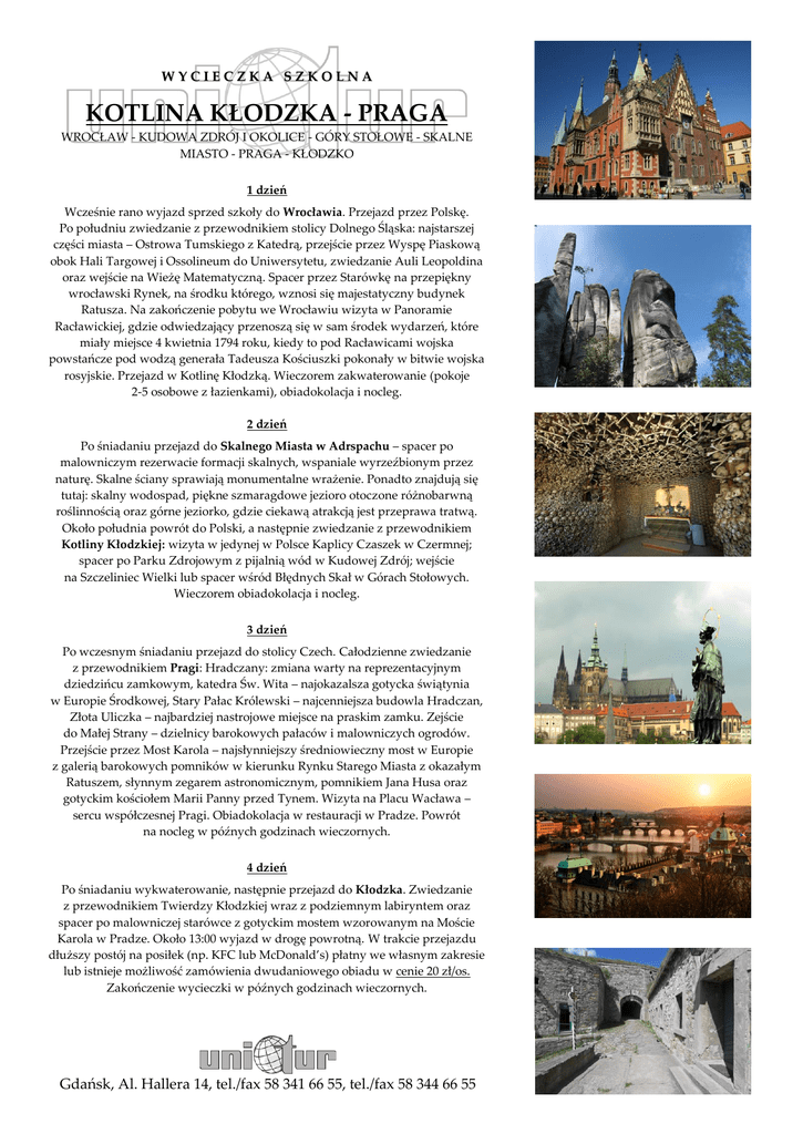 WYCIECZKA SZKOLNA KOTLINA KŁODZKA - PRAGA WROCŁAW - KUDOWA ZDRÓJ I OKOLICE - GÓRY STOŁOWE - SKALNE MIASTO - PRAGA - KŁODZKO 1 dzień Wcześnie rano wyjazd sprzed szkoły do Wrocławia. Przejazd przez Polskę. Po południu zwiedzanie z przewodnikiem stolicy Dolnego Śląska: najstarszej części miasta – Ostrowa Tumskiego z Katedrą, przejście przez Wyspę Piaskową obok Hali Targowej i Ossolineum do Uniwersytetu, zwiedzanie Auli Leopoldina oraz wejście na Wieżę Matematyczną. Spacer przez Starówkę na przepiękny wrocławski Rynek, na środku którego, wznosi się majestatyczny budynek Ratusza. Na zakończenie pobytu we Wrocławiu wizyta w Panoramie Racławickiej, gdzie odwiedzający przenoszą się w sam środek wydarzeń, które miały miejsce 4 kwietnia 1794 roku, kiedy to pod Racławicami wojska powstańcze pod wodzą generała Tadeusza Kościuszki pokonały w bitwie wojska rosyjskie. Przejazd w Kotlinę Kłodzką. Wieczorem zakwaterowanie (pokoje 2-5 osobowe z łazienkami), obiadokolacja i nocleg. 2 dzień Po śniadaniu przejazd do Skalnego Miasta w Adrspachu – spacer po malowniczym rezerwacie formacji skalnych, wspaniale wyrzeźbionym przez naturę. Skalne ściany sprawiają monumentalne wrażenie. Ponadto znajdują się tutaj: skalny wodospad, piękne szmaragdowe jezioro otoczone różnobarwną roślinnością oraz górne jeziorko, gdzie ciekawą atrakcją jest przeprawa tratwą. Około południa powrót do Polski, a następnie zwiedzanie z przewodnikiem Kotliny Kłodzkiej: wizyta w jedynej w Polsce Kaplicy Czaszek w Czermnej; spacer po Parku Zdrojowym z pijalnią wód w Kudowej Zdrój; wejście na Szczeliniec Wielki lub spacer wśród Błędnych Skał w Górach Stołowych. Wieczorem obiadokolacja i nocleg. 3 dzień Po wczesnym śniadaniu przejazd do stolicy Czech. Całodzienne zwiedzanie z przewodnikiem Pragi: Hradczany: zmiana warty na reprezentacyjnym dziedzińcu zamkowym, katedra Św. Wita – najokazalsza gotycka świątynia w Europie Środkowej, Stary Pałac Królewski – najcenniejsza budowla Hradczan, Złota Uliczka – najbardziej nastrojowe miejsce na praskim zamku. Zejście do Małej Strany – dzielnicy barokowych pałaców i malowniczych ogrodów. Przejście przez Most Karola – najsłynniejszy średniowieczny most w Europie z galerią barokowych pomników w kierunku Rynku Starego Miasta z okazałym Ratuszem, słynnym zegarem astronomicznym, pomnikiem Jana Husa oraz gotyckim kościołem Marii Panny przed Tynem. Wizyta na Placu Wacława – sercu współczesnej Pragi. Obiadokolacja w restauracji w Pradze. Powrót na nocleg w późnych godzinach wieczornych. 4 dzień Po śniadaniu wykwaterowanie, następnie przejazd do Kłodzka. Zwiedzanie z przewodnikiem Twierdzy Kłodzkiej wraz z podziemnym labiryntem oraz spacer po malowniczej starówce z gotyckim mostem wzorowanym na Moście Karola w Pradze. Około 13:00 wyjazd w drogę powrotną. W trakcie przejazdu dłuższy postój na posiłek (np. KFC lub McDonald’s) płatny we własnym zakresie lub istnieje możliwość zamówienia dwudaniowego obiadu w cenie 20 zł/os. Zakończenie wycieczki w późnych godzinach wieczornych. Gdańsk, Al. Hallera 14, tel./fax 58 341 66 55, tel./fax 58 344 66 55 Cena obejmuje: przejazd wygodnym autokarem, opłaty drogowe (autostrady) i parkingi, opiekę pilota wycieczki na całej trasie, usługi licencjonowanych przewodników, 3 noclegi, 3 śniadania, 3 obiadokolacje, ubezpieczenie. DZIECI pow. 40 36 – 40 31 – 35 CENA 570,625,685,- Bilety wstępu do zwiedzanych obiektów płatne dodatkowo – od 35 zł/os. Sugerowane bilety wstępów: Adrspach – Skalne Miasto ………………………………………………………………………..cena: ok. 35 koron – tj.: ok. 6 zł/os. Adrspach – Skalne Miasto – przejażdżka łódką ………………………………………………. cena: ok. 50 koron – tj.: ok. 9 zł/os. Czermna – Kaplica Czaszek ……………………………………………………………………...cena: ok. 3 zł/os. Góry Stołowe – Szczeliniec Wielki lub Błędne Skały …………………………………………. cena: ok. 3 zł/os. Kłodzko – Twierdza Kłodzka …………………………………………………………………… cena: ok. 14 zł/os. Zamiennie lub dodatkowo proponujemy: Wrocław – Panorama Racławicka ………………………………………………………………. cena: ok. 23 zł/os. Wrocław – Aula Leopoldyńska + Wieża Matematyczna ……………………………………... cena: ok. 6 zł/os. Praga - Hradczany (Katedra św. Wita, Stary Pałac Królewski, Bazylika Św. Jerzego, Złota Uliczka) ..... cena: ok. 125 koron – tj.: ok. 22 zł/os. Złoty Stok – Kopalnia Złota ………………………………..…………………………….……… cena: ok. 15 zł/os. Zamek Książ – Od Piastów do Tajemnic II Wojny Światowej ………………………….……. cena: ok. 29 zł/os. Srebrna Góra – Twierdza – Pakiet Armata ……………………………….……………………. cena: ok. 16 zł/os. Nowa Ruda – Kopalnia Węgla ………………………………………..………………...……… cena: ok. 14 zł/os. Osówka – Podziemne Miasto – Trasa Historyczna………….…….………………………..…. cena: ok. 14 zł/os. Osówka – Podziemne Miasto – Trasa Ekstremalna………….…….……………………….…. cena: ok. 22 zł/os. Walim – Sztolnie Walimskie – Podziemny Kompleks Rzeczka ……………………..………. cena: ok. 12 zł/os. Wycieczka z przewodnikiem górskim na Śnieżnik ……………………………………….….. bezpłatnie Jaskinia Niedźwiedzia ( wymagana rezerwacja z rocznym wyprzedzeniem ! ).…...…..….. cena: ok. 15 zł/os. Kletno – Kopalnia Uranu ……………………………………...………………………………… cena: ok. 15 zł/os. i inne wedle Pa