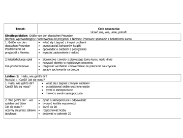 Temat: Cele nauczania: Uczeń zna, wie, umie, potrafi: Einstiegslektion: Grüße von den deutschen Freunden Rozdział wprowadzający: Pozdrowienia od przyjaciół z Niemiec. Ponowne spotkanie z bohaterami kursu 1. Grüße von den witać się i żegnać z innymi osobami deutschen Freunden przedstawiać bohaterów książki Pozdrowienia od opowiadać o osobach z podręcznika przyjaciół z Niemiec wyrażać zadowolenie i radość 2.Wiederholungs-spiel Gra powtórzeniowa słownictwo i zwroty z pierwszego tomu kursu Hallo Anna nazywać obiekty w najbliższym otoczeniu reagować werbalnie i niewerbalnie na polecenia nauczyciela zasady zachowania na drodze Lektion 1: Hallo, wie geht’s dir? Rozdział 1: Cześć! Jak się masz? 1. Hallo, wie geht’s dir? witać się i żegnać z innymi osobami Cześć! Jak się masz? przedstawiać siebie oraz inne osoby pytać o samopoczucie mówić o swoim samopoczuciu 2. Wie geht’s dir? - wir spielen und üben Jak się masz? uczymy się przez zabawy językowe pytać o samopoczucie i odpowiadać tworzyć krótkie wypowiedzi liczyć do 20 rozpoznawać liczby dodawać w zakresie 20 3. Grazias neue Freunde Nowi przyjaciele Grazii 4. Das ist ja wunderbar! To jest po prostu cudowne! 5. Scherz-Zoo und Humor-Labor Wesołe zoo i komiks 6. Testowanie umiejętności uczniów (Lektion 1) Stationen śpiewać piosenkę i wykonywać zadania do tekstu ćwiczyć wymowę rozumieć wypowiedź ze słuchu: rozumieć sens prostych dialogów w nagraniu, rozpoznawać zwroty stosowane na co dzień wykonywać sztuczkę z piłeczką czytać ze zrozumieniem wyrazy i proste zdania na temat zwierząt odgrywać scenkę na podstawie komiksu witać się i żegnać przedstawiać siebie oraz inne osoby zadawać pytania na temat samopoczucia i odpowiadać na pytania liczyć i nazywać liczby do 20 Lektion 2: Ich höre gern Musik Rozdział 2: Lubię słuchać muzyki - opowiadanie o swoim hobby 1. Ich höre gern Musik Lubię słuchać muzyki 2. Ich spiele gern - wir spielen und üben Lubię się bawić - uczymy się przez zabawy językowe 3. Ich mache gern Filme Lubię kręcić filmy opowiadać o swoim hobby pytać o zainteresowania innych nazywać zajęcia ulubione i wykonywane mniej chętnie reagować werbalnie i niewerbalnie na polecenia nauczyciela zadawać pytania i udzielać odpowiedzi tworzyć krótkie wypowiedzi przedstawiać pantomimę współpracować z rówieśnikami rozumieć wypowiedzi ze słuchu czytać ze zrozumieniem proste zdania opowiadać o ulubionych zajęciach 4. Wer bist du? Kto ty jesteś? 5. Scherz-Zoo und Humor-Labor Wesołe zoo i komiks wykonywać sztuczkę z kartami śpiewać piosenkę powtarzać słowa piosenki przedstawiać tekst piosenki czytać ze zrozumieniem wyrazy i proste zdania na temat ulubionych zajęć zwierząt rozumieć sens historyjki obrazkowej odgrywać scenki na podstawie komiksu 6. Testowanie umiejętności uczniów (Lektion 2) Stationen opowiadać o swoim hobby pytać o zainteresowania innych Lektion 3: Zum Geburtstag viel Glück Rozdział 3: Wszystkiego najlepszego z okazji urodzin - składanie życzeń urodzinowych 1. Zum Geburtstag viel składać życzenia urodzinowe Glück Wszystkiego nazywać prezenty najlepszego z okazji opisywać prezenty urodzin wyrażać zadowolenie recytować rymowankę z przymiotnikami – rap 2. Das ist ein Teddy wir spielen und üben To jest miś uczymy się przez zabawy językowe 3. Spielsachen und Spielsachen Zabawki 4. Hipp-hipp-hurra - nazywać wybrane prezenty i zabawki opisywać prezenty współpracować z rówieśnikami rozumieć wypowiedzi ze słuchu nazywać i opisywać zabawki i prezenty wykonywać sztuczkę z kwiatem śpiewać piosenkę piosenka 5. Scherz-Zoo und Humor-Labor Wesołe zoo i komiks 6. Testowanie umiejętności uczniów (Lektion 3) Stationen pracować z tekstem czytać ze zrozumieniem wyrazy i proste zdania na temat kota odgrywać scenki na podstawie komiksu składać życzenia urodzinowe nazywać prezenty opisywać prezenty wyrażać zadowolenie Lektion 4: Ich kann singen und tanzen Rozdział 4: Potrafię śpiewać i tańczyć - opowiadanie o tym, co się potrafi, a czego nie, pytanie o zainteresowania innych, wyrażanie powątpiewania 1. Ich kann singen und mówić o tym, co potrafi, a czego nie tanzen Potrafię śpiewać i pytać o zainteresowania innych tańczyć wyrażać powątpiewanie 2. Kannst du singen? mówić o swoich talentach wir spielen und üben pytać innych o to, co potrafią robić Czy potrafisz śpiewać? - przedstawiać pantomimę uczymy się przez zabawę reagować na polecenia nauczyciela wypełniać ankietę 3. Talente gesucht rozumieć ze słuchu wypowiedzi dzieci Poszukiwanie talentów wykonywać sztuczkę 4. Ich kann alles machen śpiewać piosenkę Potrafię wszystko! reagować werbalnie i niewerbalnie na polecenia nauczyciela 5. Scherz-Zoo und Humor-Labor Wesołe zoo i komiks czytać ze zrozumieniem proste zdania na temat owczarka niemieckiego odgrywać scenki na podstawie komiksu 6. Testowanie umiejętności uczniów (Lektion 4) Stationen opowiadać o tym, co się potrafi, a czego nie pytać o zainteresowania innych wyrażać powątpiewanie Lektion 5: Endlich Winter Rozdział 5: Nareszcie zima - nazywanie dni tygodnia, nazywanie zabaw dzieci w zimie, wyrażanie życzenia lub braku chęci 1. Endlich Winter nazywać dni tygodnia Nareszcie zima nazywać zabawy dzieci w zimie wyrażać życzenia lub brak chęci 2. Spiele im Winter - wir nazywać dni tygodnia spielen und üben pokazywać za pomocą gestów zabawy zimowe Zabawy w zimie uczymy się przez zabawę 3. Wer mag den Winter? rozumieć wypowiedzi ze słuchu Kto lubi zimę? wypowiadać się na temat zabaw zimowych uzasadniać swoją wypowiedź 4. Wir lieben den Winter śpiewać piosenkę Kochamy zimę! przedstawiać tekst piosenki za pomocą gestów prawidłowo wypowiadać słowa piosenki 5. Scherz-Zoo und czytać ze zrozumieniem proste zdania na temat małego pingwina Humor-Labor rozumieć sens historyjki obrazko
