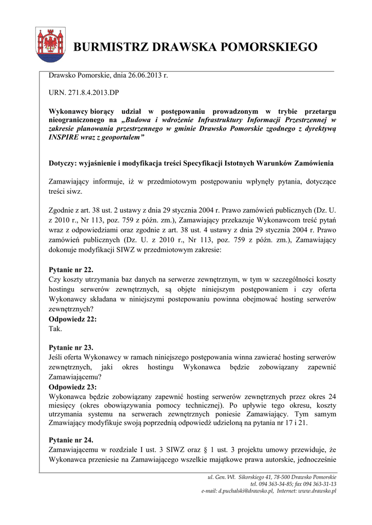 BURMISTRZ DRAWSKA POMORSKIEGO Drawsko Pomorskie, dnia 26.06.2013 r. URN. 271.8.4.2013.DP Wykonawcy biorący udział w postępowaniu prowadzonym w trybie przetargu nieograniczonego na „Budowa i wdrożenie Infrastruktury Informacji Przestrzennej w zakresie planowania przestrzennego w gminie Drawsko Pomorskie zgodnego z dyrektywą INSPIRE wraz z geoportalem” Dotyczy: wyjaśnienie i modyfikacja treści Specyfikacji Istotnych Warunków Zamówienia Zamawiający informuje, iż w przedmiotowym postępowaniu wpłynęły pytania, dotyczące treści siwz. Zgodnie z art. 38 ust. 2 ustawy z dnia 29 stycznia 2004 r. Prawo zamówień publicznych (Dz. U. z 2010 r., Nr 113, poz. 759 z późn. zm.), Zamawiający przekazuje Wykonawcom treść pytań wraz z odpowiedziami oraz zgodnie z art. 38 ust. 4 ustawy z dnia 29 stycznia 2004 r. Prawo zamówień publicznych (Dz. U. z 2010 r., Nr 113, poz. 759 z późn. zm.), Zamawiający dokonuje modyfikacji SIWZ w przedmiotowym zakresie: Pytanie nr 22. Czy koszty utrzymania baz danych na serwerze zewnętrznym, w tym w szczególności koszty hostingu serwerów zewnętrznych, są objęte niniejszym postępowaniem i czy oferta Wykonawcy składana w niniejszymi postepowaniu powinna obejmować hosting serwerów zewnętrznych? Odpowiedz 22: Tak. Pytanie nr 23. Jeśli oferta Wykonawcy w ramach niniejszego postępowania winna zawierać hosting serwerów zewnętrznych, jaki okres hostingu Wykonawca będzie zobowiązany zapewnić Zamawiającemu? Odpowiedz 23: Wykonawca będzie zobowiązany zapewnić hosting serwerów zewnętrznych przez okres 24 miesięcy (okres obowiązywania pomocy technicznej). Po upływie tego okresu, koszty utrzymania systemu na serwerach zewnętrznych poniesie Zamawiający. Tym samym Zmawiający modyfikuje swoją poprzednią odpowiedź udzieloną na pytania nr 17 i 21. Pytanie nr 24. Zamawiającemu w rozdziale I ust. 3 SIWZ oraz § 1 ust. 3 projektu umowy przewiduje, że Wykonawca przeniesie na Zamawiającego wszelkie majątkowe prawa autorskie, jednocześnie ul. Gen. Wł. Sikorskiego 41, 78-500 Drawsko Pomorskie tel. 094 363-34-85; fax 094 363-31-13 e-mail: [email protected], Internet: www.drawsko.pl w rozdziale I ust. 4 SIWZ oraz § 1 usdt. 4 projektu umowy dopuszczając udzielenie licencji na korzystanie z Infrastruktury Informacji Przestrzennej będącej przedmiotem niniejszego postepowania. Wskazane powyżej postanowienia są sprzeczne – skoro na część przedmiotu umowy możliwe jest udzielenie licencji, to nie jest konieczne przeniesienie na Zmawiającego wszelkich majątkowych praw autorskich, lecz to przeniesienie może nastąpić z zastrzeżeniem treści rozdziału I ust. 4 umowy i z zastrzeżeniem §1 ust. 4 projektu umowy, które dopuszczają udzielenie licencji. Odpowiedz 24: Zamawiający dopuszcza zarówno rozwiązane polegające na stworzeniu własnego systemu (oprogramowania), jak też opcję oprogramowania gotowego dostarczanego wraz z umową licencyjną producenta oprogramowania. Wybór zależy od Wykonawcy. Umowa zostanie dopasowana do opcji zaproponowanej przez Wykonawcę. Pytanie nr 25. Skoro Zamawiający dopuszcza udzielenia licencji na korzystanie z Infrastruktury Informacji Przestrzennej będącej przedmiotem niniejszego postępowania wnoszę o wyjaśnienie, do jakiego przedmiotu umowy konieczne będzie przeniesienie autorskich praw majątkowych? Odpowiedz 25: Przeniesienie praw autorskich będzie konieczne w przypadku stworzenia oprogramowania przez Wykonawcę. W przypadku dostarczenia gotowego oprogramowania z licencją obsługującego system zapis o prawach autorskich nie ma zastosowania. Pytanie nr 26. Z czego może wynikać konieczność uzupełnienia lub poprawienia przez Wykonawcę opracowań dostarczanych na potrzeby wykonania niniejszej umowy przez zamawiającego, oraz jaki może być zakres uzupełnień lub poprawek? Wnoszę o doprecyzowania przedmiotu umowy w przedmiotowym zakresie, w szczególności mając na uwadze, iż wskazane czynności Wykonawca zobowiązany jest wykonać bez odrębnego wynagrodzenia, a więc doprecyzowanie przedmiotu umowy w tym zakresie jest kluczowe dla sporządzenia prawidłowo skalkulowanej oferty w niniejszym postępowaniu. Odpowiedz 26: Uzupełnienie i poprawianie będzie dotyczyło błędnie zaimportowanych danych w przypadku stwierdzenia tej niezgodności w opracowaniach będących przedmiotem zamówienia. Dotyczy to tylko opracowań objętych przedmiotem zamówienia. Uzupełnienie i poprawienie opracowań dotyczy okresu gwarancji. Pytanie nr 27. W odniesieniu do udzielonej odpowiedzi nr. 21: Utrzymanie systemu na serwerze wiąże się z określonymi kosztami (energia, łącze, amortyzacja sprzętu). W związku z tym niemożliwe jest realne obliczenie kosztów w celu przygotowania oferty. Zwracam się ponownie o określenie w jakim okresie ma być utrzymany system oraz zamieszczenie odpowiedniego zapisu we wzorze umowy. Odpowiedź nr 27. ul. Gen. Wł. Sikorskiego 41, 78-500 Drawsko Pomorskie tel. 094 363-34-85; fax 094 363-31-13 e-mail: [email protected], Internet: www.drawsko.pl Odpowiedzi udzielono w odpowiedzi na pytanie nr 2. Wykonawca będzie zobowiązany zapewnić hosting serwerów zewnętrznych przez okres 24 miesięcy (okres obowiązywania pomocy technicznej). Po upływie tego okresu, koszty utrzymania systemu na serwerach zewnętrznych poniesie Zamawiający. Tym samym Zmawiający modyfikuje swoją poprzednią odpowiedź udzieloną na pytania nr 17 i 21. Pytanie 28: W jakim formacie znajdują się arkusze map, które wymagają skanowania? Odpowiedź 28. Arkusze map znajdują się w różnych formatach. Największymi arkuszami są arkusze A0 i większe. Pytanie nr 29. Jak Zamawiający rozumie „pomoc w pozyskaniu i przetworzeniu danych miejscowych zmian mpzp oraz studium, które są obecnie sporządzane i w przyszłości wejdą w życie”? Odpowiedź nr 29. Zamawiający wymaga w tym punkcie wektoryzacji zmian miejscowych planów wraz z ich importem do systemu. Pytanie nr 30