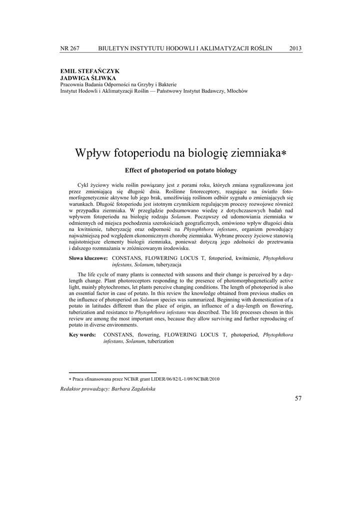 NR 267 BIULETYN INSTYTUTU HODOWLI I AKLIMATYZACJI ROŚLIN 2013 EMIL STEFAŃCZYK JADWIGA ŚLIWKA Pracownia Badania Odporności na Grzyby i Bakterie Instytut Hodowli i Aklimatyzacji Roślin — Państwowy Instytut Badawczy, Młochów Wpływ fotoperiodu na biologię ziemniaka∗ Effect of photoperiod on potato biology Cykl życiowy wielu roślin powiązany jest z porami roku, których zmiana sygnalizowana jest przez zmieniającą się długość dnia. Roślinne fotoreceptory, reagujące na światło fotomorfogenetycznie aktywne lub jego brak, umożliwiają roślinom odbiór sygnału o zmieniających się warunkach. Długość fotoperiodu jest istotnym czynnikiem regulującym procesy rozwojowe również w przypadku ziemniaka. W przeglądzie podsumowano wiedzę z dotychczasowych badań nad wpływem fotoperiodu na biologię rodzaju Solanum. Począwszy od udomowiania ziemniaka w odmiennych od miejsca pochodzenia szerokościach geograficznych, omówiono wpływ długości dnia na kwitnienie, tuberyzację oraz odporność na Phytophthora infestans, organizm powodujący najważniejszą pod względem ekonomicznym chorobę ziemniaka. Wybrane procesy życiowe stanowią najistotniejsze elementy biologii ziemniaka, ponieważ dotyczą jego zdolności do przetrwania i dalszego rozmnażania w zróżnicowanym środowisku. Słowa kluczowe: CONSTANS, FLOWERING LOCUS T, fotoperiod, kwitnienie, Phytophthora infestans, Solanum, tuberyzacja The life cycle of many plants is connected with seasons and their change is perceived by a daylength change. Plant photoreceptors responding to the presence of photomorphogenetically active light, mainly phytochromes, let plants perceive changing conditions. The length of photoperiod is also an essential factor in case of potato. In this review the knowledge obtained from previous studies on the influence of photoperiod on Solanum species was summarized. Beginning with domestication of a potato in latitudes different than the place of origin, an influence of a day-length on flowering, tuberization and resistance to Phytophthora infestans was described. The life processes chosen in this review are among the most important ones, because they allow surviving and further reproducing of potato in diverse environments. Key words: CONSTANS, flowering, FLOWERING LOCUS T, photoperiod, Phytophthora infestans, Solanum, tuberization ∗ Praca sfinansowana przez NCBiR grant LIDER/06/82/L-1/09/NCBiR/2010 Redaktor prowadzący: Barbara Zagdańska 57 Emil Stefańczyk ... WSTĘP Ziemniak wywodzi się z górzystych terenów Ameryki Południowej, gdzie udomowiony został około 7000 lat temu (Hawkes, 1990). Przodkami obecnie uprawianego Solanum tuberosum subsp. tuberosum są dzikie gatunki ziemniaka występujące w pasmie Andów — od zachodniej Wenezueli po północną Argentynę oraz południową część Chile. Gatunki te zróżnicowane są pod względem morfologii i poziomu ploidalności — od diploidalnych po heksaploidalne. Badania polimorfizmu długości powielonych fragmentów DNA (AFLP) opublikowane w 2005 roku przez Spoonera i współpracowników wykazały, że wszystkie gatunki ziemniaka mają wspólnego przodka w kompleksie Solanum brevicaule, na który składa się około dwudziestu, morfologicznie podobnych, dzikich taksonów. Z kolei Hawkes (1990), na podstawie badań molekularnych i morfologicznych, przytacza cztery dzikie gatunki (S. acaule, S. sparsipilum, S. leptophyes oraz S. megistacrolobum) jako przodków uprawianych dziś gatunków. Ze względu na wysoką wartość odżywczą bulw, a także wysokie plony i możliwość uprawy w większości rejonów świata, ziemniak stał się jedną z najważniejszych roślin uprawnych na świecie. Ponieważ bulwy ziemniaka są częścią użytkową tej rośliny oraz są stosowane jako materiał siewny, procesy związane z ich zawiązywaniem, przechowywaniem oraz kiełkowaniem były dokładnie studiowane. Szczególnie tworzenie bulw, czyli tuberyzacja, podlega silnemu wpływowi fotoperiodu, co zostanie omówione w dalszej części artykułu. Ponadto zostanie omówiony mechanizm odbierania sygnału długości dnia, jego dalsze przesyłanie w postaci sygnału indukcji kwitnienia i tuberyzacji, a także wpływ fotoperiodu na odporność na Phytophthora infestans. Związek pomiędzy odpornością na tego patogena, a przystosowaniem do tworzenia bulw w warunkach dnia długiego, choć intensywnie badany, pozostaje wciąż niewyjaśniony i utrudnia hodowcom uzyskanie wczesnych i odpornych odmian ziemniaka. Celem artykułu było zestawienie najnowszych wyników badań w tej dziedzinie, uzyskanych w różnych ośrodkach badawczych. RÓWNIKOWE POCHODZENIE ZIEMNIAKA Pierwotnie ziemniak został wprowadzony do uprawy w pobliżu równika na dużych wysokościach, gdzie długość dnia wynosi 12 godzin, a temperatury w nocy są niskie. Andyjskie formy ziemniaka (S. tuberosum subsp. andigena), przystosowane do tych warunków, w wyższych temperaturach na terenach nizinnych, czy też w czasie długich, letnich dni klimatu umiarkowanego, tuberyzują słabo lub wcale. Trwająca kilka stuleci selekcja osobników podgatunku andigena przystosowanych do warunków panujących na nizinach południowego Chile i, później, w północnej Europie, zakończyła się pod koniec XVIII wieku i umożliwiła dalszą propagację nowego podgatunku ziemniaka (S. tuberosum subsp. tuberosum) we wschodniej i centralnej Europie (Hawkes, 1990). Warunki dnia krótkiego (SD — short day; 8–10 h światła) indukują formowanie bulw we wszystkich genotypach ziemniaka, choć istnieją znaczne różnice w stopniu, w jakim sygnał ten wymagany jest do indukcji (Snyder i Ewing, 1989). Niektóre gatunki 58 Emil Stefańczyk ... ziemniaka (S. tuberosum subsp. andigena, czy S. demissum) wytwarzają bulwy wyłącznie w czasie dnia krótkiego, podczas gdy w warunkach dnia długiego (LD — long day; 16 h światła) oraz dnia krótkiego z impulsem światła w okresie nocnym (NB — night b